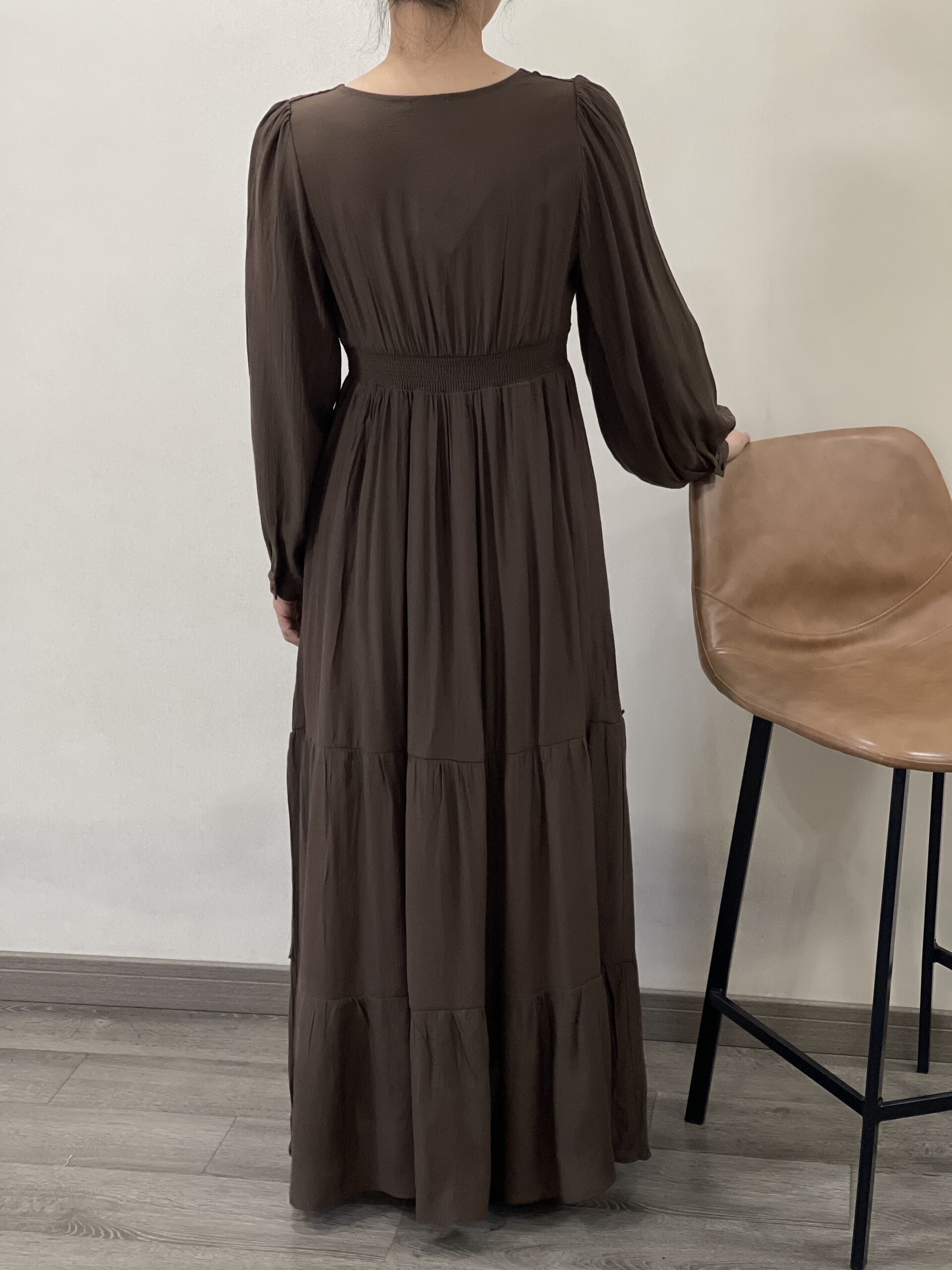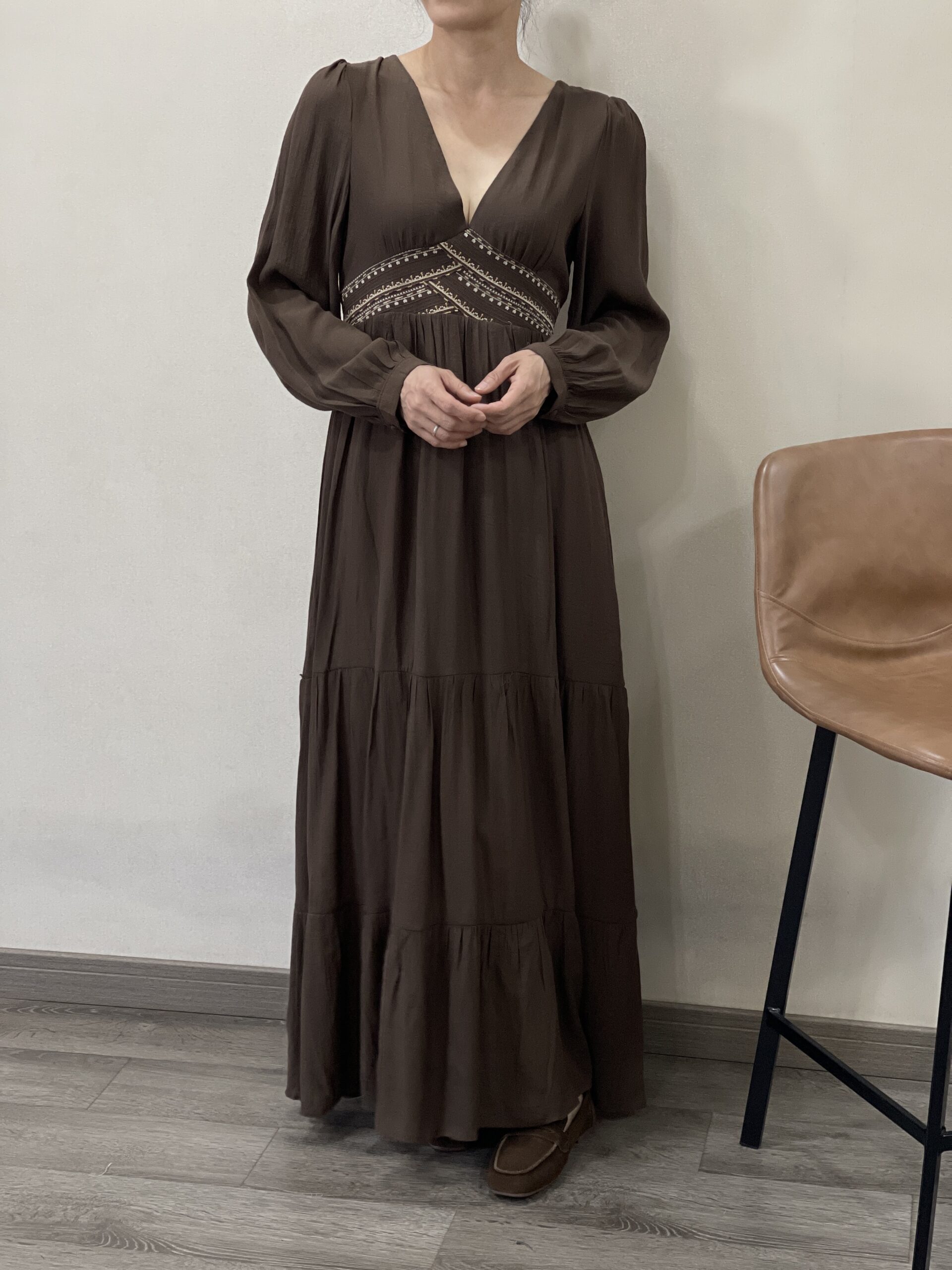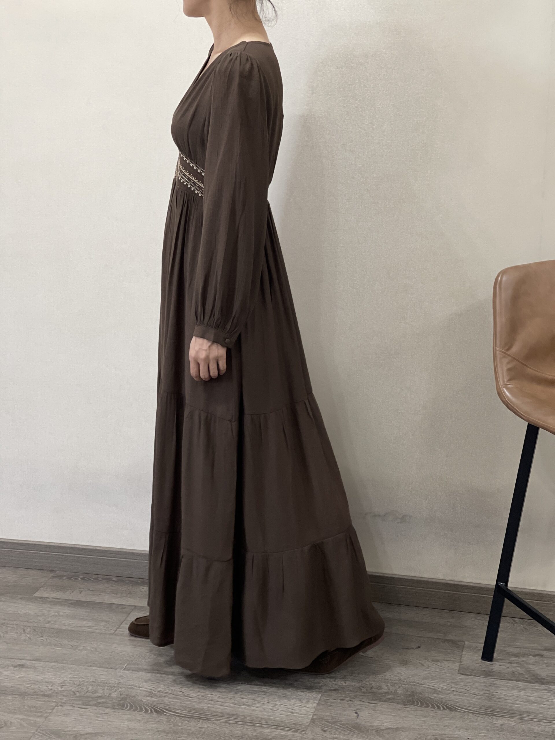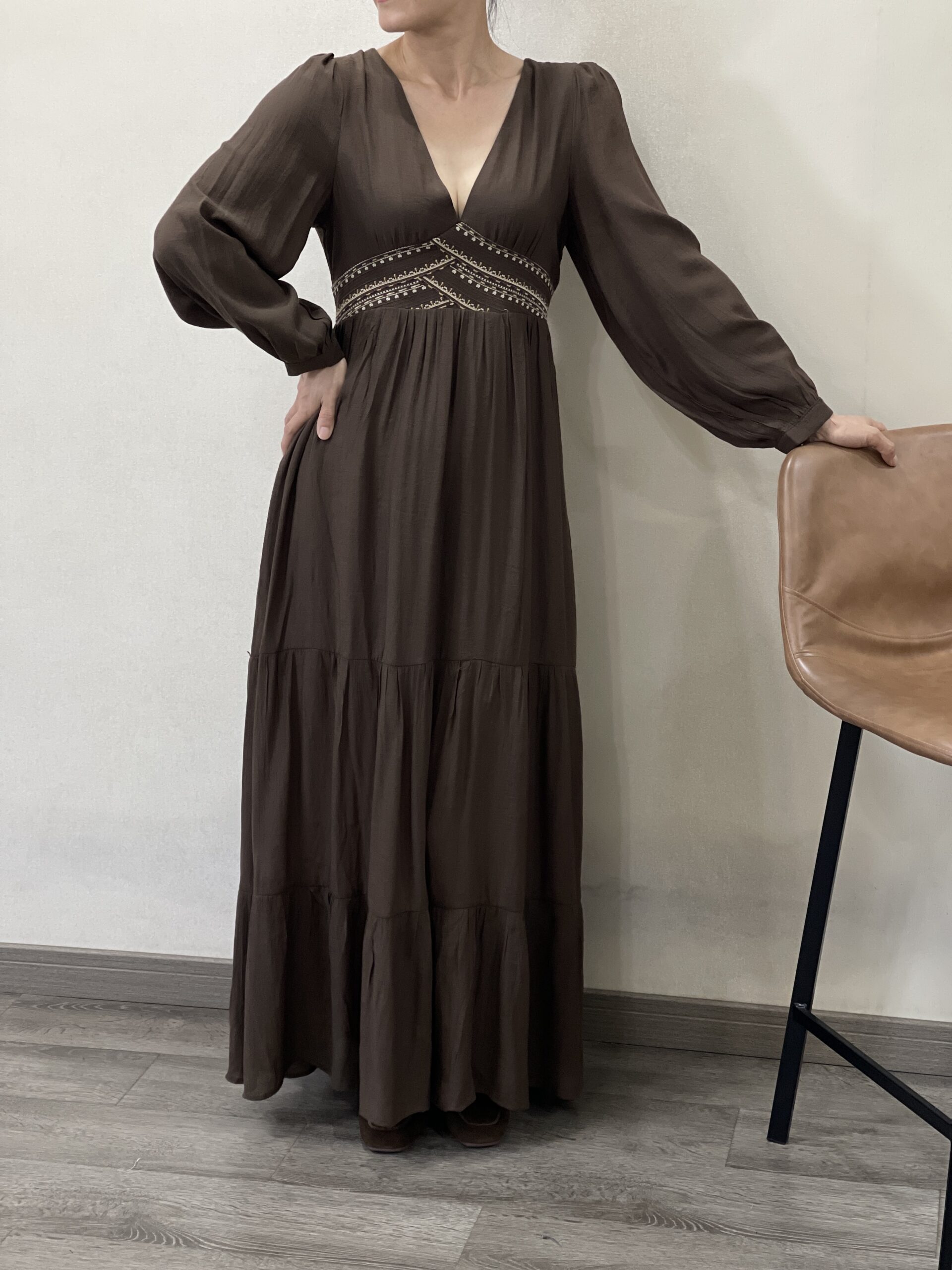 Vestido marrón largo con mangas con puño de cuello en pico y dibujos tribales en la cintura. Tiene forro interior hasta la rodilla.