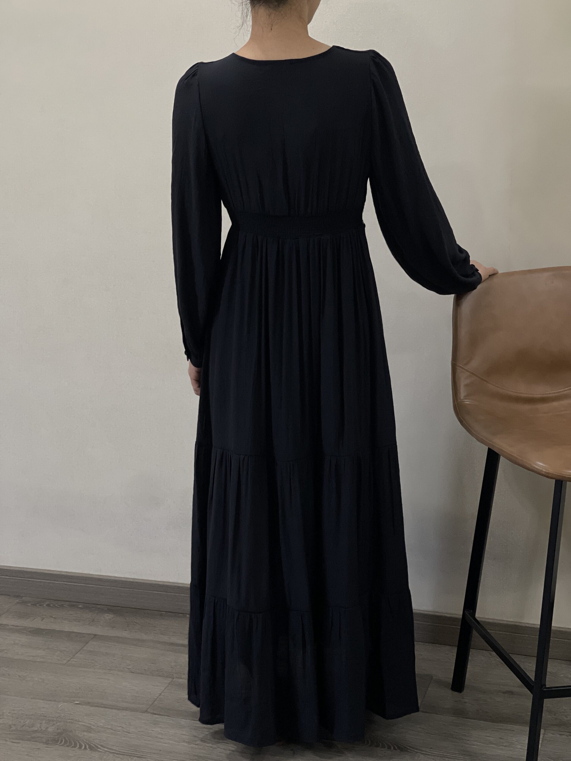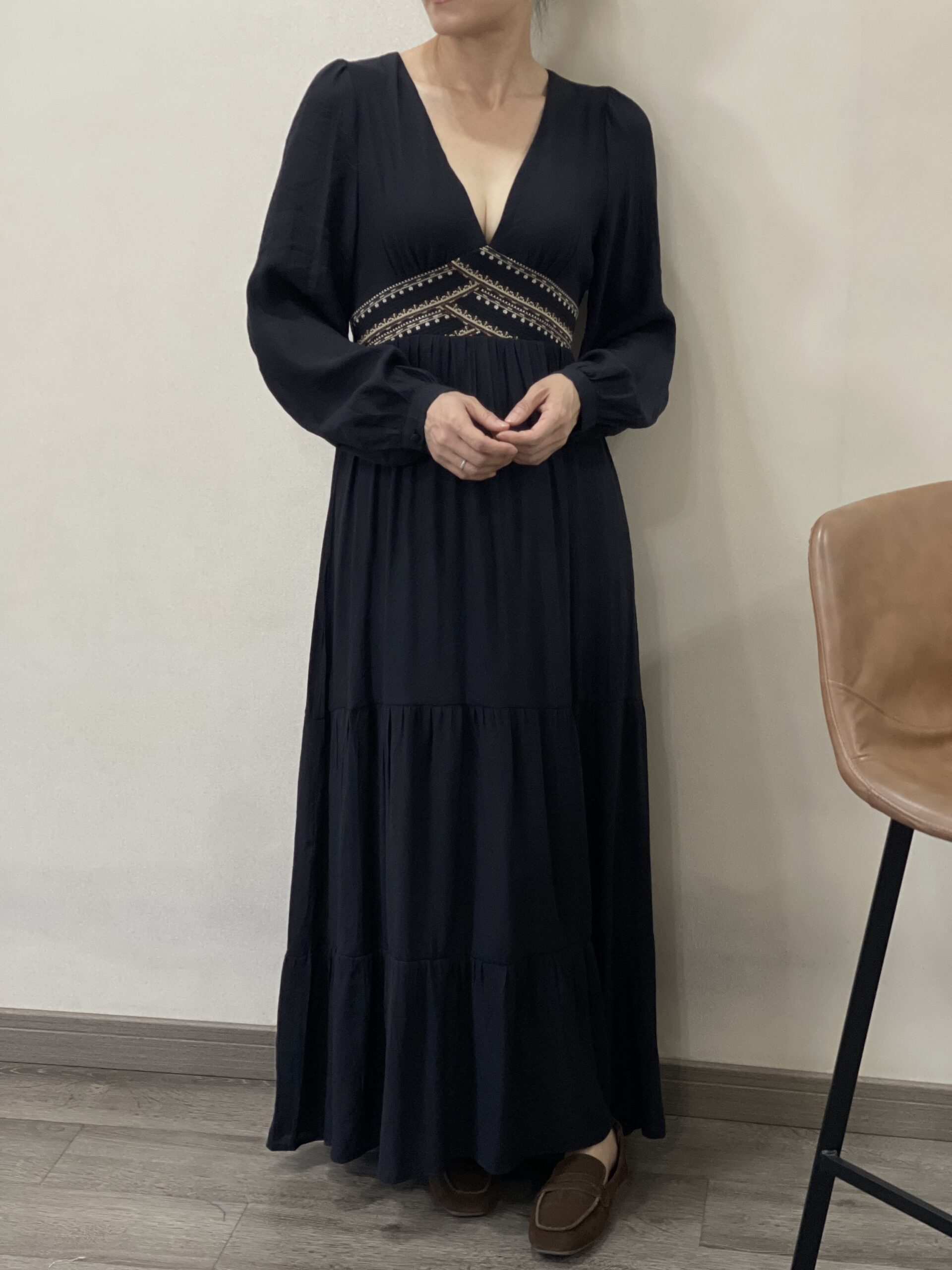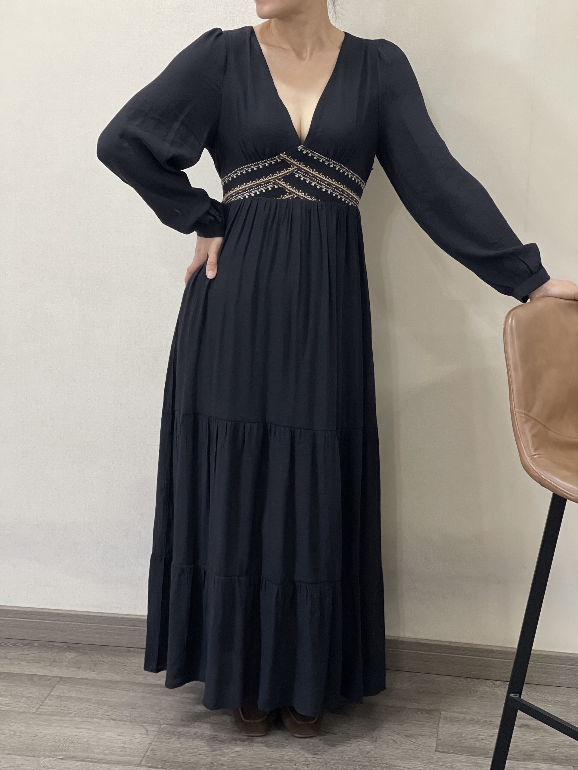 Vestido negro largo con mangas con puño de cuello en pico y dibujos tribales en la cintura. Tiene forro interior hasta la rodilla.