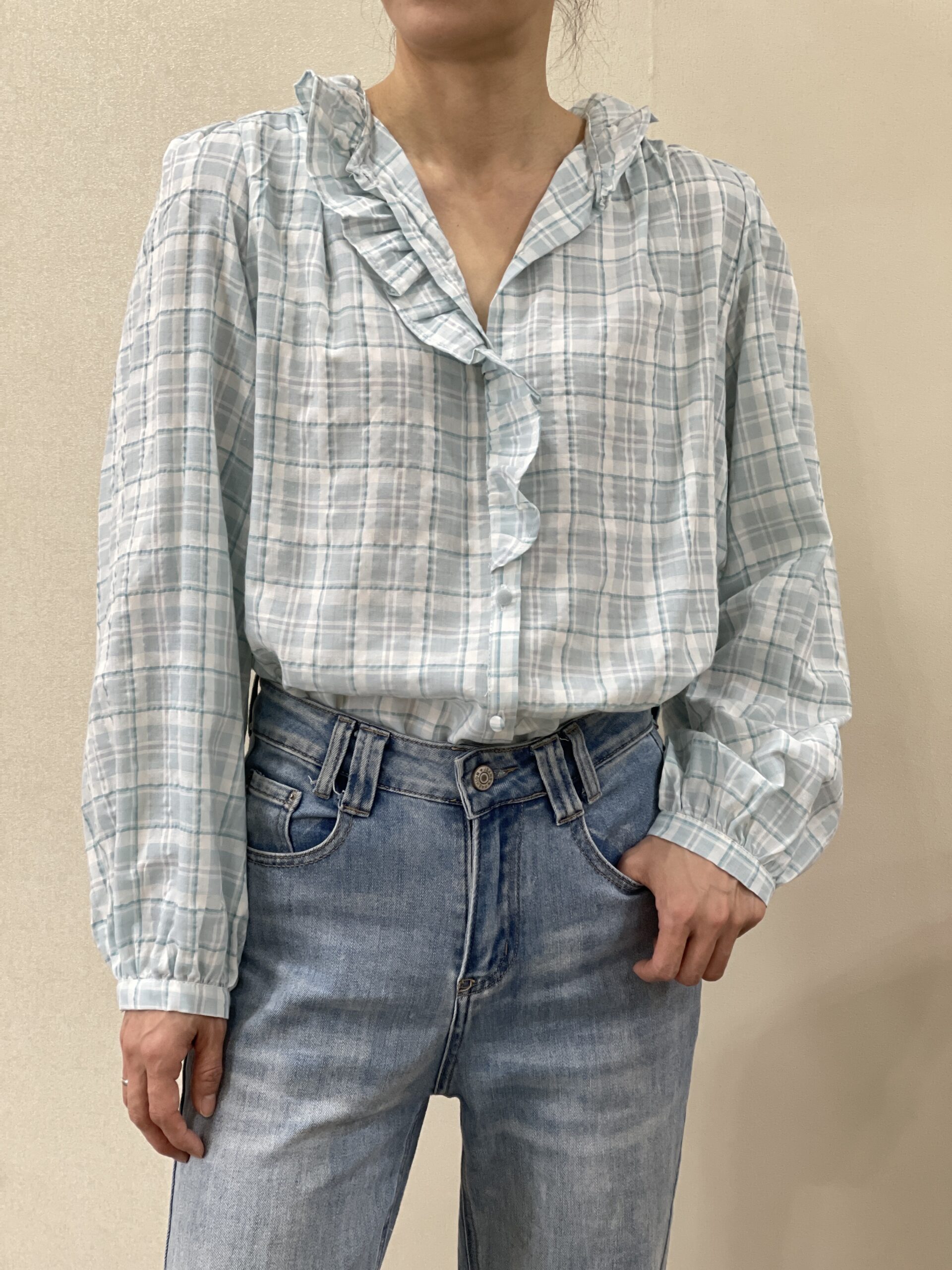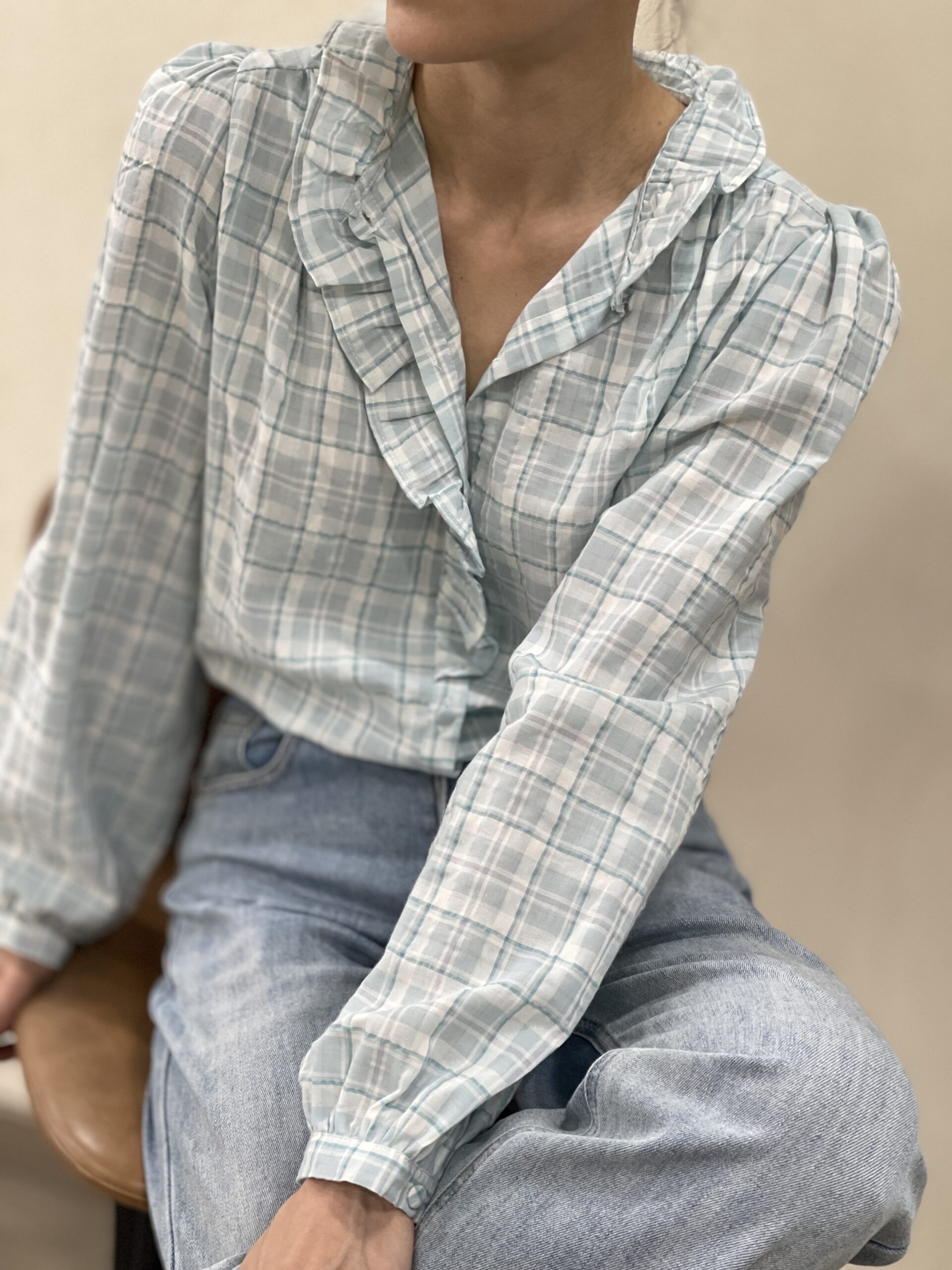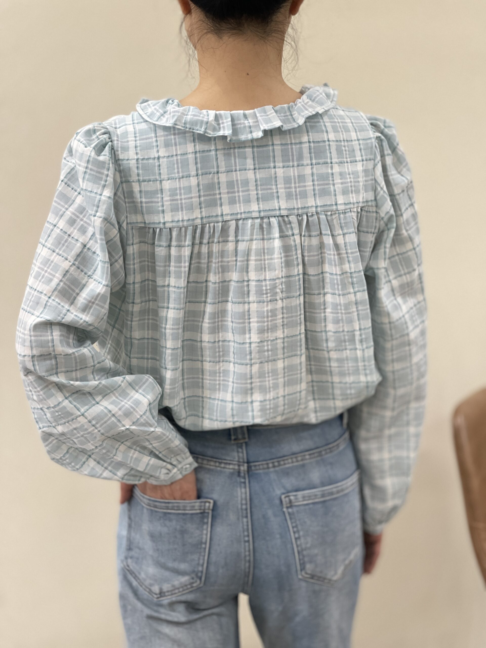Blusa a cuadros aguamarina Mavis con chorreras en cuello y hasta la cintura, hombros fruncidos y botones forrados en la misma tela en puño y botonadura. Detalle fruncido en la espalda de hombro a hombro.