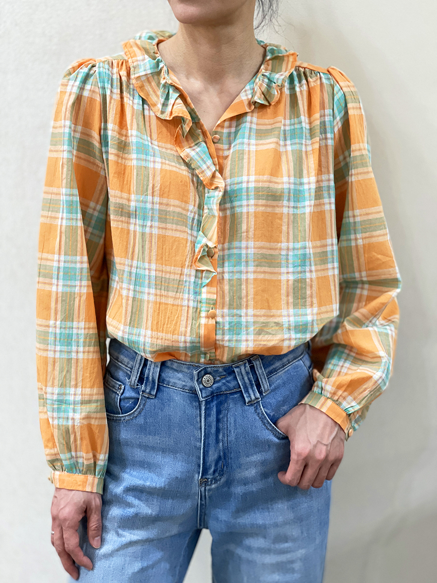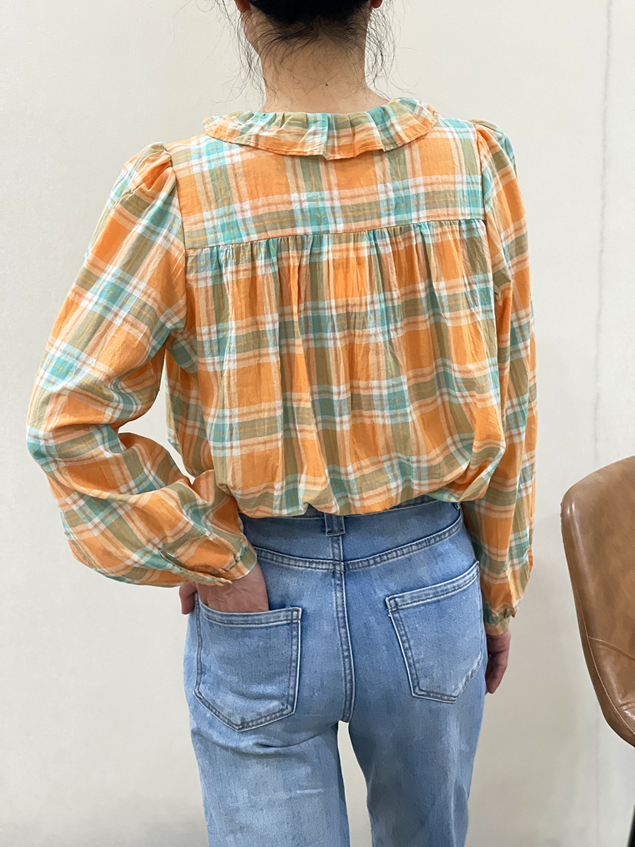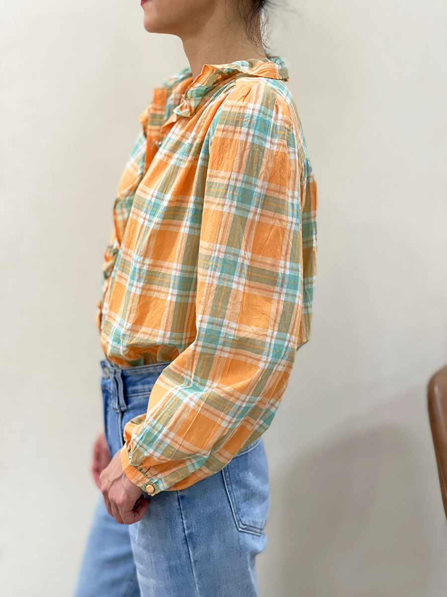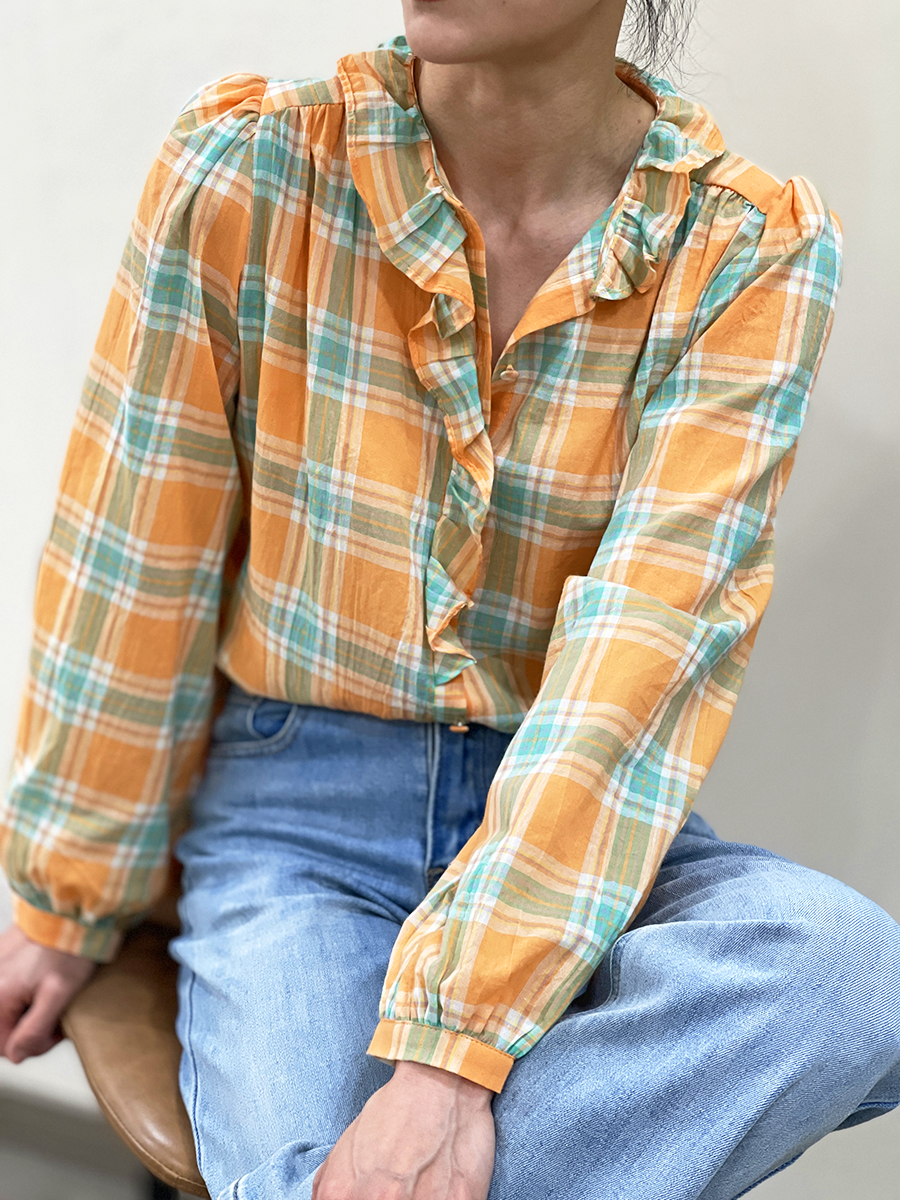 Blusa a cuadros naranja Mavis con chorreras en cuello y hasta la cintura, hombros fruncidos y botones forrados en la misma tela en puño y botonadura. Detalle fruncido en la espalda de hombro a hombro. Composición: 100% algodón.