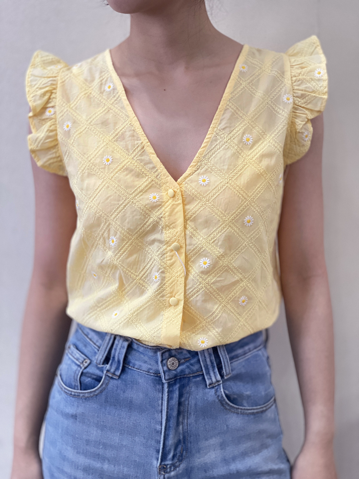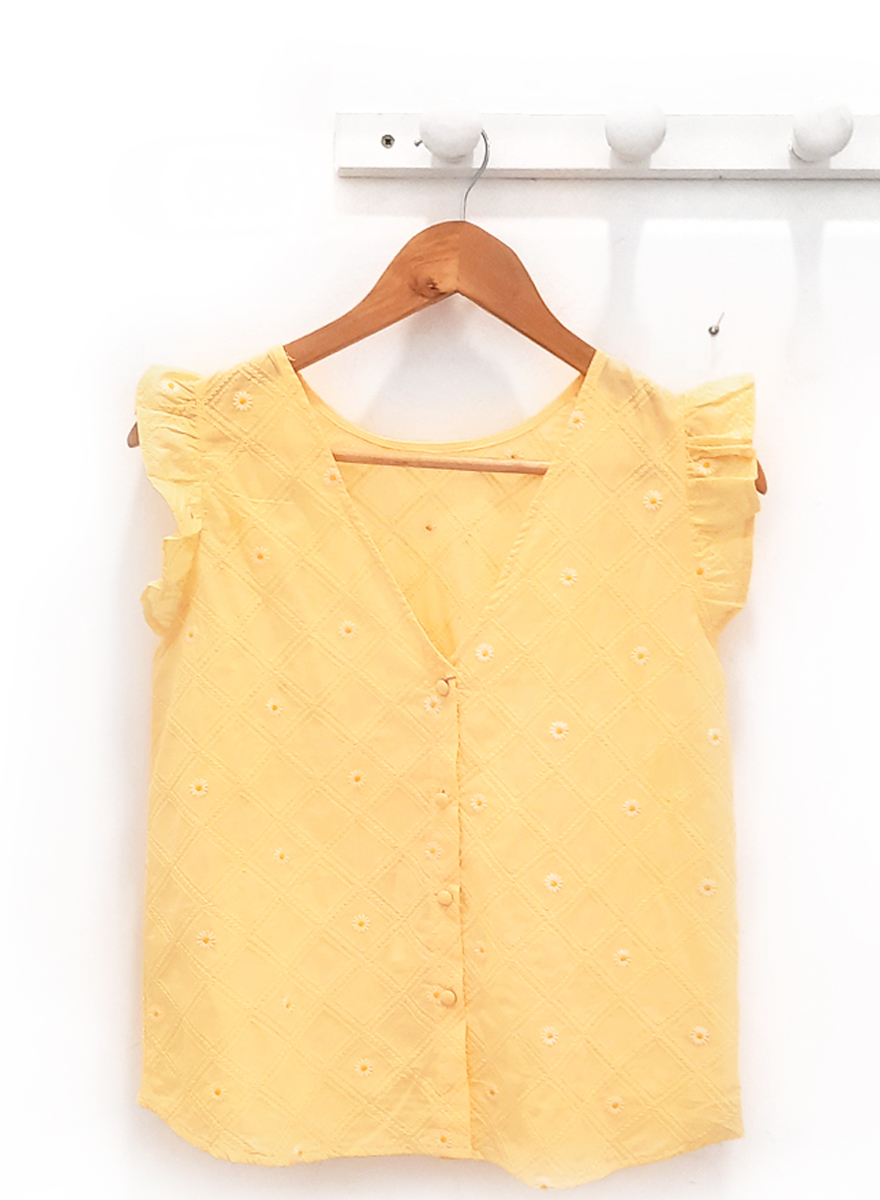 Blusa amarilla Yanina de cuello en pico, tela con bordado de rombos y pequeñas flores blancas, botones forrados en la misma tela y volante sobre los hombros. Composición: 100% algodón.