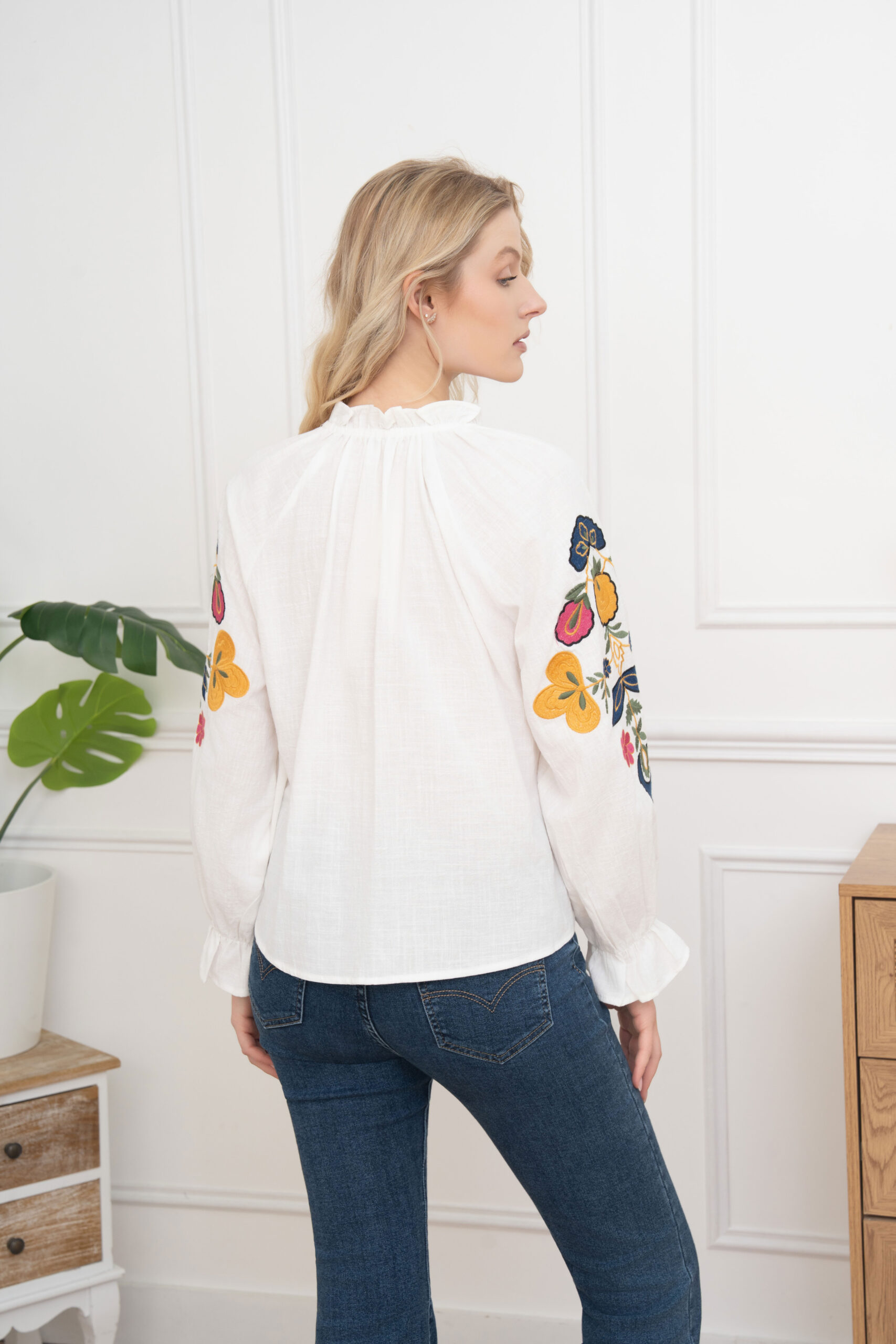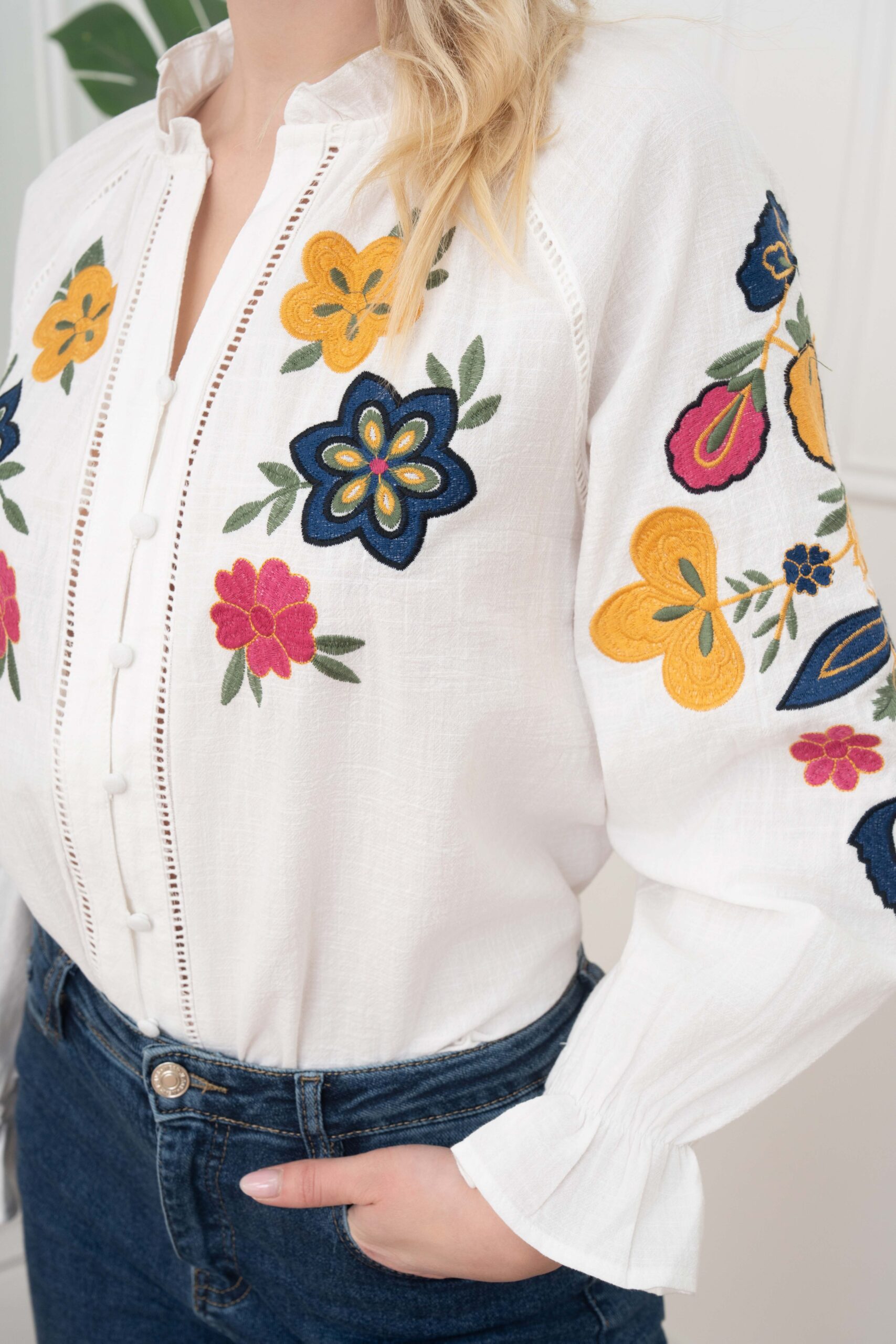 Blusa blanca bordada Jane de manga larga con escote en pico, abotonada hasta abajo, botones forrados en la misma tela que se cierran con aplique de goma, bordado delantero en rosa, amarillo, azul, negro y verde. Fruncido en el cuello y puños. Composición: 100% algodón.