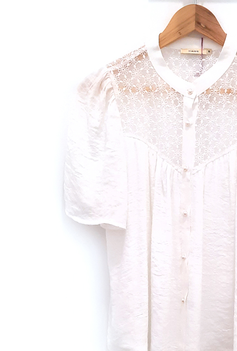 Blusa blanca Lisa de cuello redondo, botonadura nacarada hasta abajo, pecho calado en pico con motivos florales y manga corta ancha.