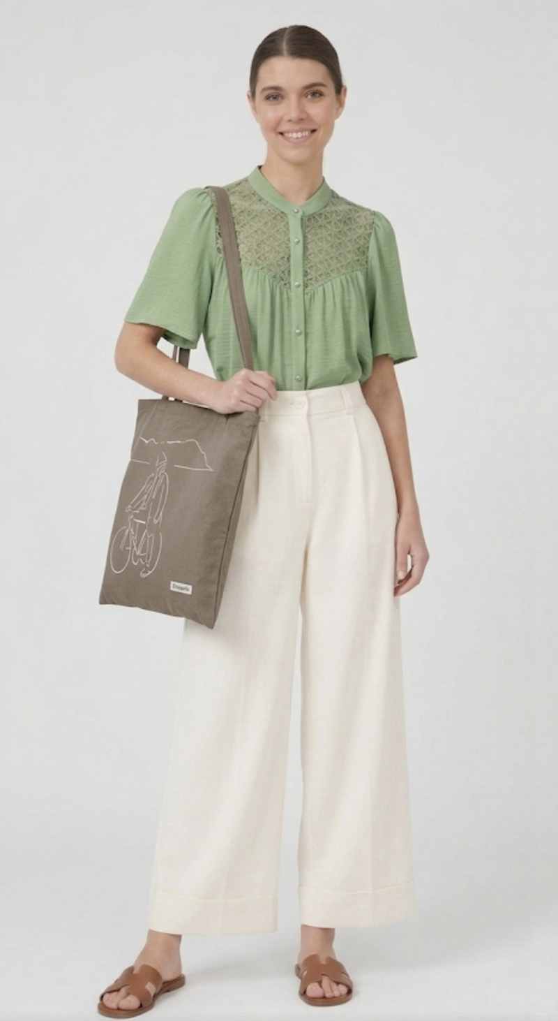 Blusa verde Lisa de cuello redondo, botonadura en nacarado verde hasta abajo, pecho calado en pico con motivos florales y manga corta ancha. Composición: 55% poliester y 45% viscosa.