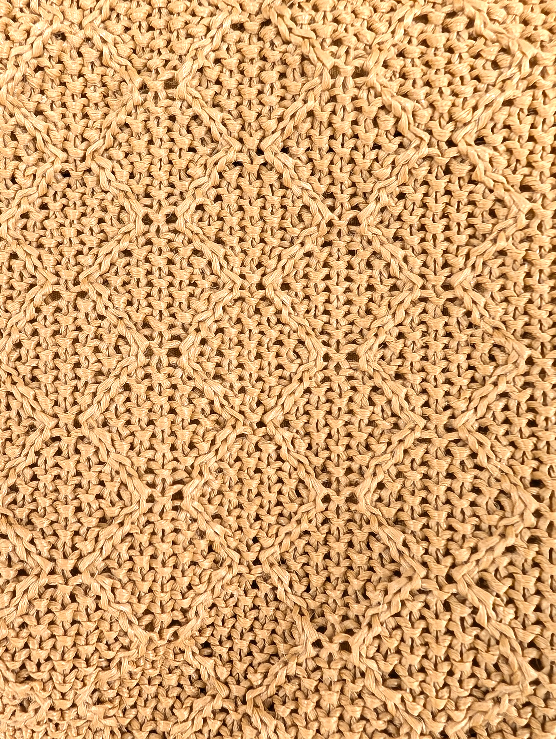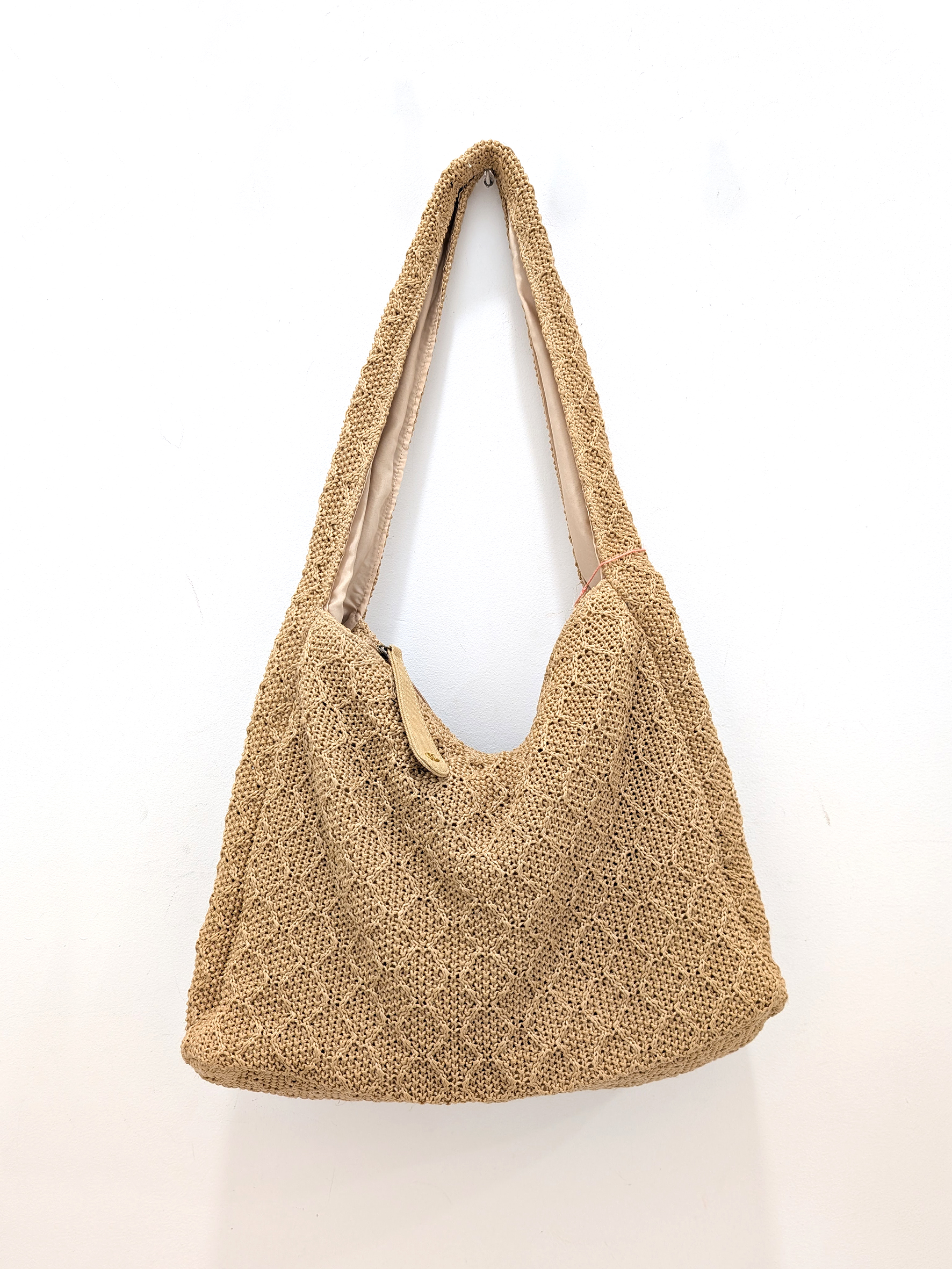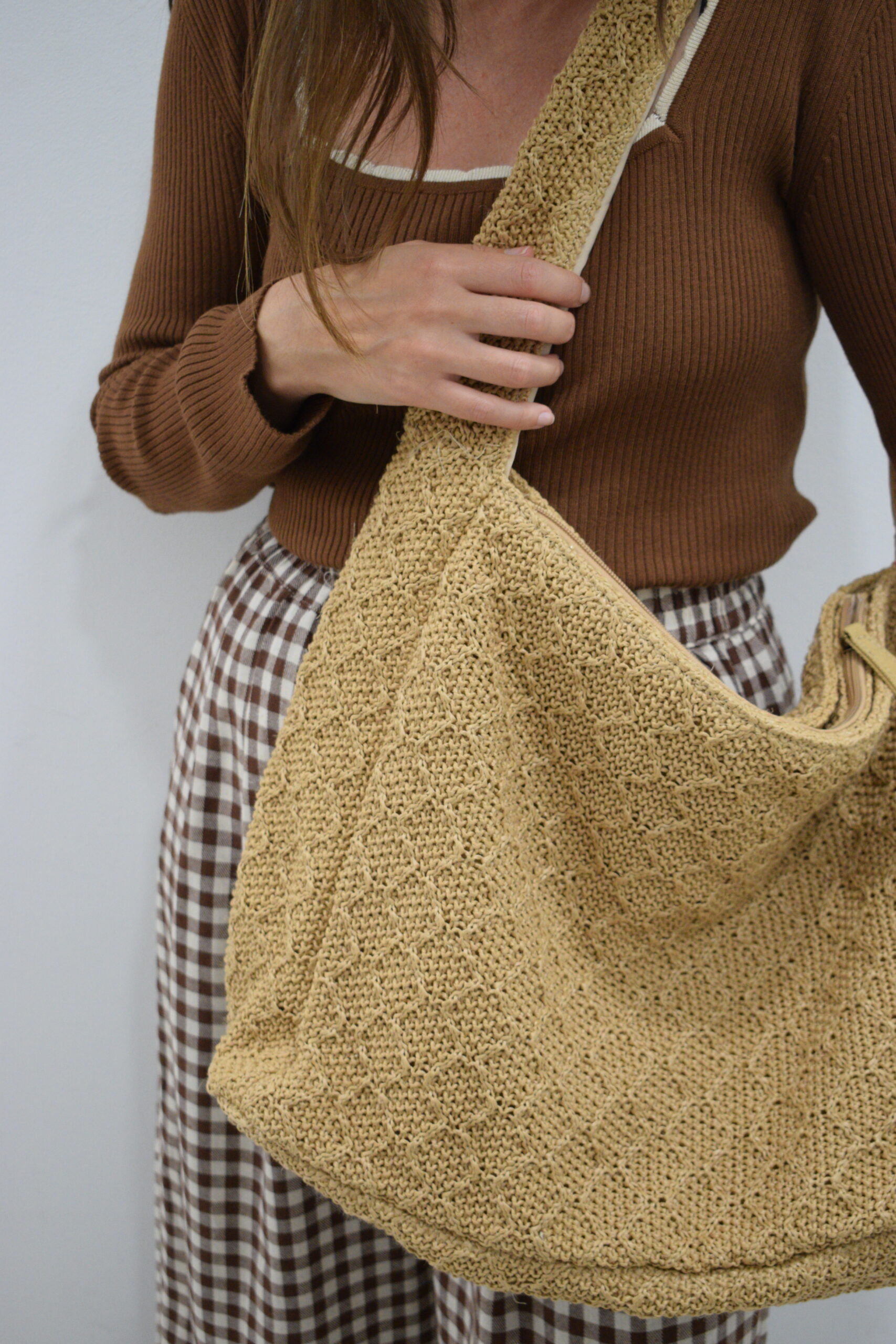 Bolso marrón con asa de tamaño extra grande. Hecho a modo de ganchillo con cremallera. Forro interior con dos bolsillos y un tercero con cirre de cremallera.