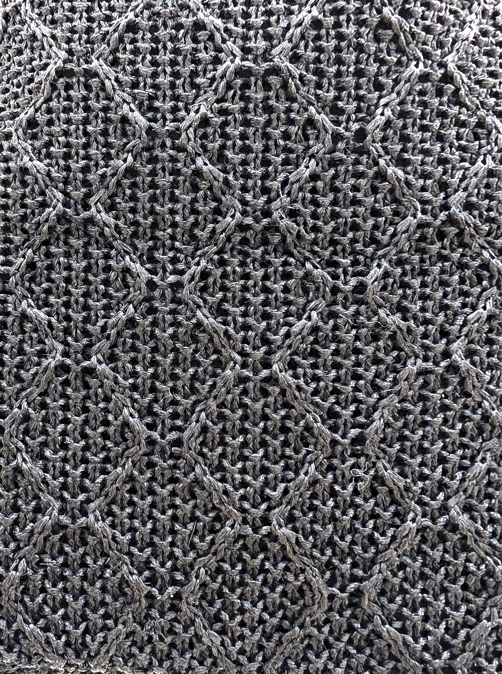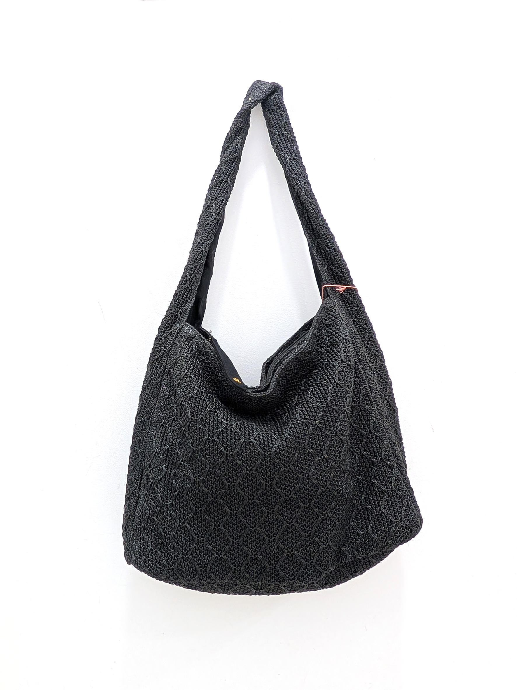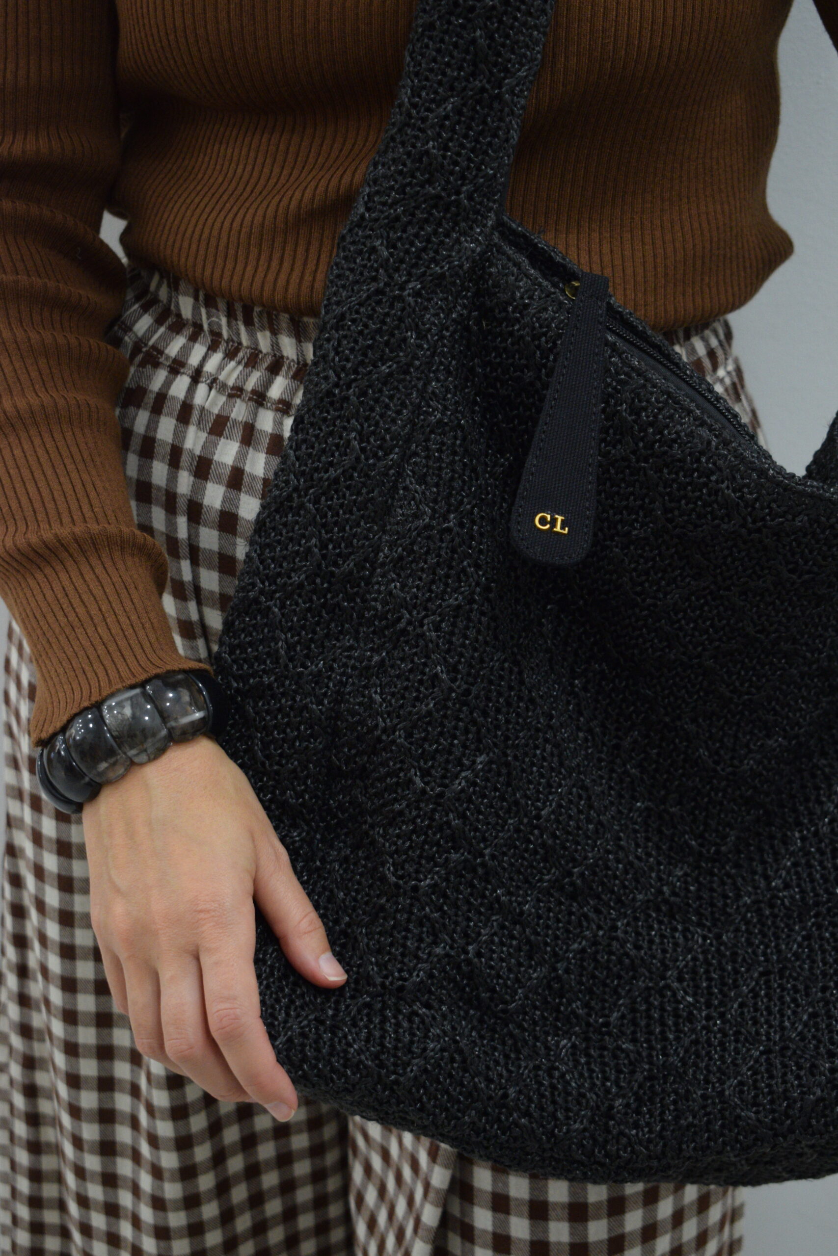 Bolso negro con asa de tamaño extra grande. Hecho a modo de ganchillo con cremallera. Forro interior con dos bolsillos y un tercero con cirre de cremallera.