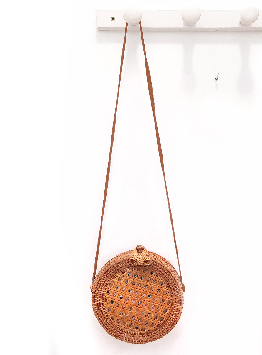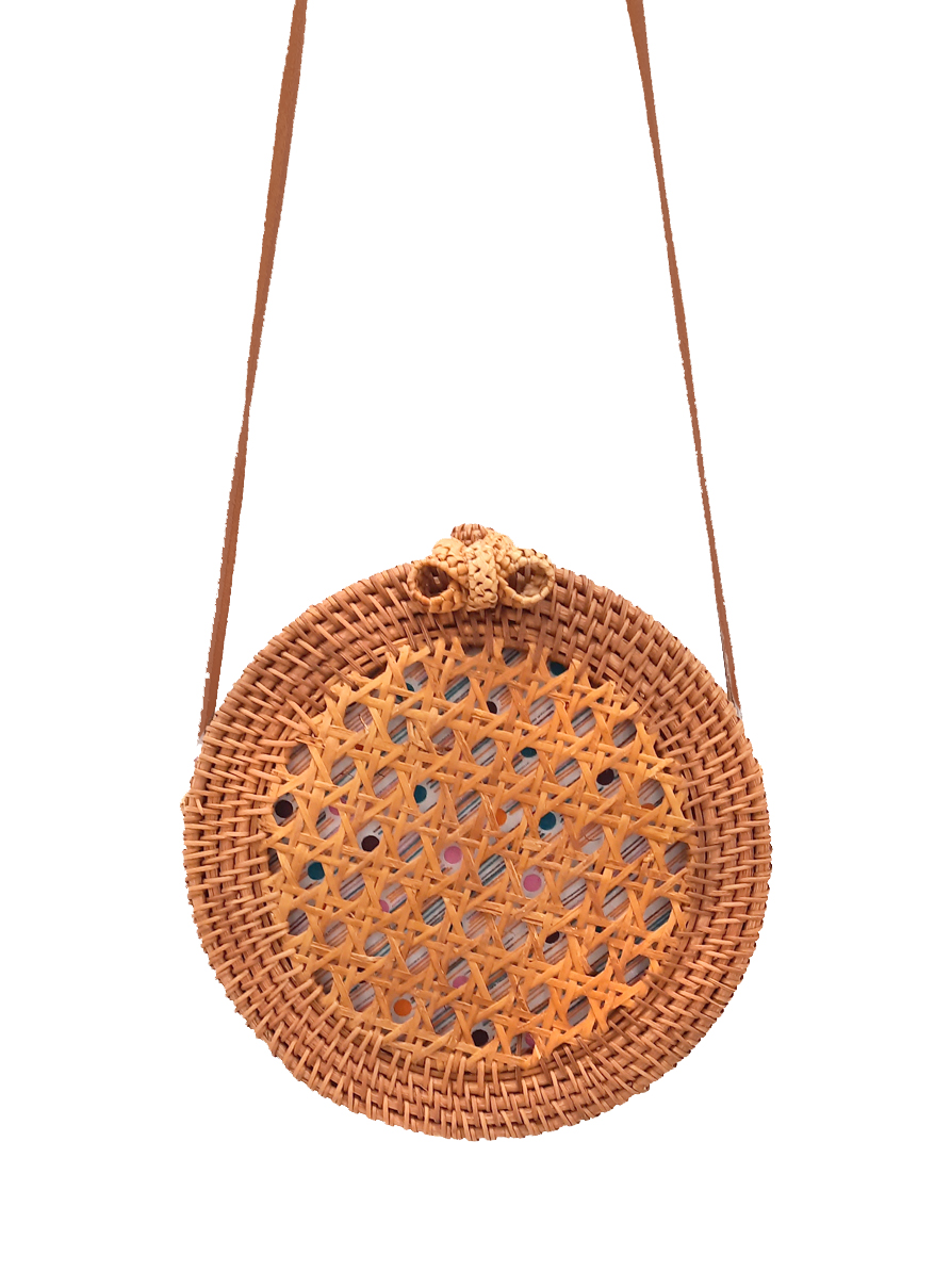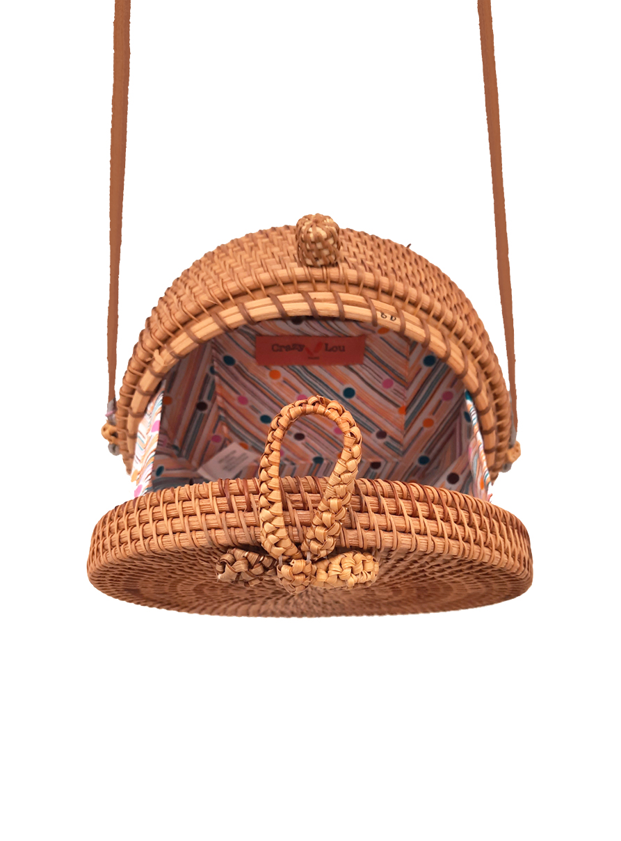 Bolso redondo Gurpila de mimbre con asa de hombro color marrón. interior forrado en tela de colores, con un pequeño bolsillo. Diámetro: 21 cm. Fondo: 8cm.