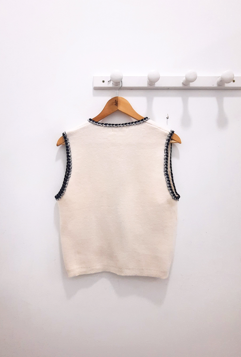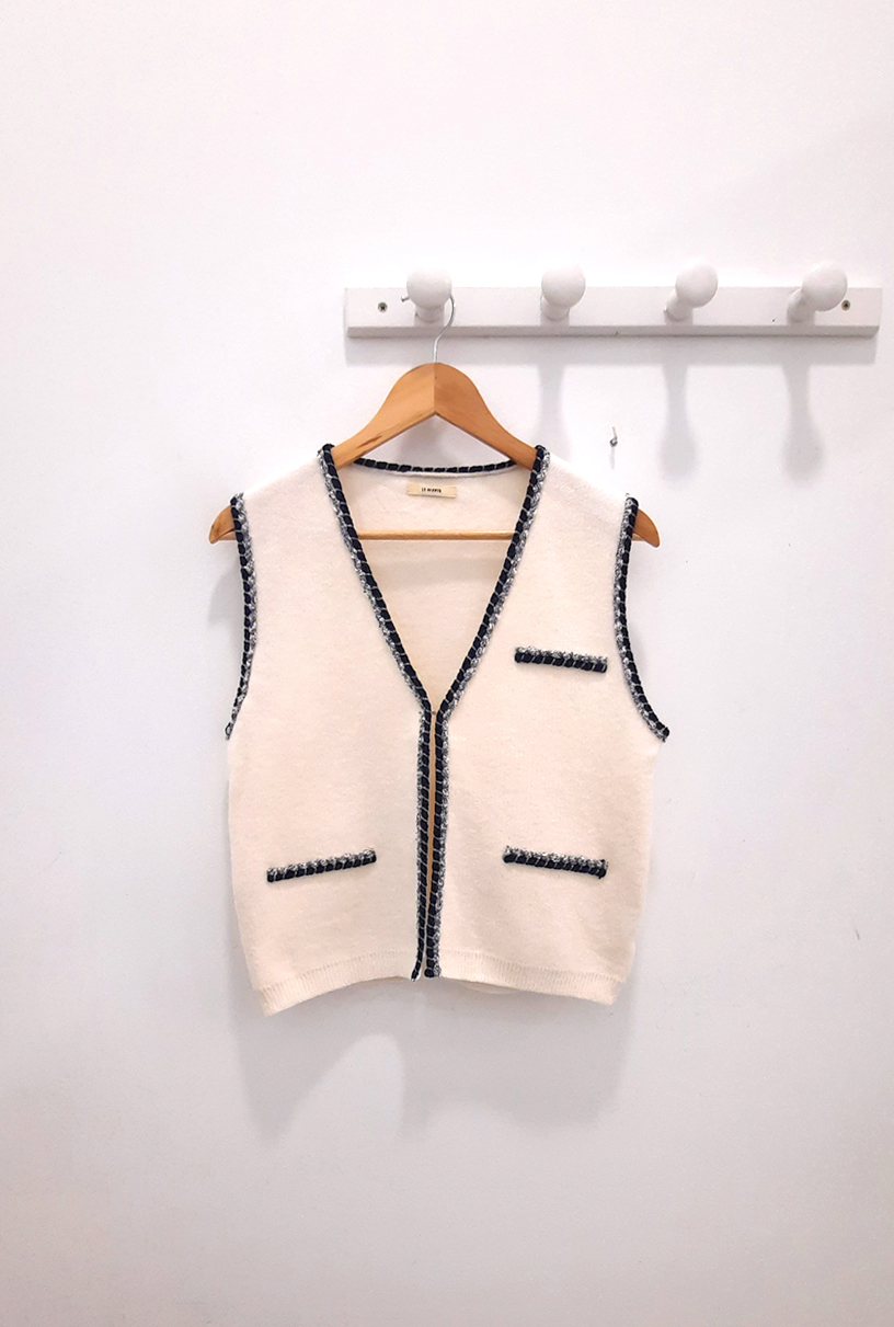 Chaleco crudo de punto Zack con ribete azul marino e hilo plateado a lo largo del cuello en pico y mangas,con un único corchete para cierre. Con tres falsos bolsillos.