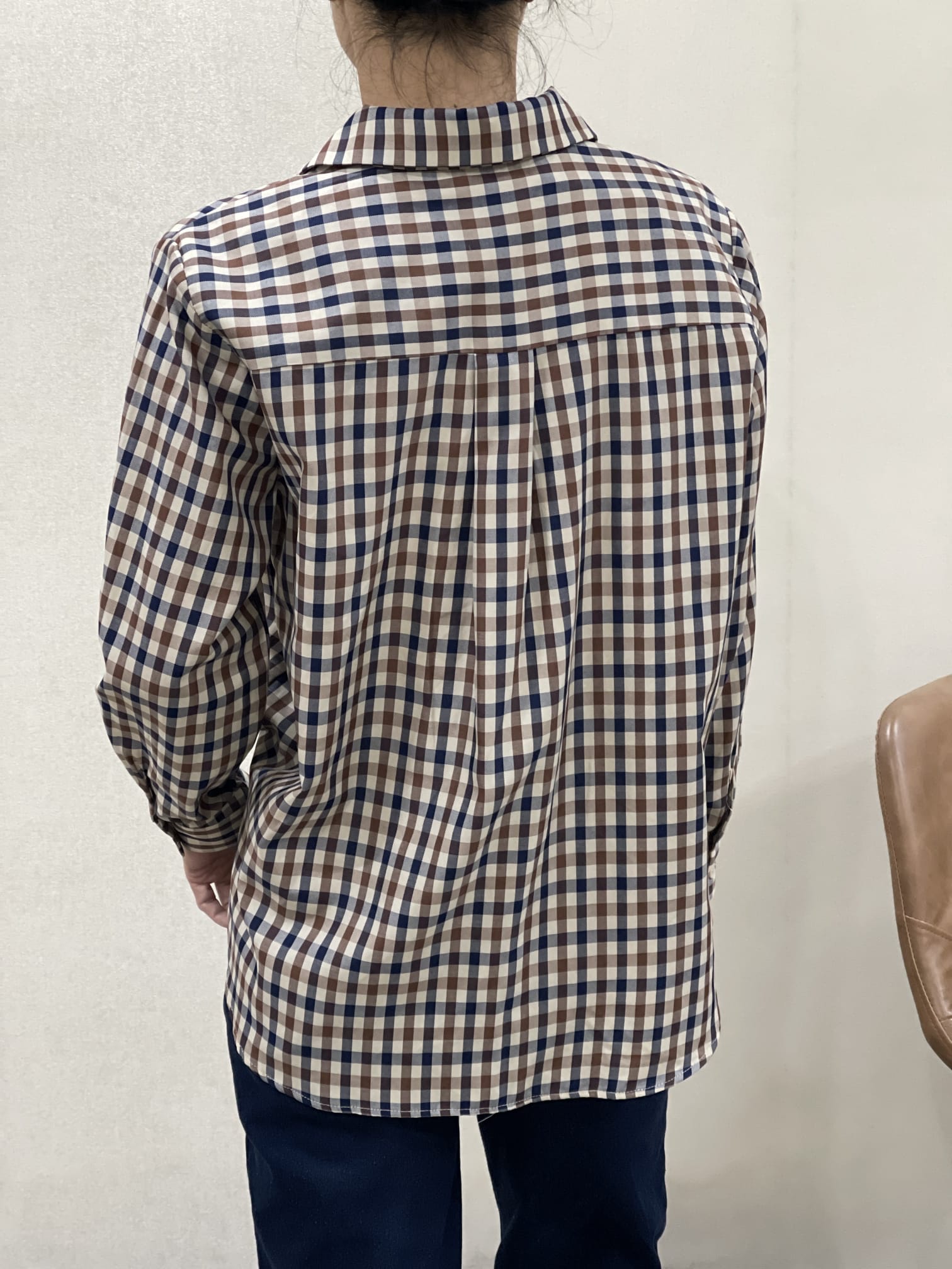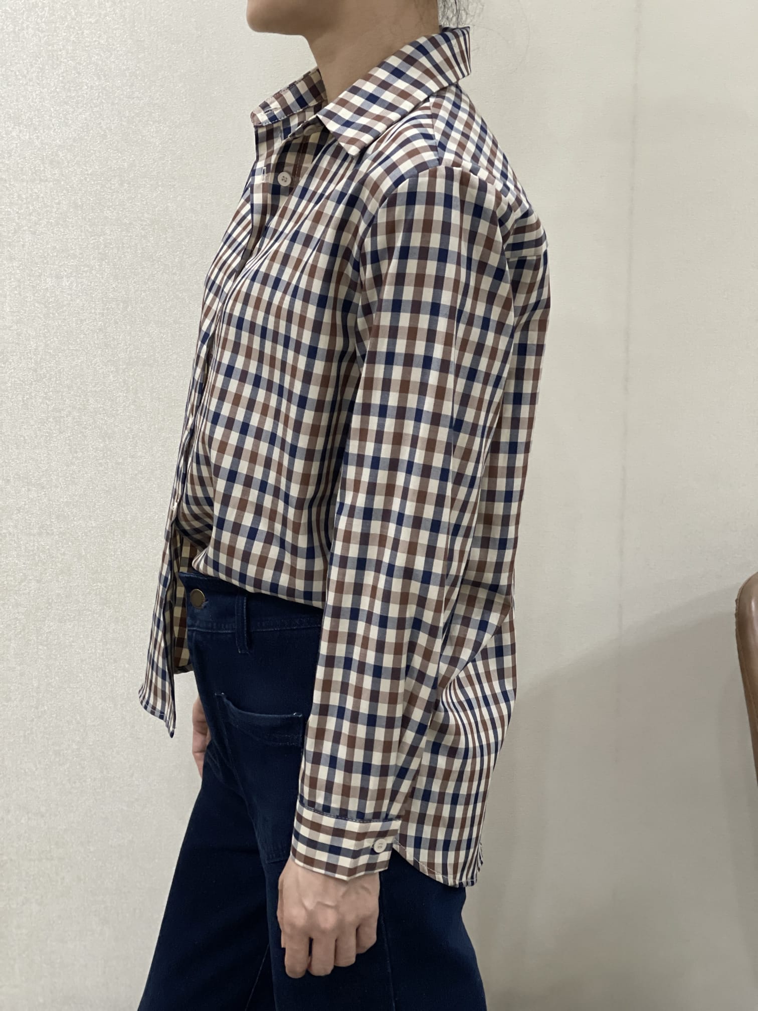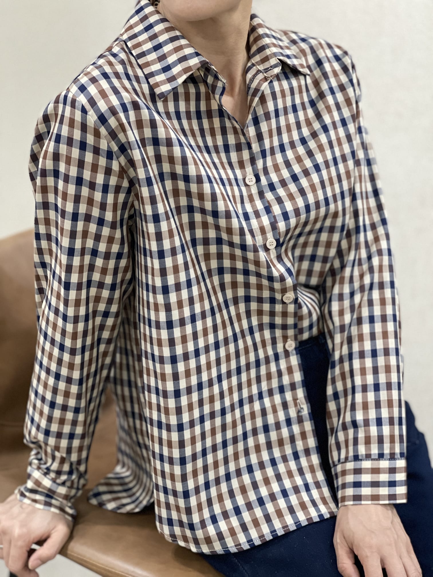 Camisa de corte básico con estampado vichy en tonos marrón, azul y crudo, botones crudos y espalda un poco más larga que el frontal.