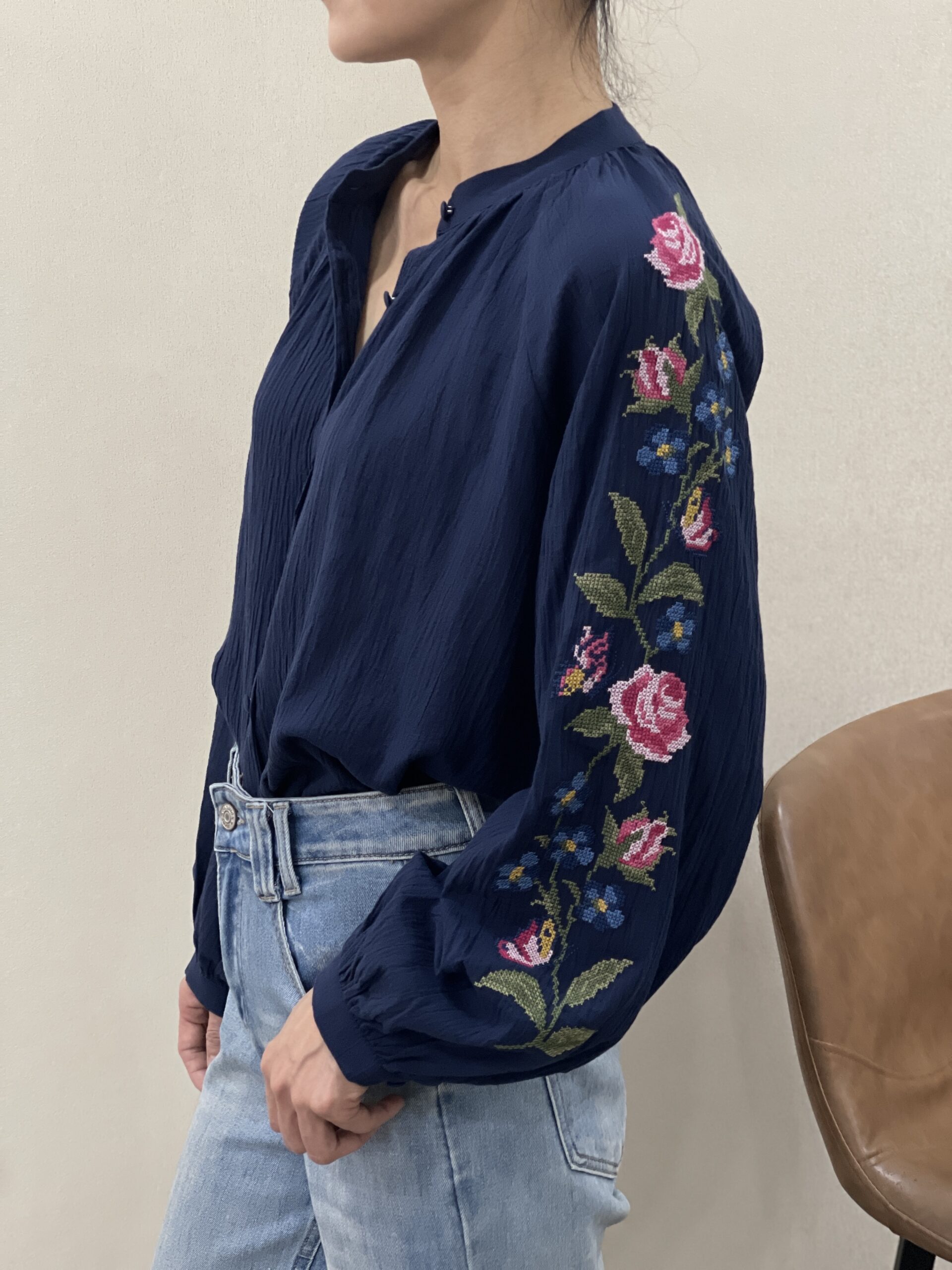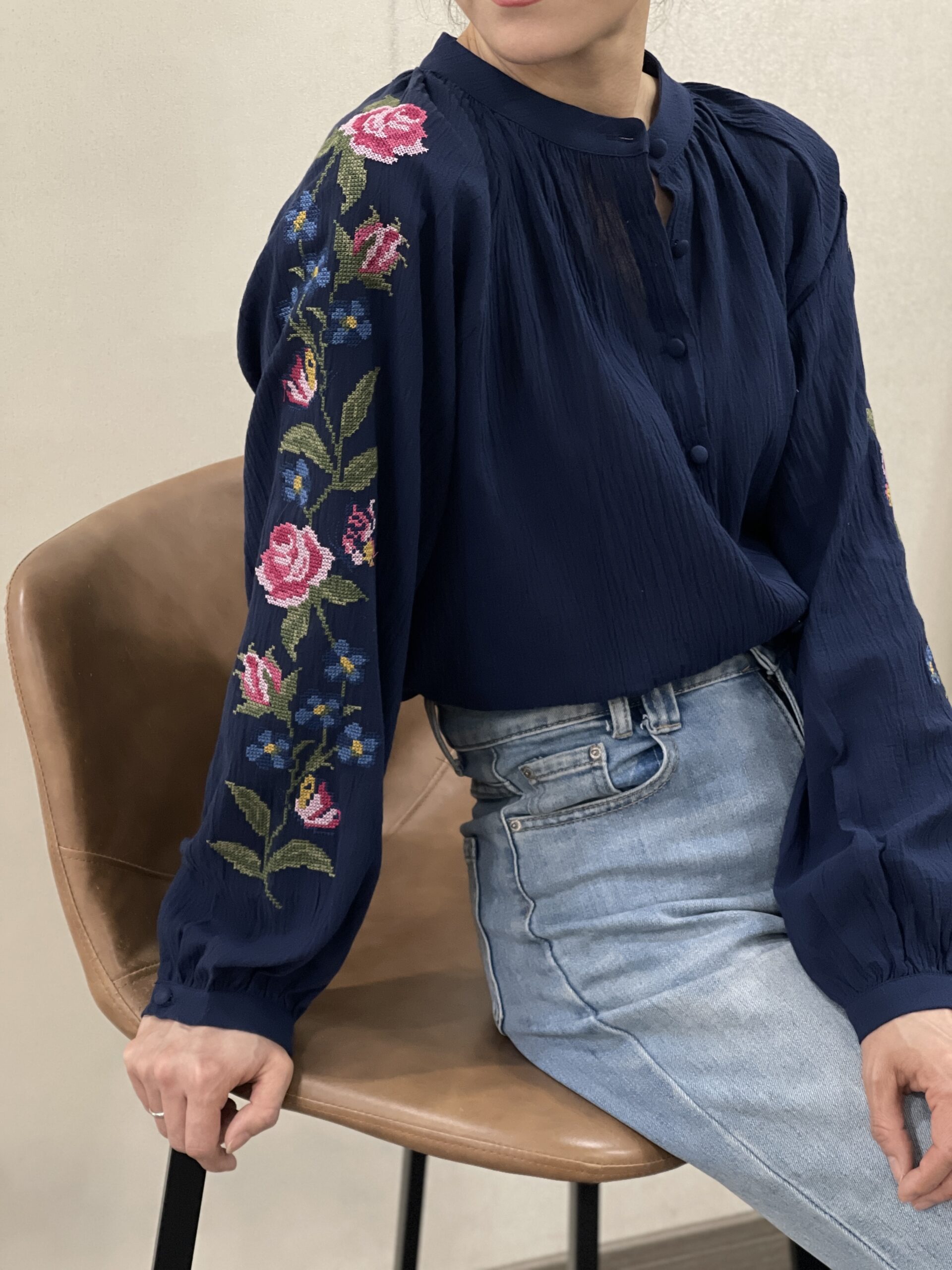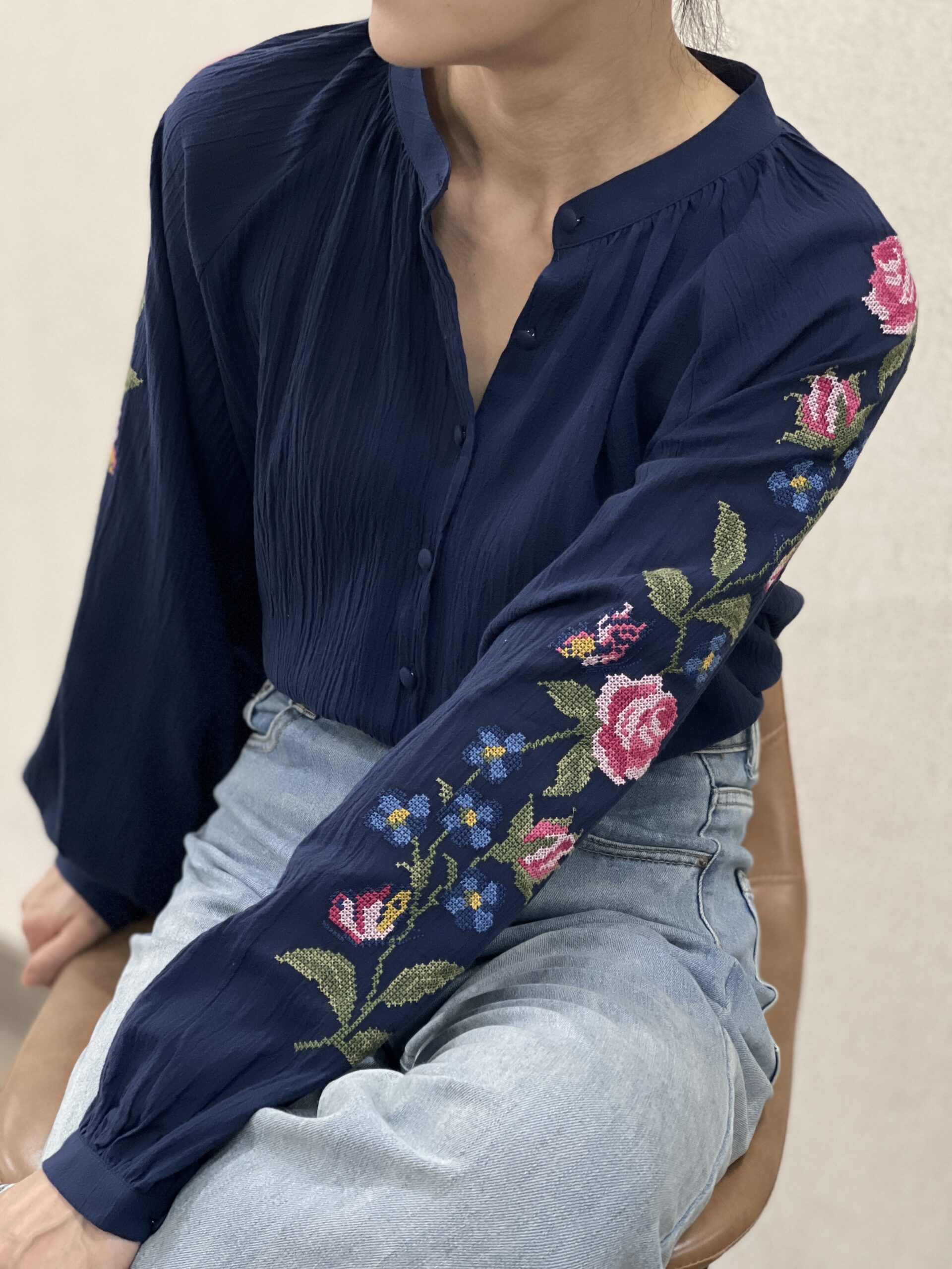 Camisa bordada azul oscuro Ana abotonada con botones forrados a tono y adornos florales en las mangas