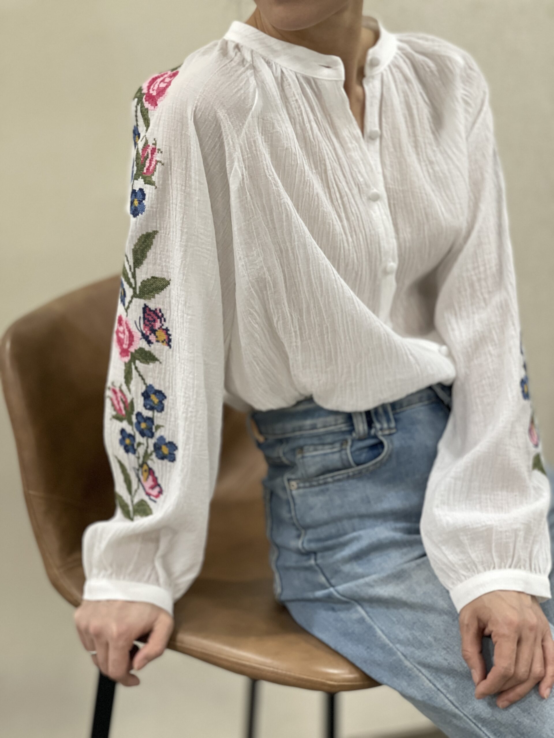Camisa bordada blanca Ana abotonada con botones forrados a tono y adornos florales en las mangas