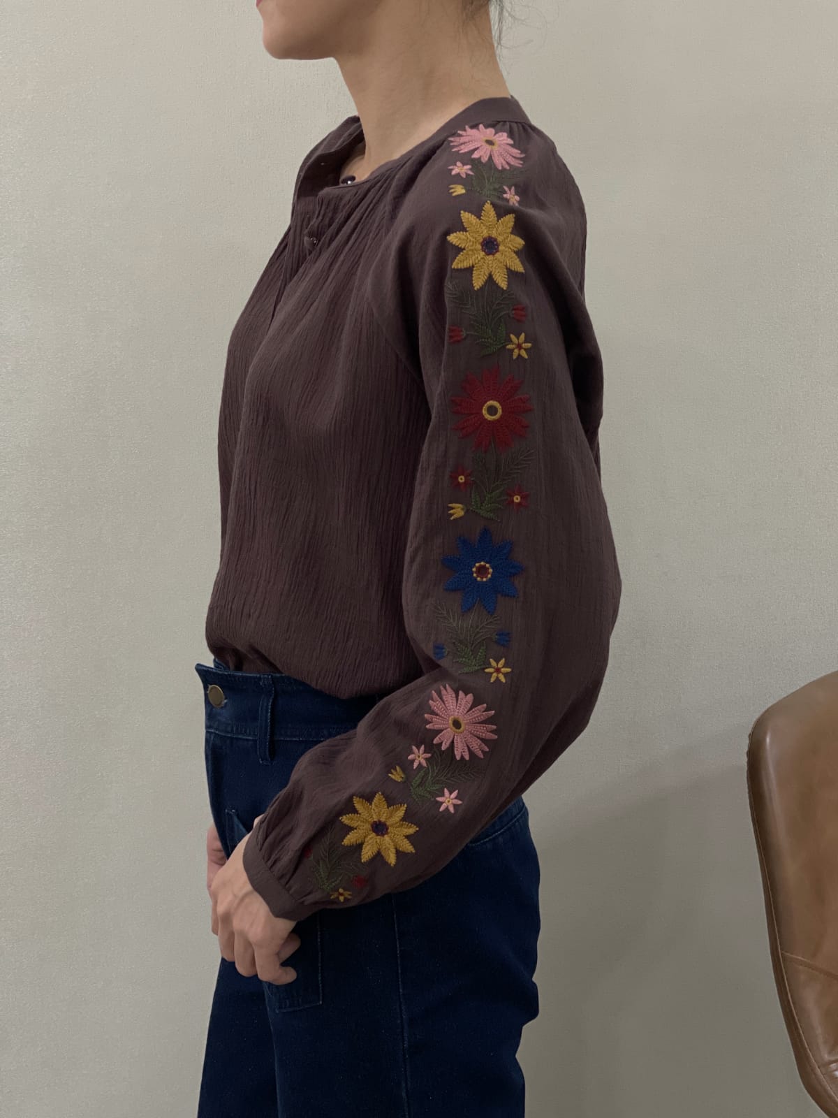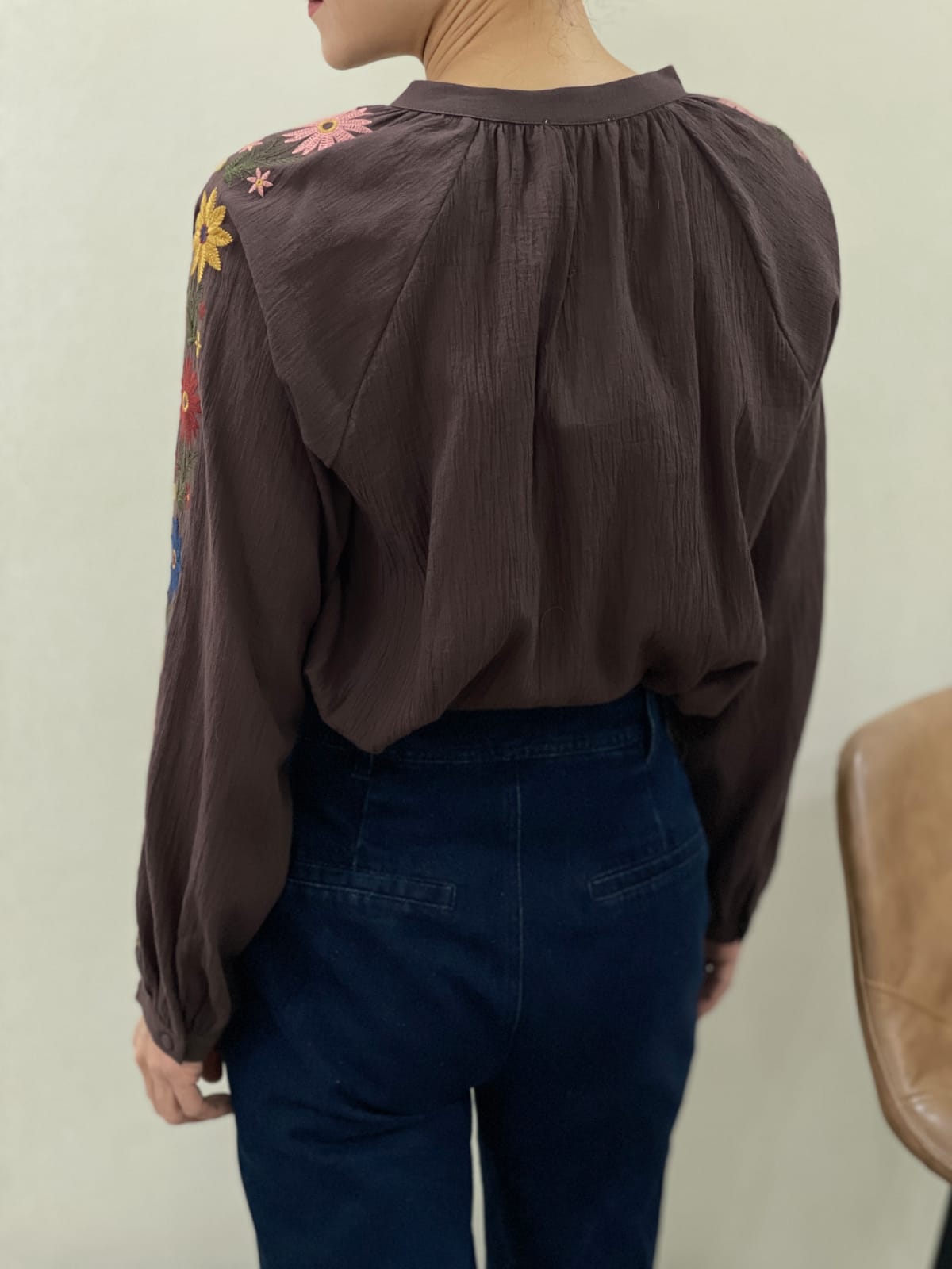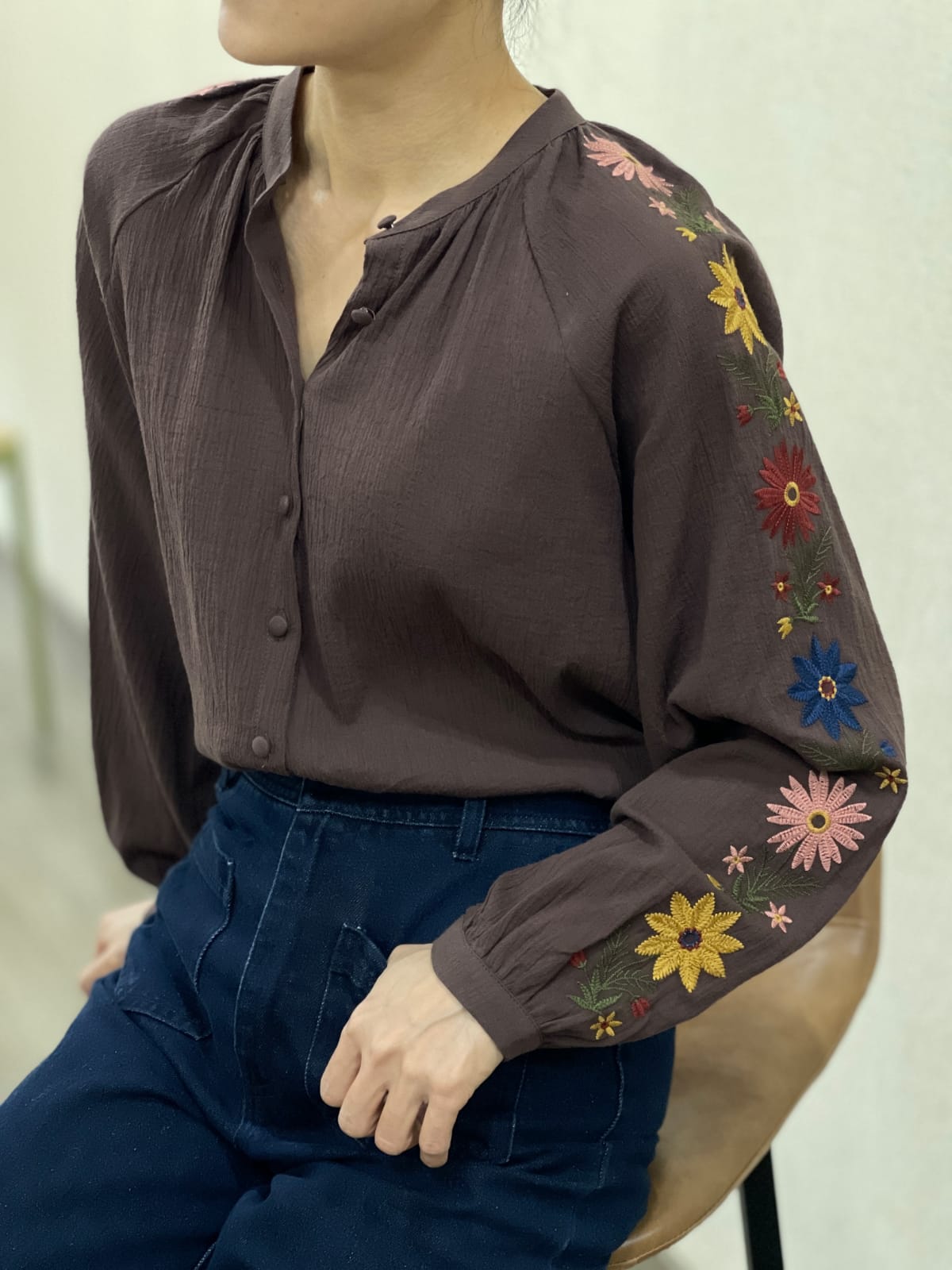 Camisa bordada color marrón Maitane de cuello mao con botones forrados en el mismo tejido. Adornos florales en las mangas desde el cuello hasta los puños, que cierran con un botón también forrado en tela.