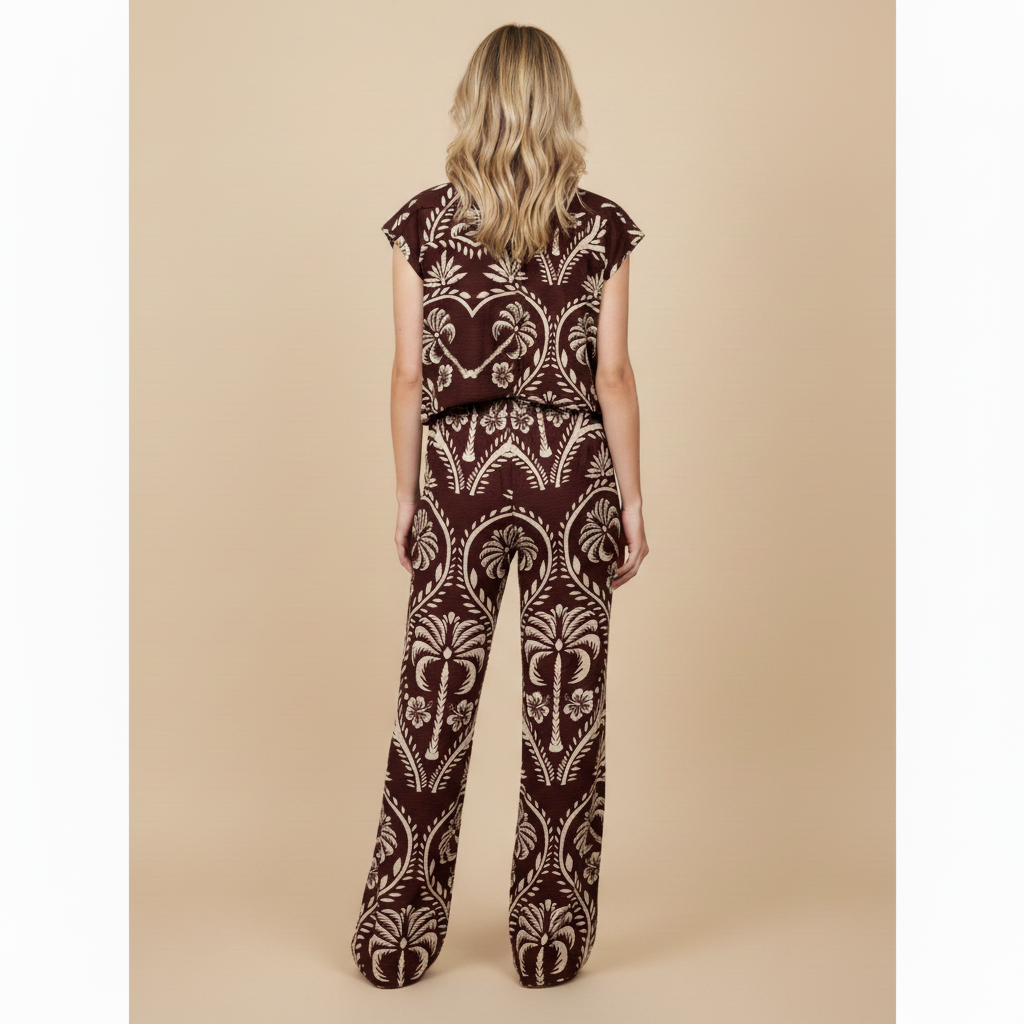 Camisa marrón Chantal con estampado floral beige, botones de nácar y manga corta japonesa.