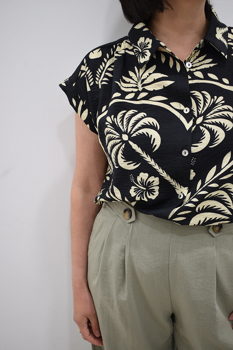 Camisa negra Chantal con estampado floral beige, botones de nácar y manga corta japonesa. Composición: 88% algodón y 12% poliamida.