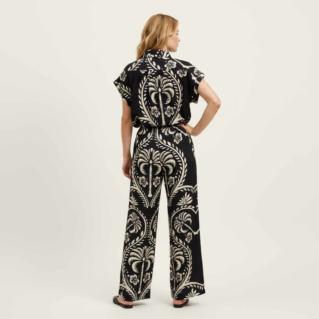 Camisa negra Chantal con estampado floral beige, botones de nácar y manga corta japonesa.