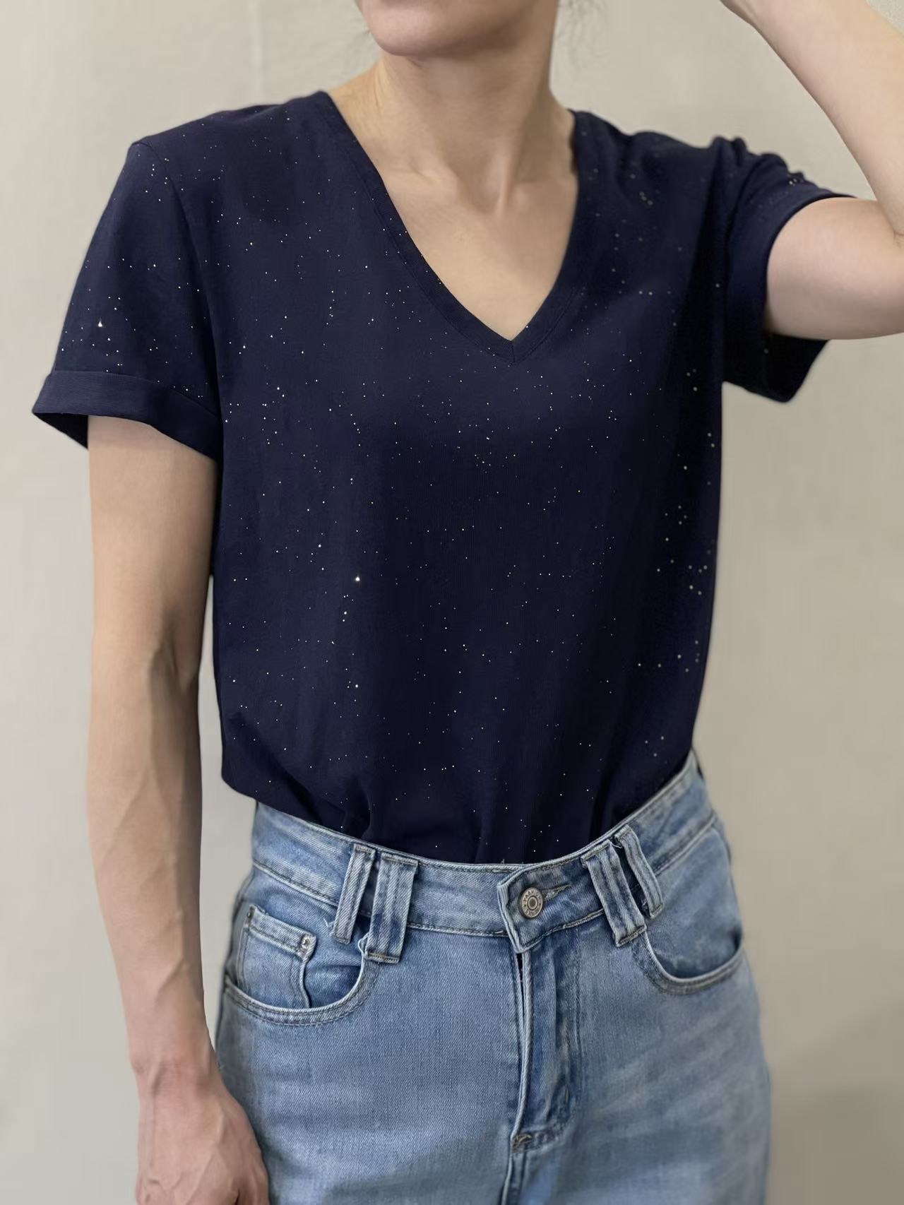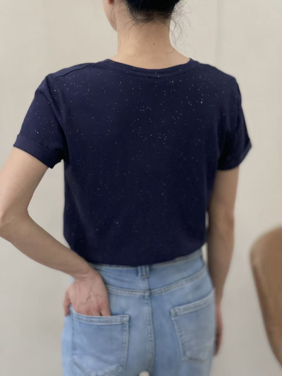 Camiseta azul oscuro Lur con destellos dorados, escote en pico y manga corta con dobladillo.