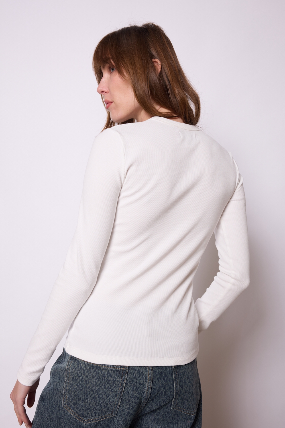 Camiseta blanca Lucien de cuello redondo, punto canalé fino y manga larga. Composición: 95% algodón y 5% elastano.