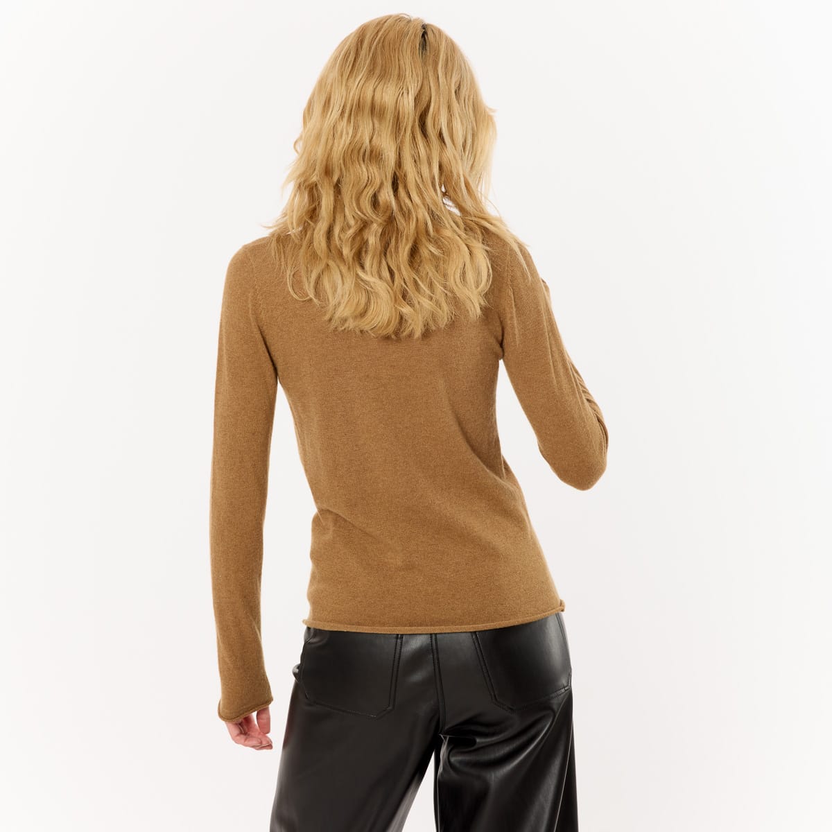 Camiseta color camel con manga larga, cuello cisne y dobladillo natural.