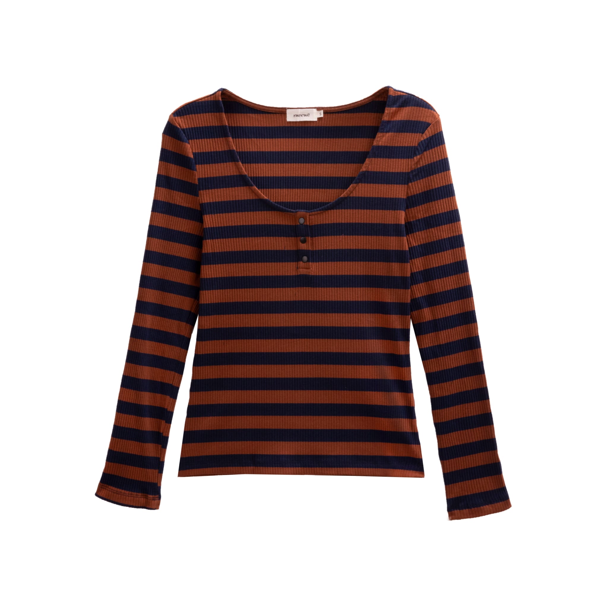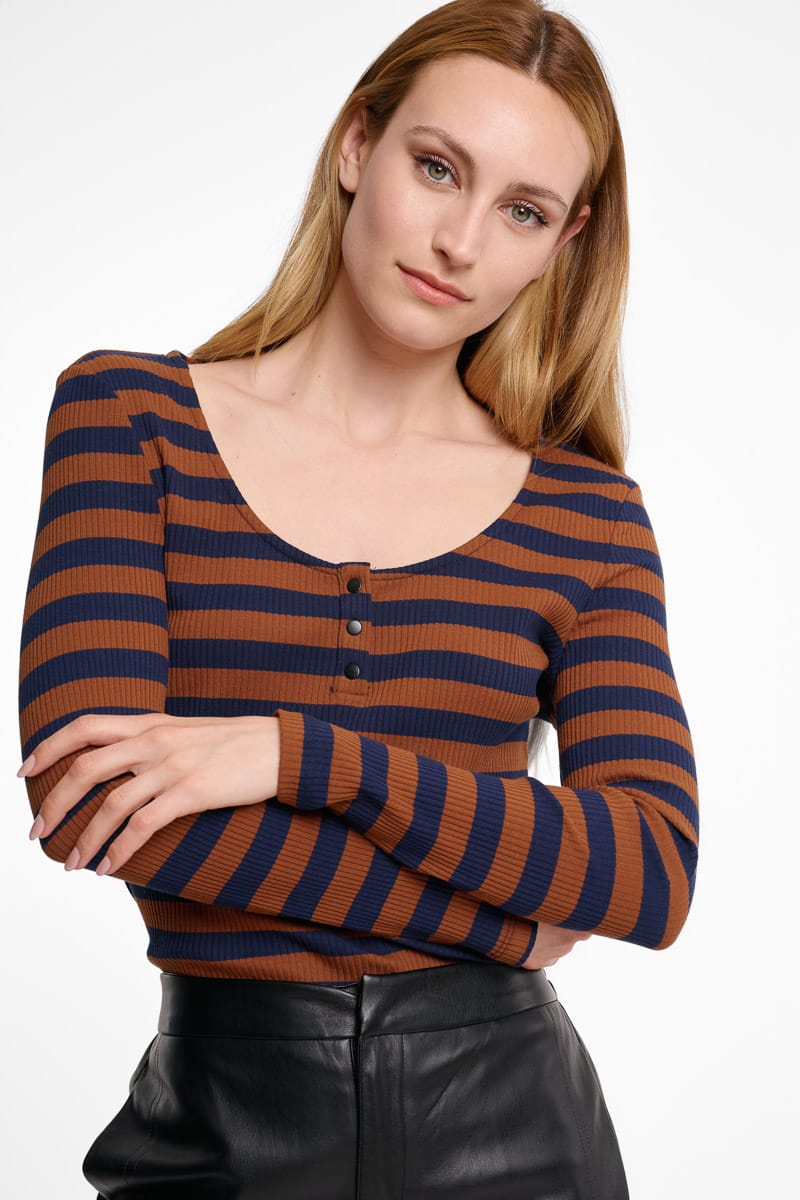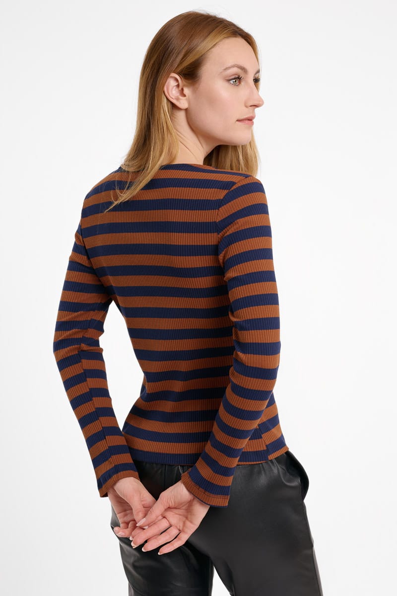 Camiseta de rayas marrón y azul marino Kali con escote redondo y tres pequeños botones de clic en azul marino.