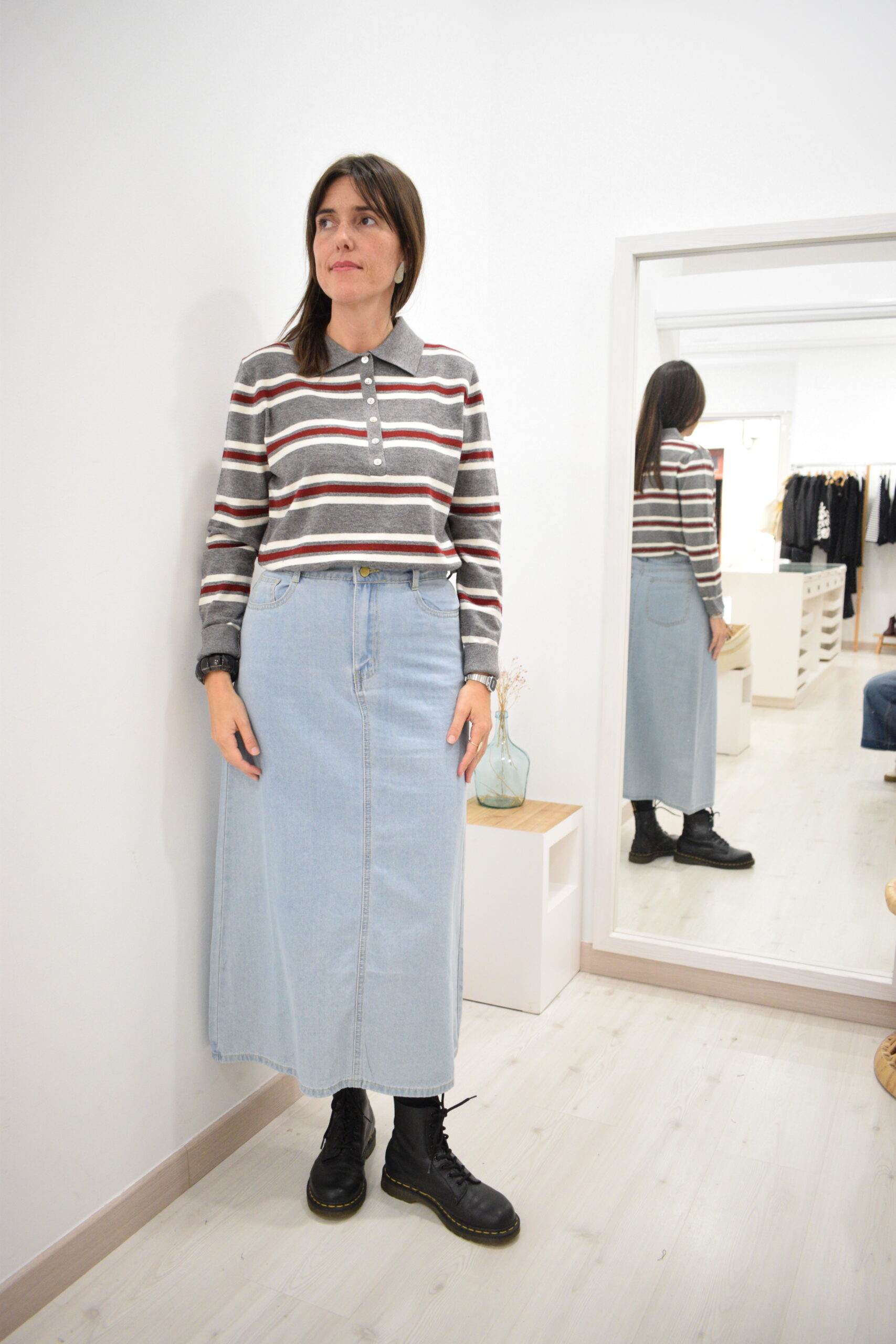 Polo gris de punto con manga larga a rayas en beige y granate, con el cuello gris y botonadura nacarada. Bajo y puños elásticos.