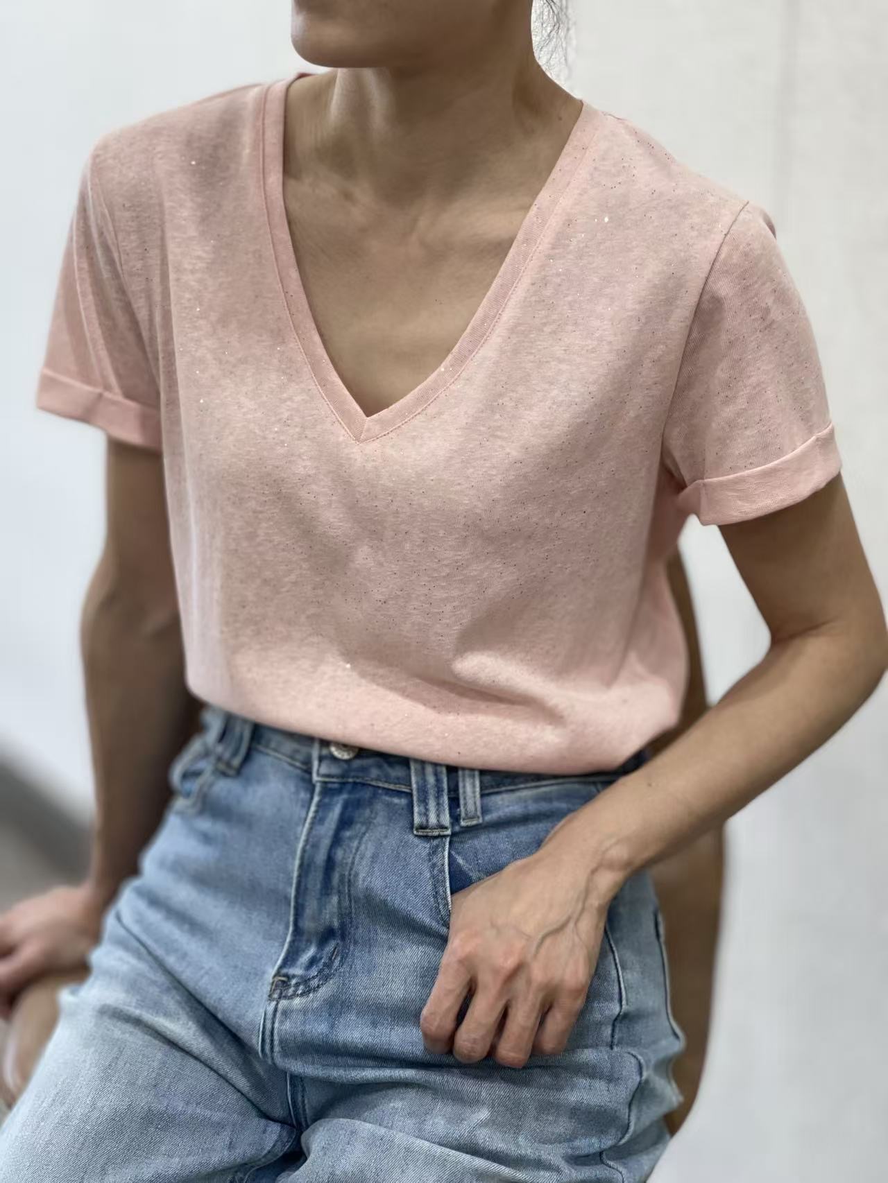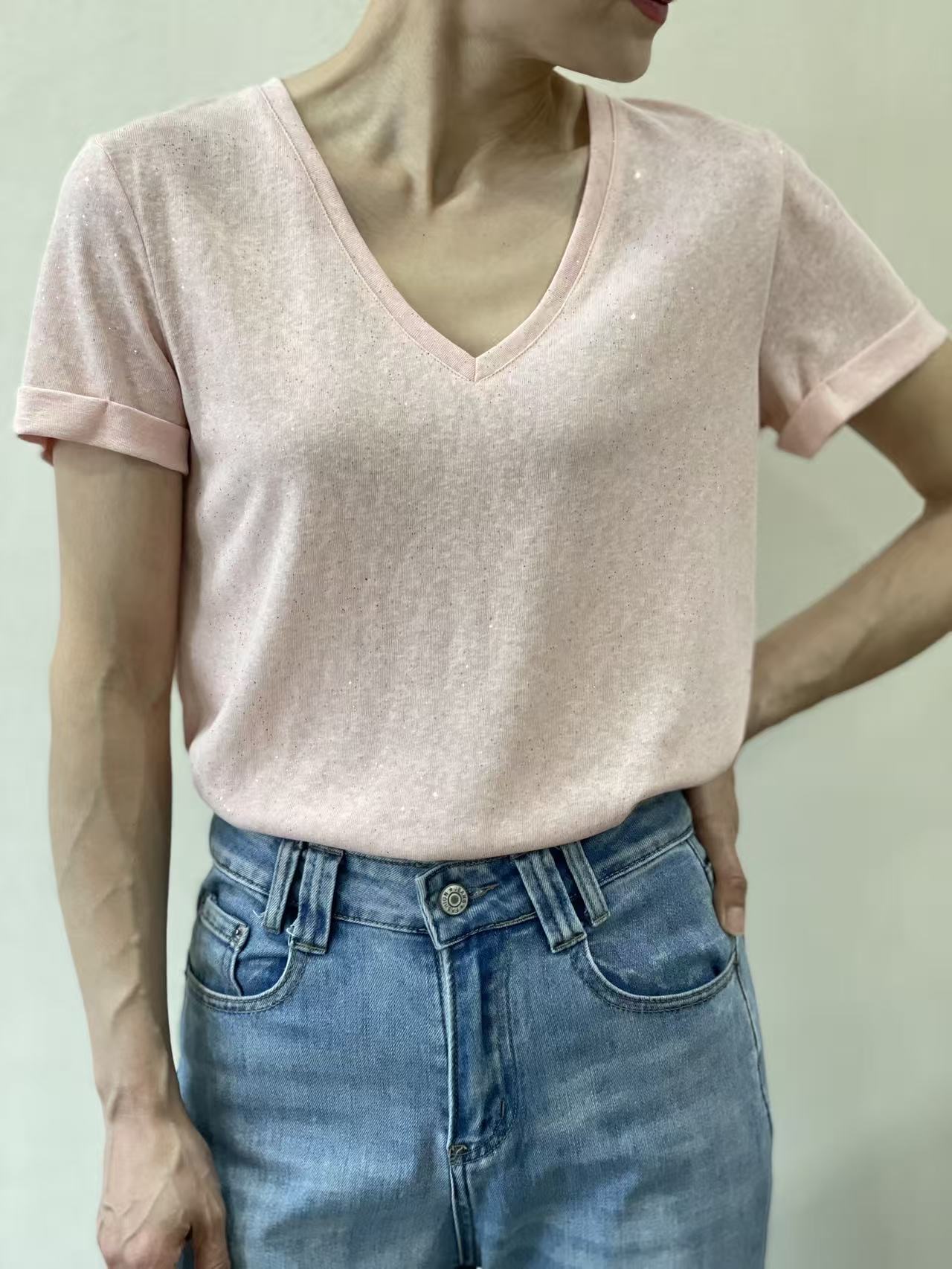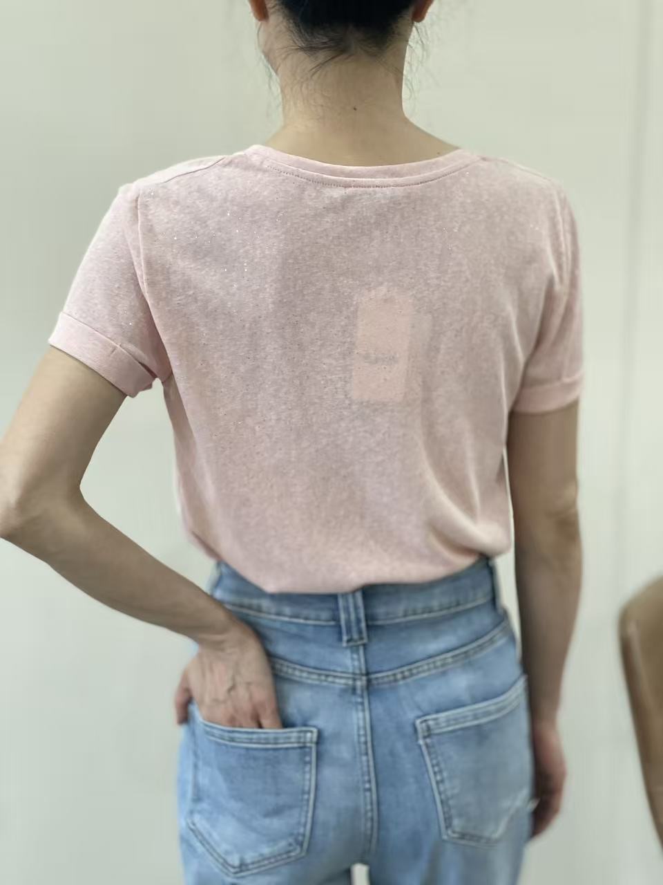 Camiseta rosapalo Lur con destellos dorados, escote en pico y manga corta con dobladillo.