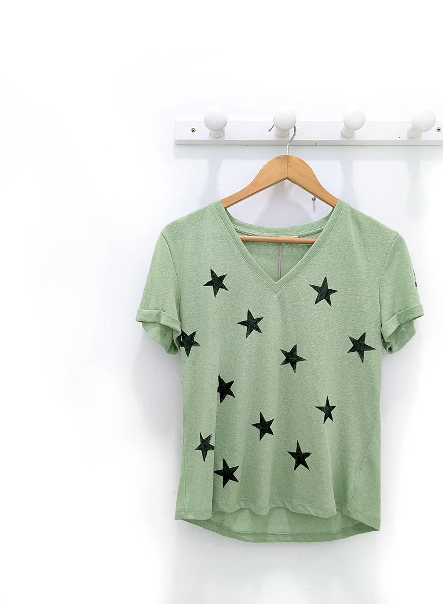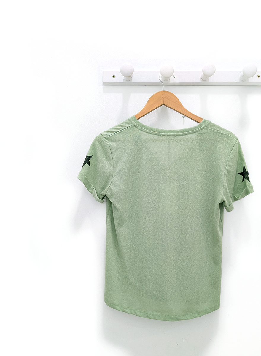 Camiseta verde con estrellas Lur con destellos dorados, escote en pico y manga corta con dobladillo. Composición: 70% algodón y 30% poliester.