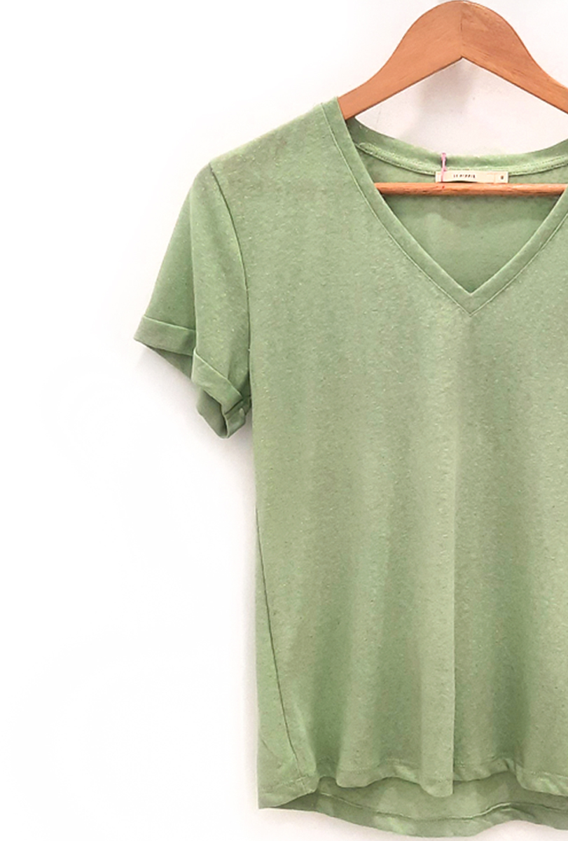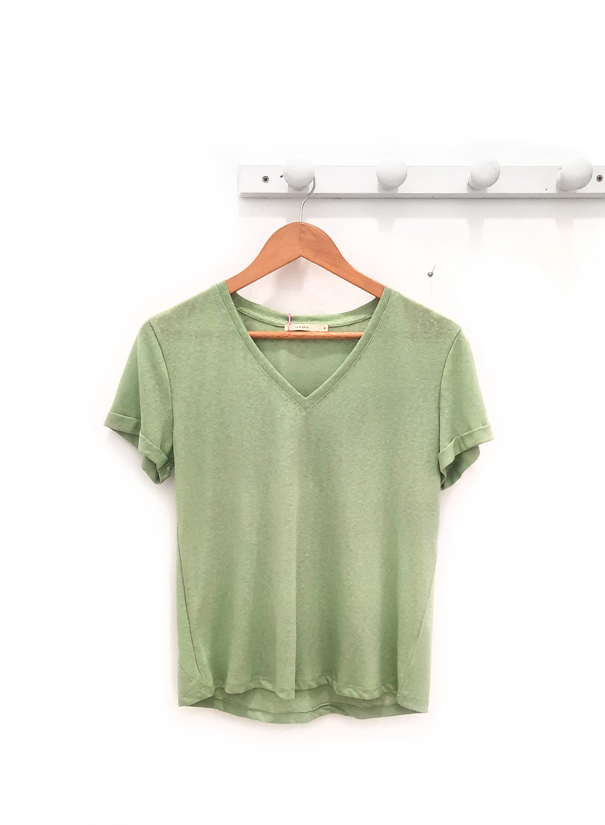 Camiseta verde Lur con destellos dorados, escote en pico y manga corta con dobladillo. Composición: 70% algodón y 30% poliester.