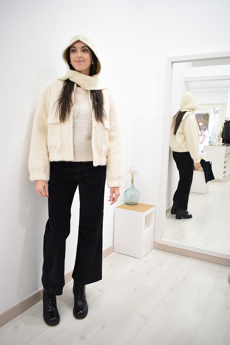 Capucha en tono crudo Txanogorritxu de tipo canalé con lazada en la base acabada en pico.