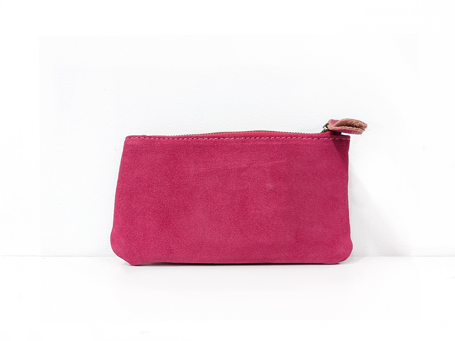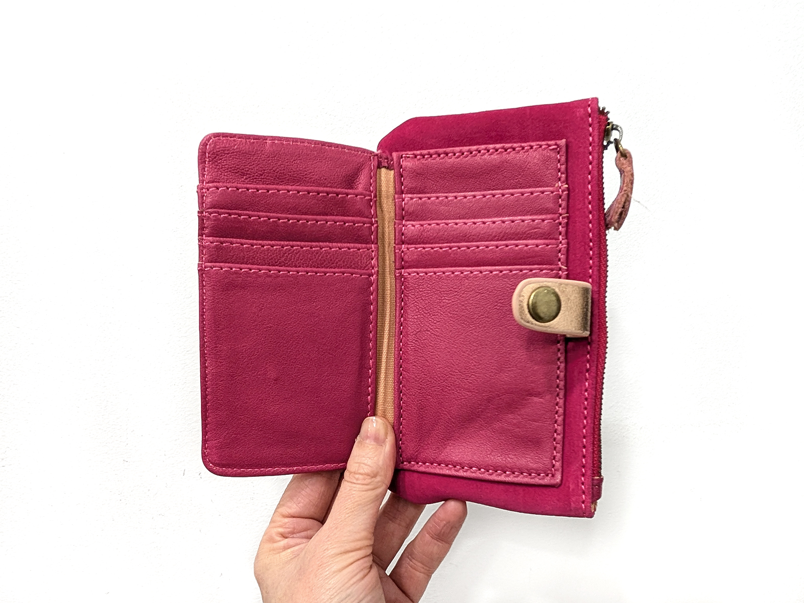 Cartera fucsia Colombia con amplio monedero con cierre de cremallera. Seis departamentos para tarjetas y billetera con cierre de botón dorado sobre trabilla rosa gliter.