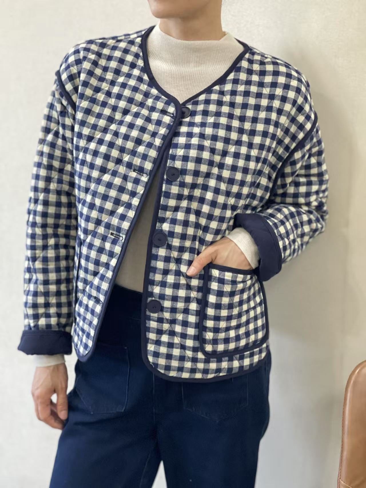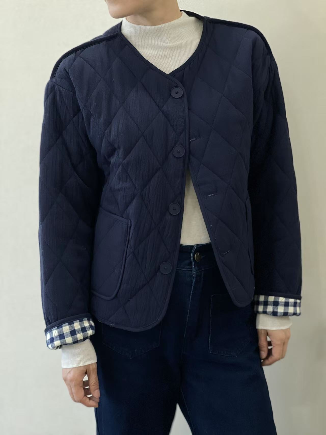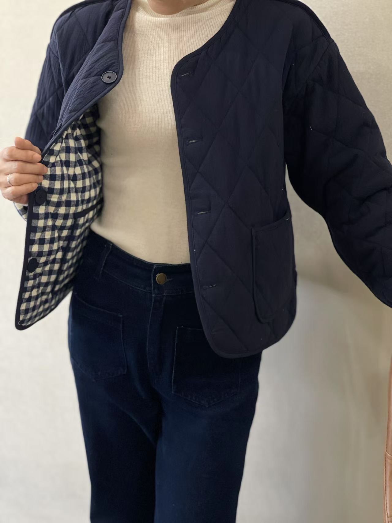 Cazadora acolchada azul marino reversible Vivi con cuello redondo, dos bolsillos en ambas partes, botonera azul marino y pequeña abertura lateral en los costados inferiores. Forro interior en cuadros azul marino, azul claro y beige.