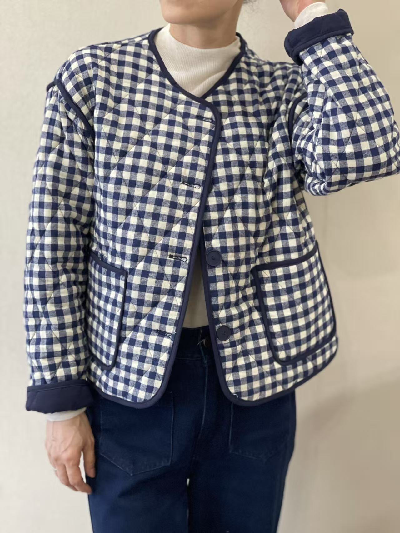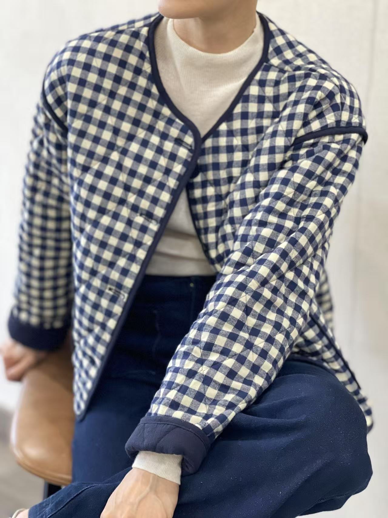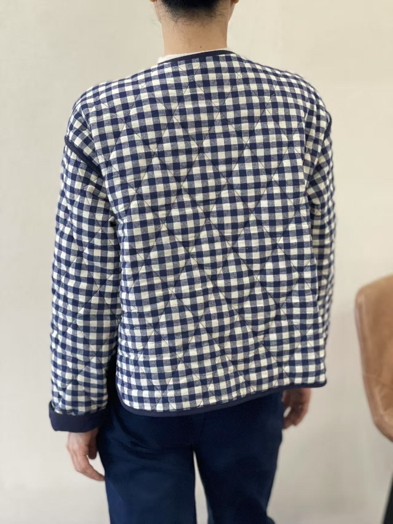 Cazadora acolchada azul marino reversible Vivi con cuello redondo, dos bolsillos en ambas partes, botonera azul marino y pequeña abertura lateral en los costados inferiores. Forro interior en cuadros azul marino, azul claro y beige.