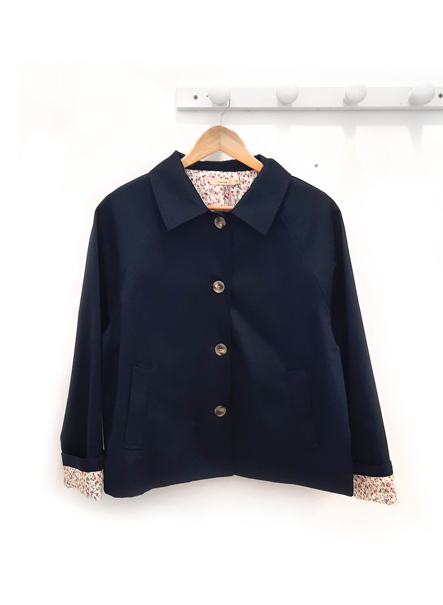 Cazadora azul marino Gillian con dos bolsillos diagonales, cuello con solapas y botonadura en marrón claro oscuro. Forro interior verdes, rojas y amarillas. Composición: 100% algodón. Forro: 100% algodón.