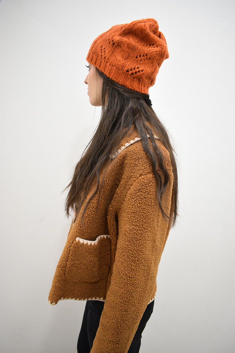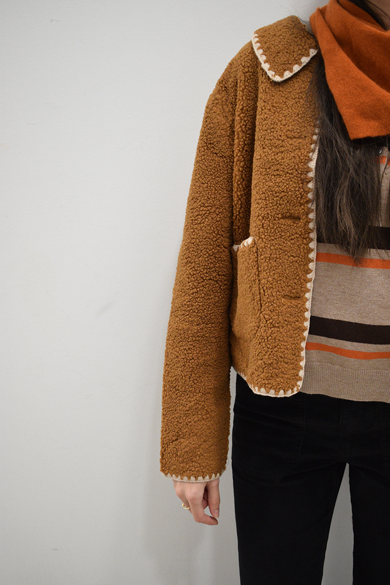 Cazadora borreguito marrón Miriam con cuello bebé, detalle bordado crudo, bolsillos frontales y botones a tono.