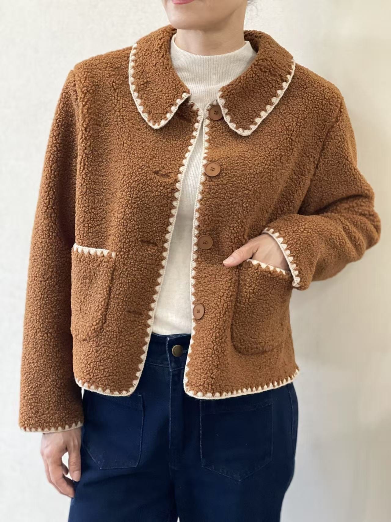 Cazadora tipo borreguito en color marrón con cuello bebé, detalle bordado crudo, bolsillos frontales y botones a tono.