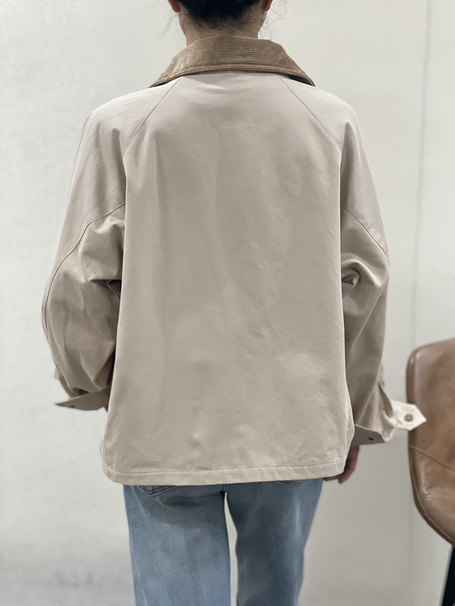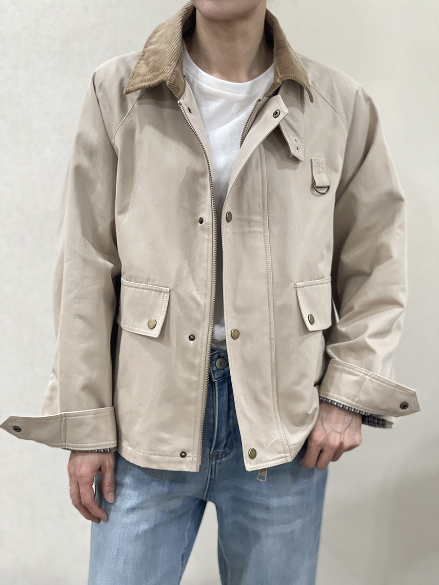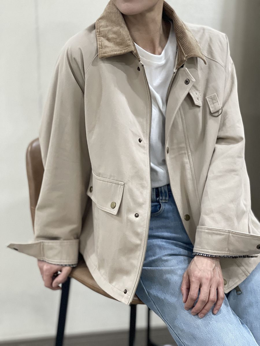 Cazadora en tono crudo Manon con cuello de pana marrón claro, dos bolsillos diagonales con solapa superior, cierre con cremallera y solapa de botones metálicos en tono dorado y puños con botón. Forro interior a cuadros marrones, azules y beiges. Composición: 100% algodón. Forro: 100% algodón.