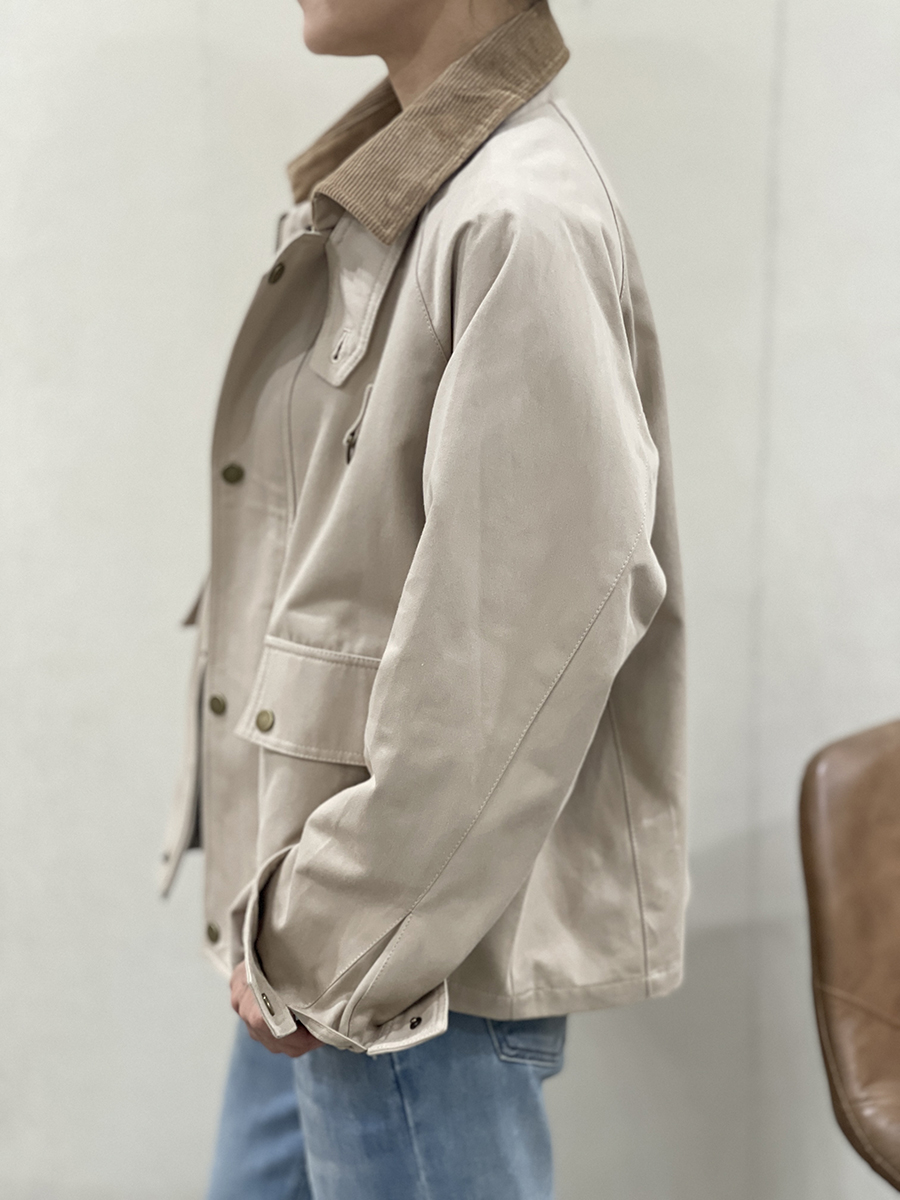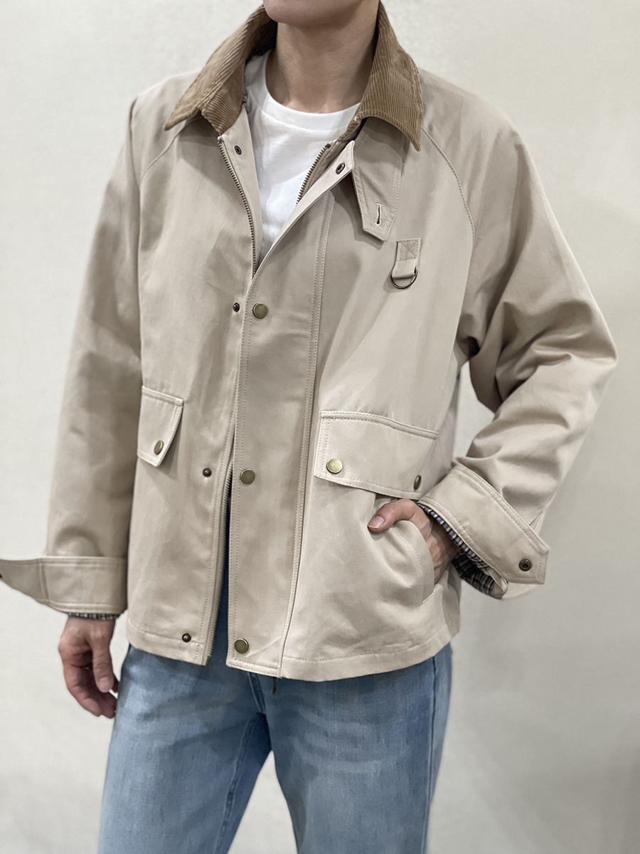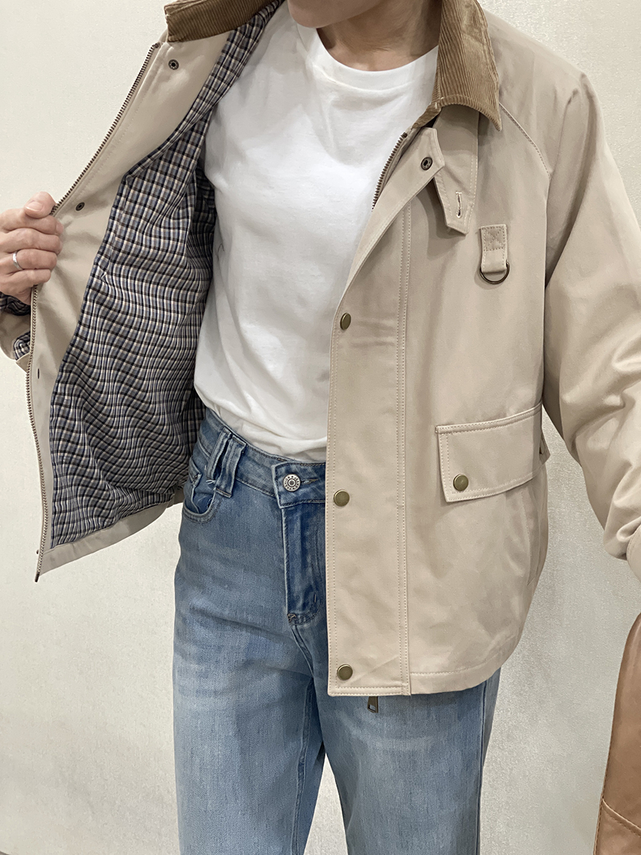 Cazadora en tono crudo Manon con cuello de pana marrón claro, dos bolsillos diagonales con solapa superior, cierre con cremallera y solapa de botones metálicos en tono dorado y puños con botón. Forro interior a cuadros marrones, azules y beiges. Composición: 100% algodón. Forro: 100% algodón.
