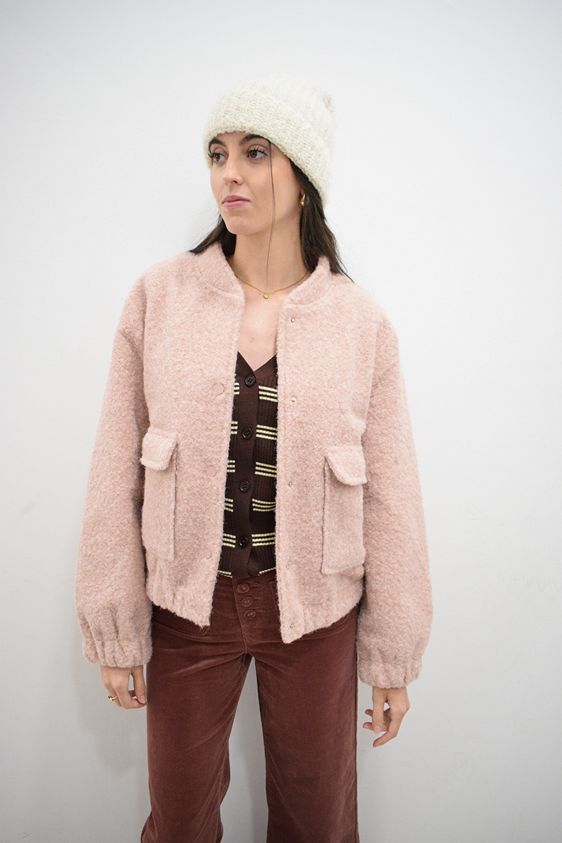Bomber rosa de pelo corto con cuello simple, dos bolsillos verticales con cierre de solapas, botonera del mismo color, goma en la cintura y los puños.