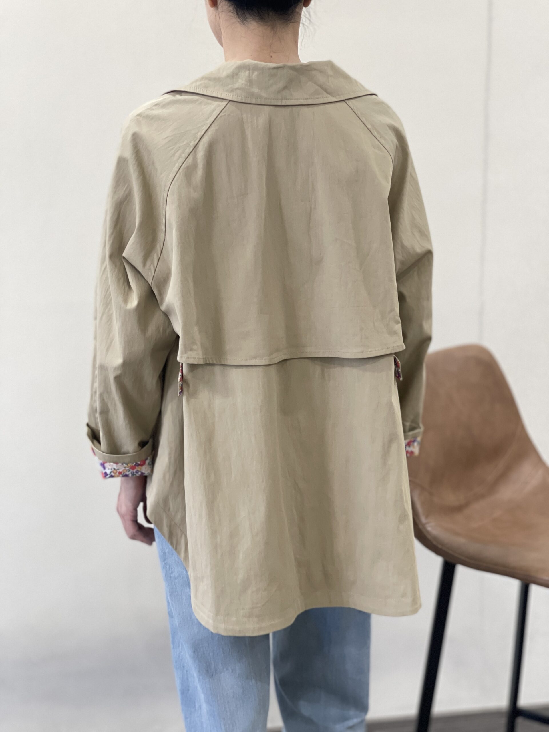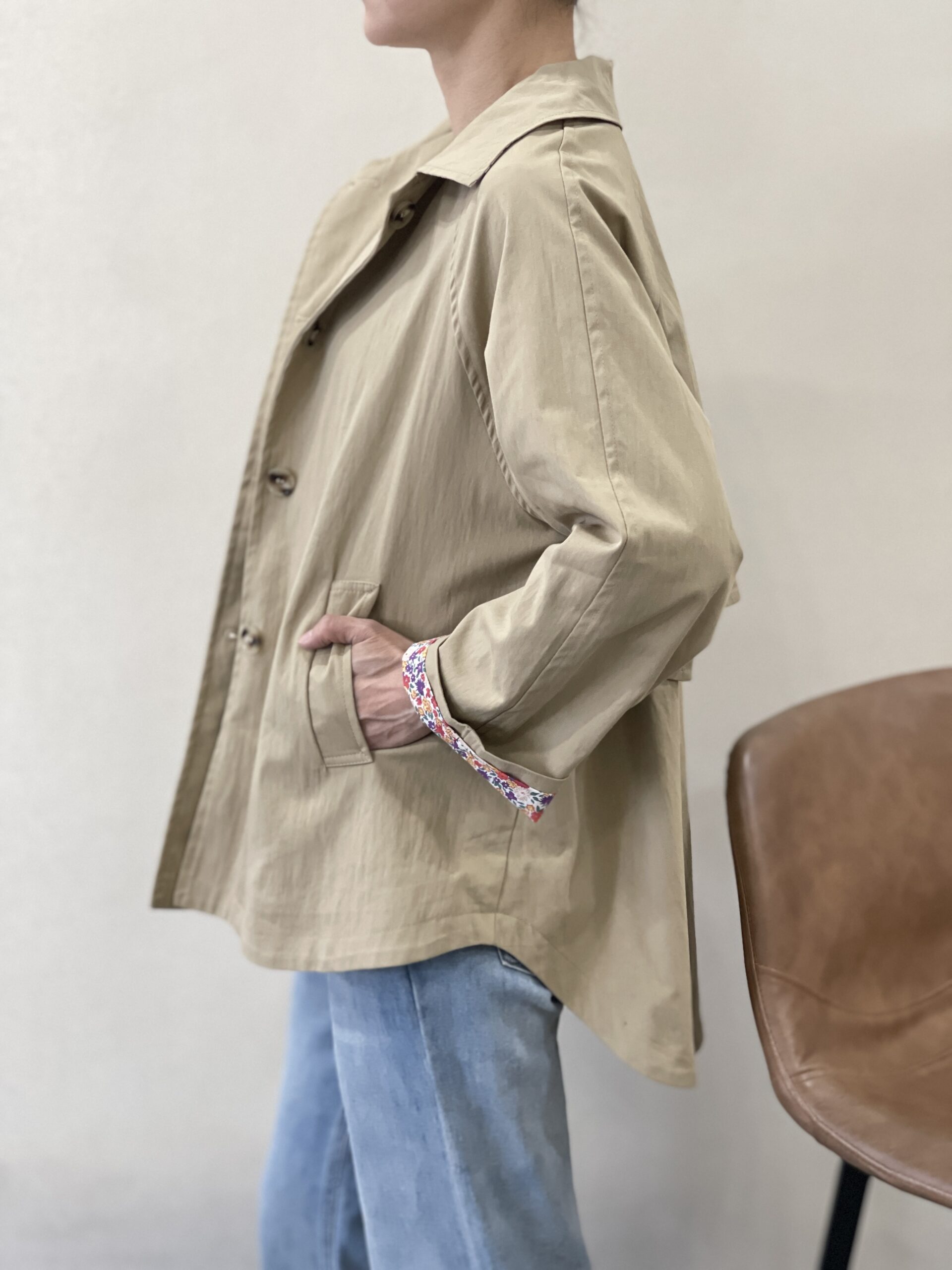 Cazadora taupe Rubi de cuello con solapas, dos bolsillos delanteros en diagonal, botonera en marrón claro oscuro, solapa trasera a la altura de la cintura y detalle decorativo con botón en los laterales. Forro interior con alegre y colorido estampado de flores.