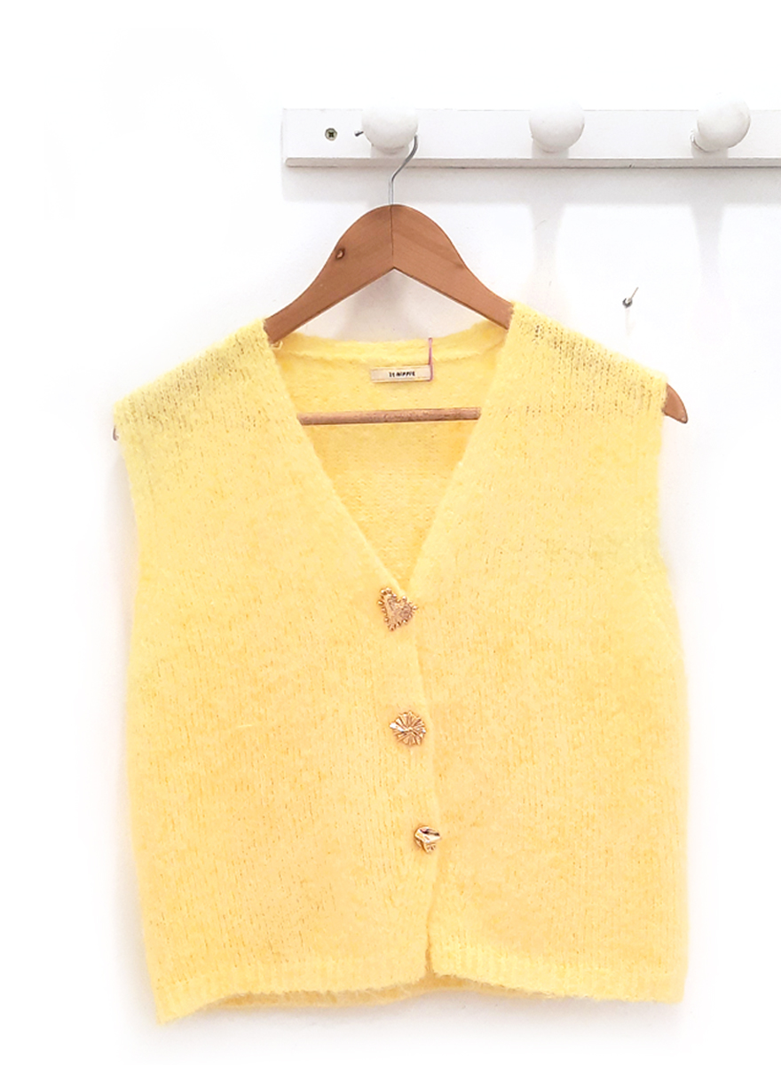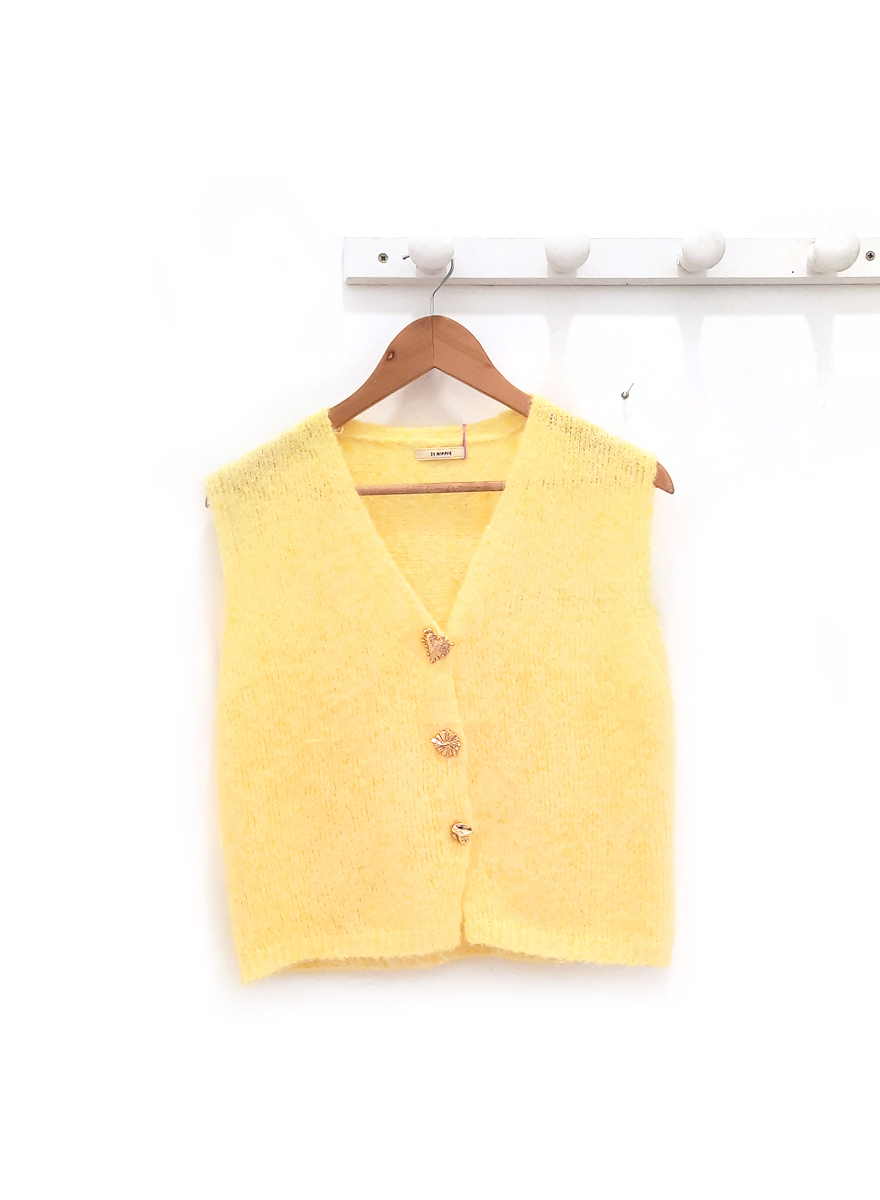 Chaleco amarillo Isaac de punto con botones dorados de diferentes formas. Composición:  59% poliérter, 32% poliamida y 9% lana.