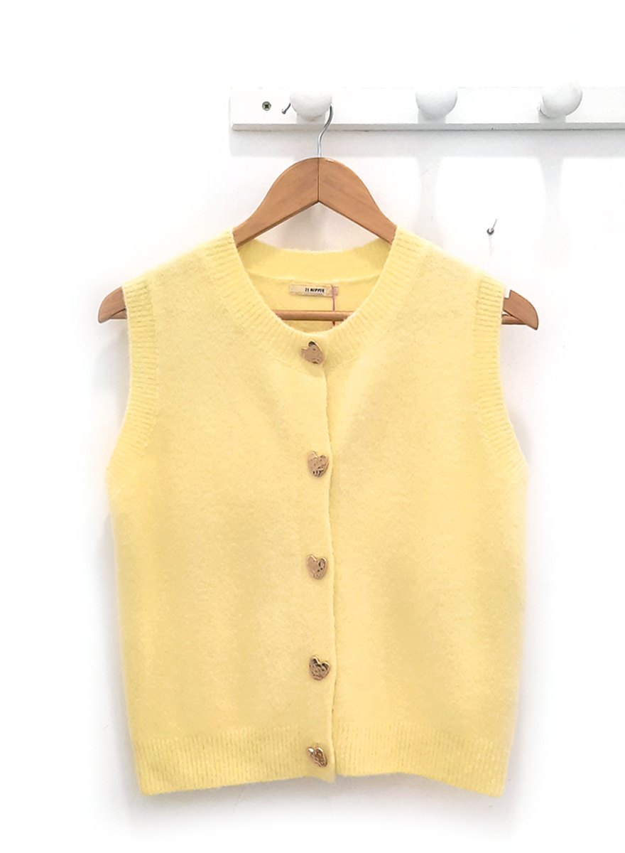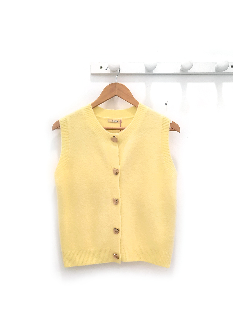 Chaleco amarillo Mael de punto con botones dorados en forma de corazón. Composición:   50% poliamida, 35% viscosa, 10% lana y 5% elastano.