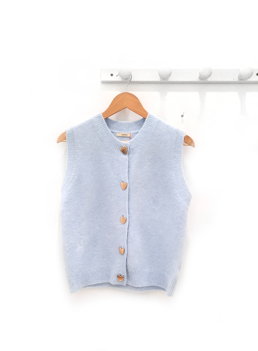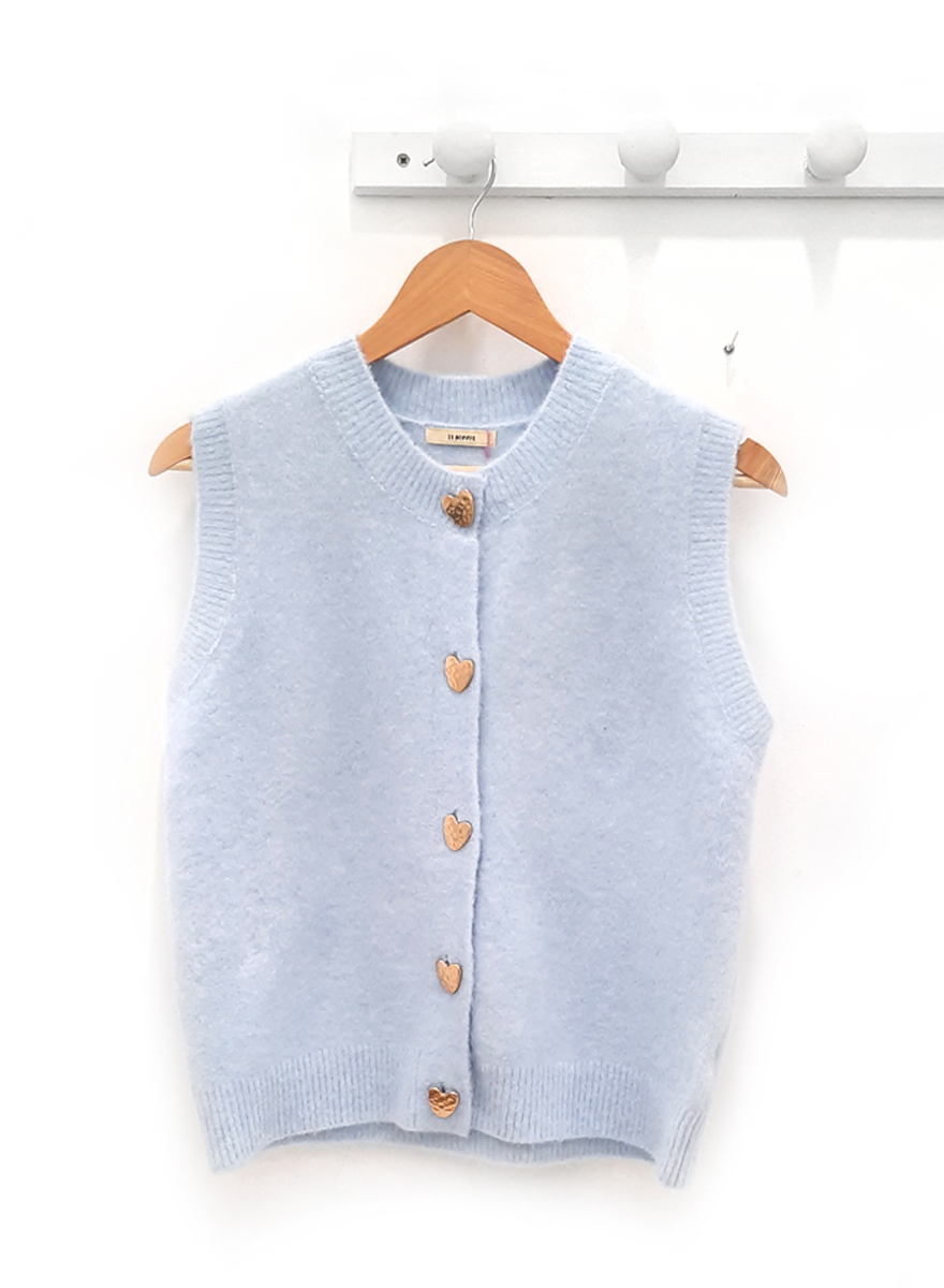 Chaleco azul Mael de punto con botones dorados en forma de corazón. Composición:   50% poliamida, 35% viscosa, 10% lana y 5% elastano.