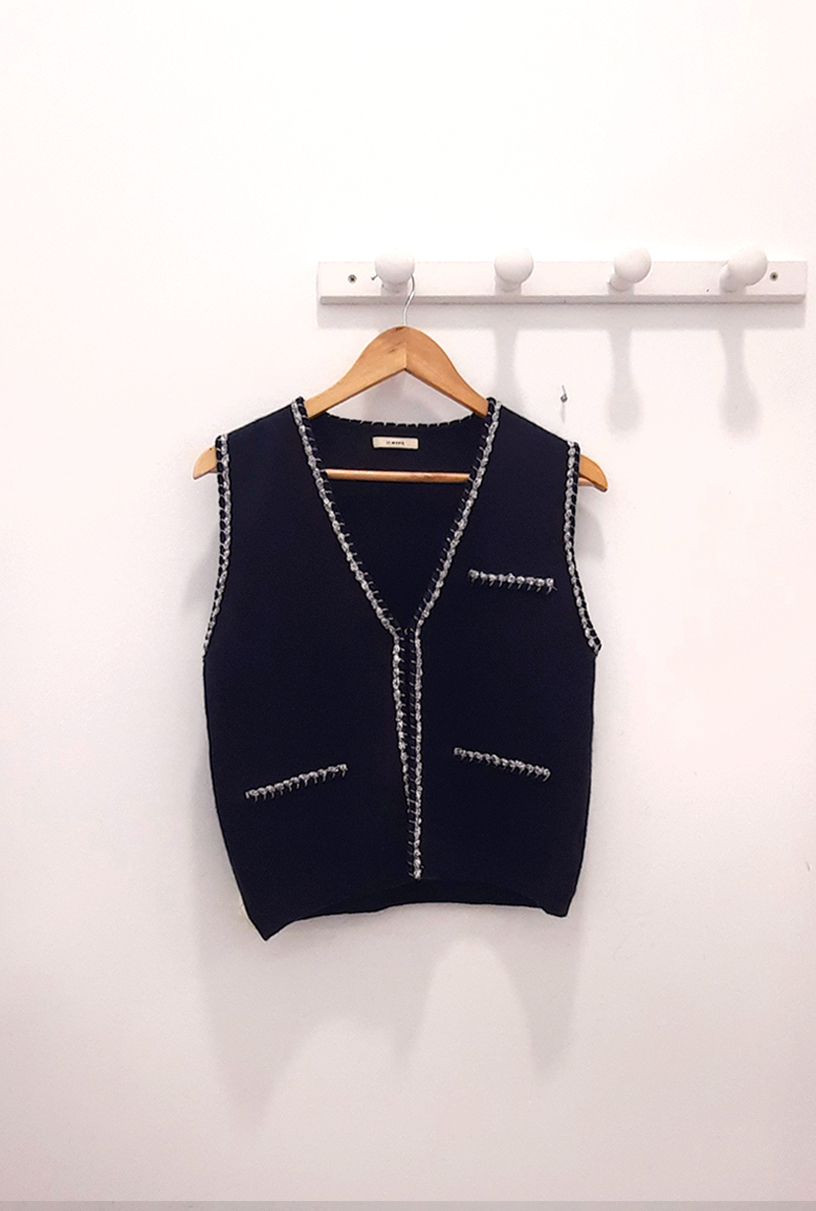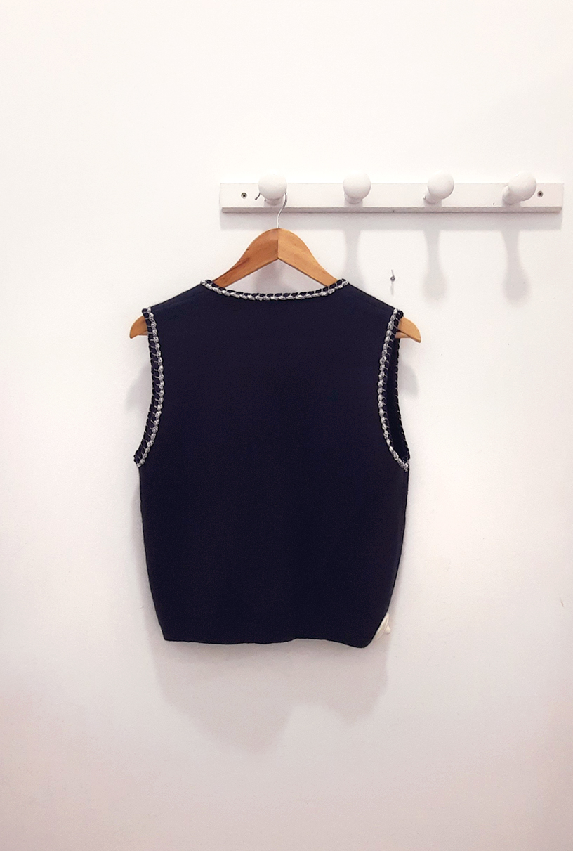 Chaleco azul marino de punto Zack con ribete crudo e hilo plateado a lo largo del cuello en pico y mangas,con un único corchete para cierre. Con tres falsos bolsillos.