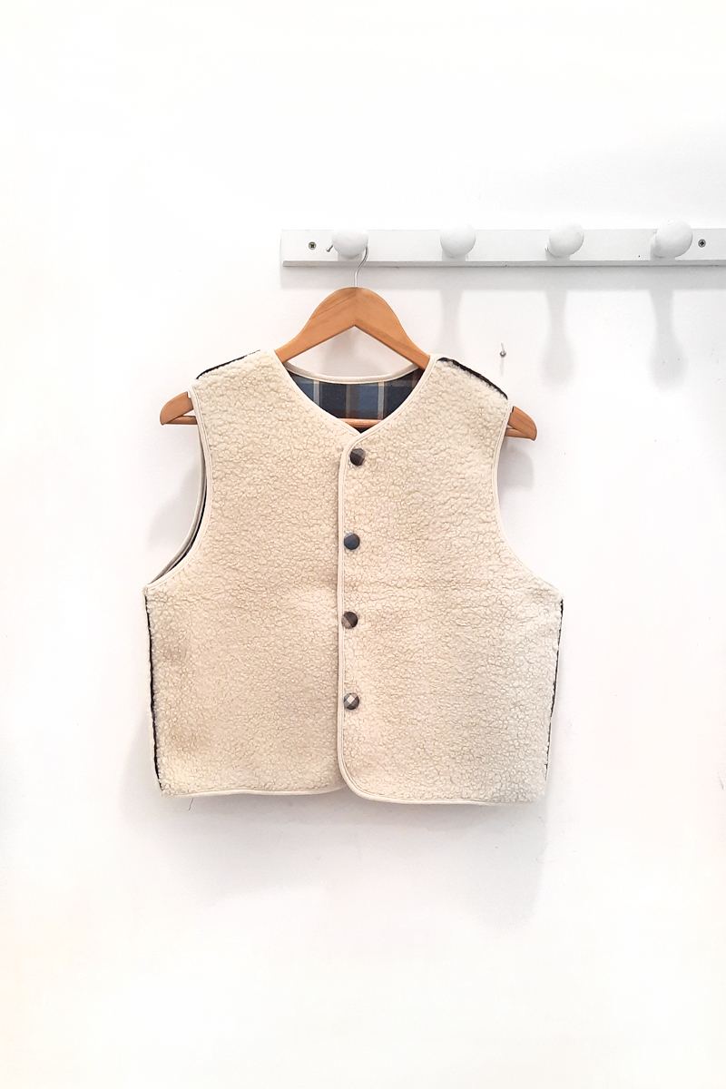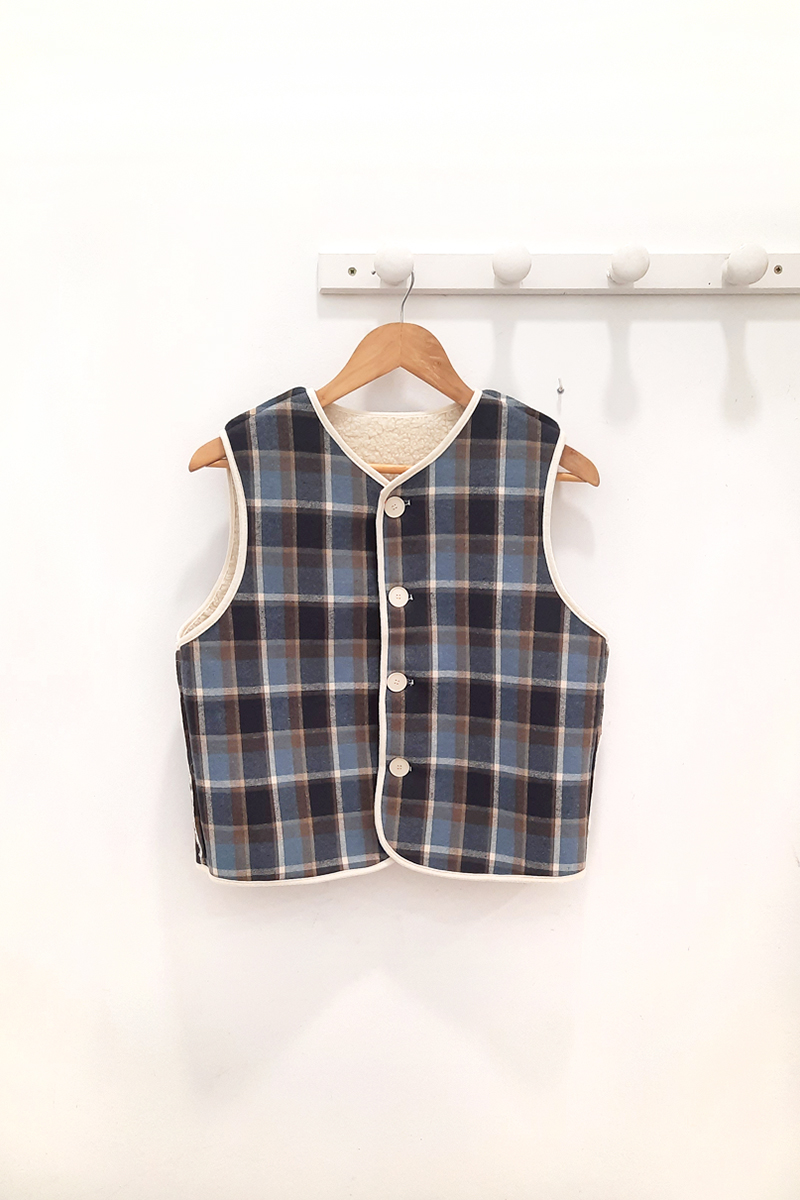 Chaleco azul reversible Mildred de cuadros en azul, beige, crudo y gris, con botonera en crudo y cuello en pico. Borreguillo en la parte reversibe con botones del mismo estampado de cuadros.