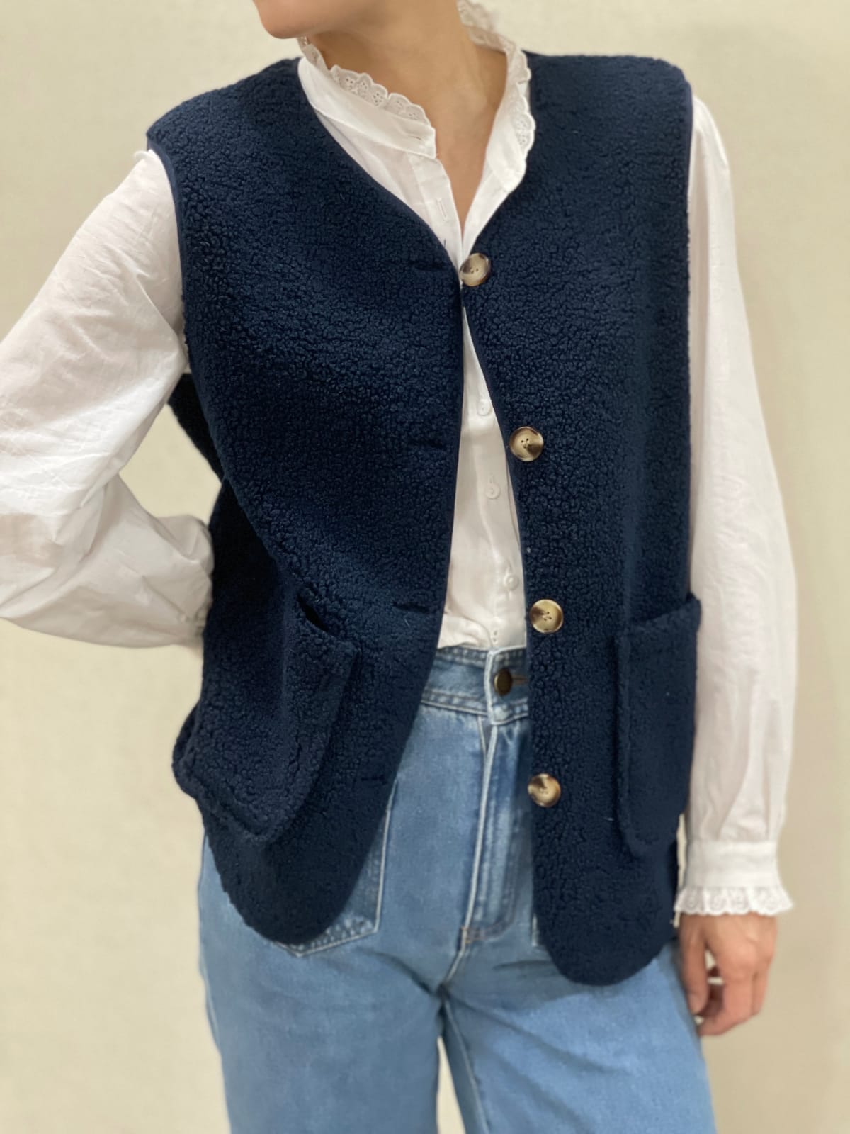 Chaleco borreguillo azul marino Uri de punto que simula borreguillo, con ribete a lo largo de los bordes, dos bolsillos delanteros cuadrados, botonera en marrón claro oscuro y cuello redondo.