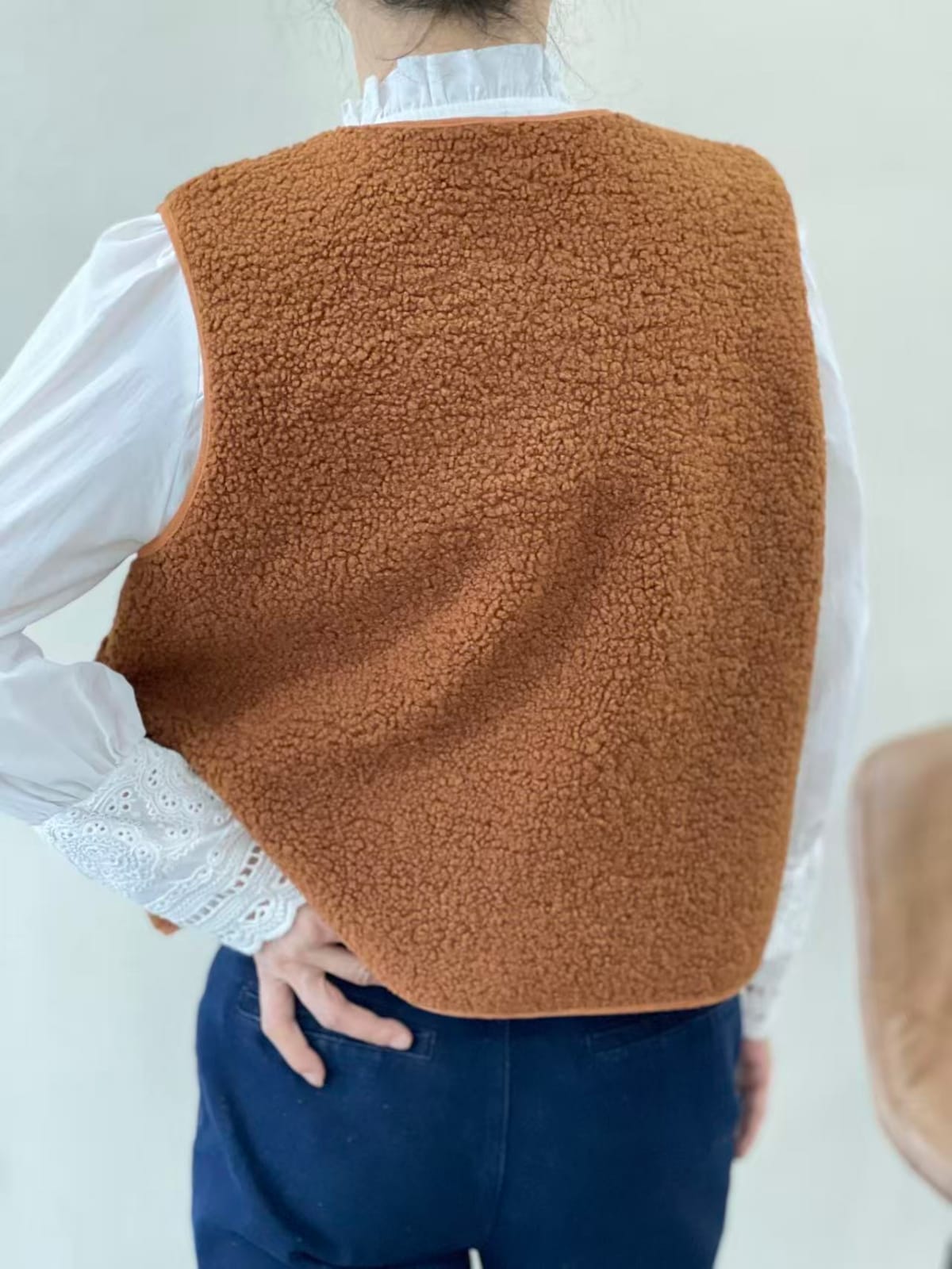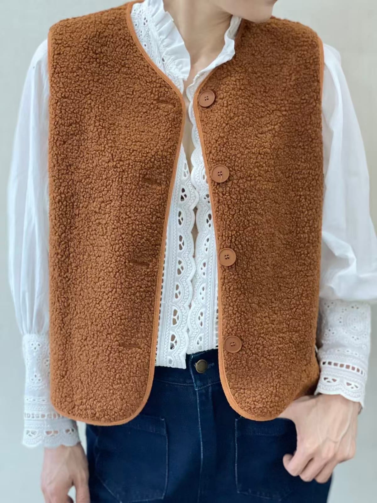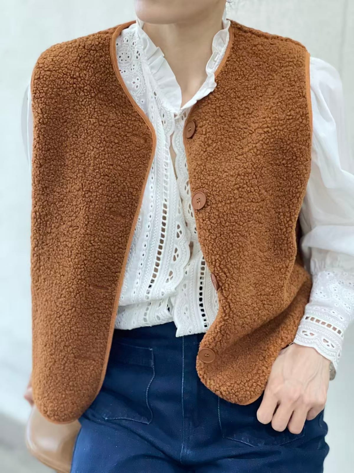Chaleco borreguillo marrón Jerome de punto que simula borreguillo, con ribete a lo largo de los bordes, botonera marrón y cuello redondo.