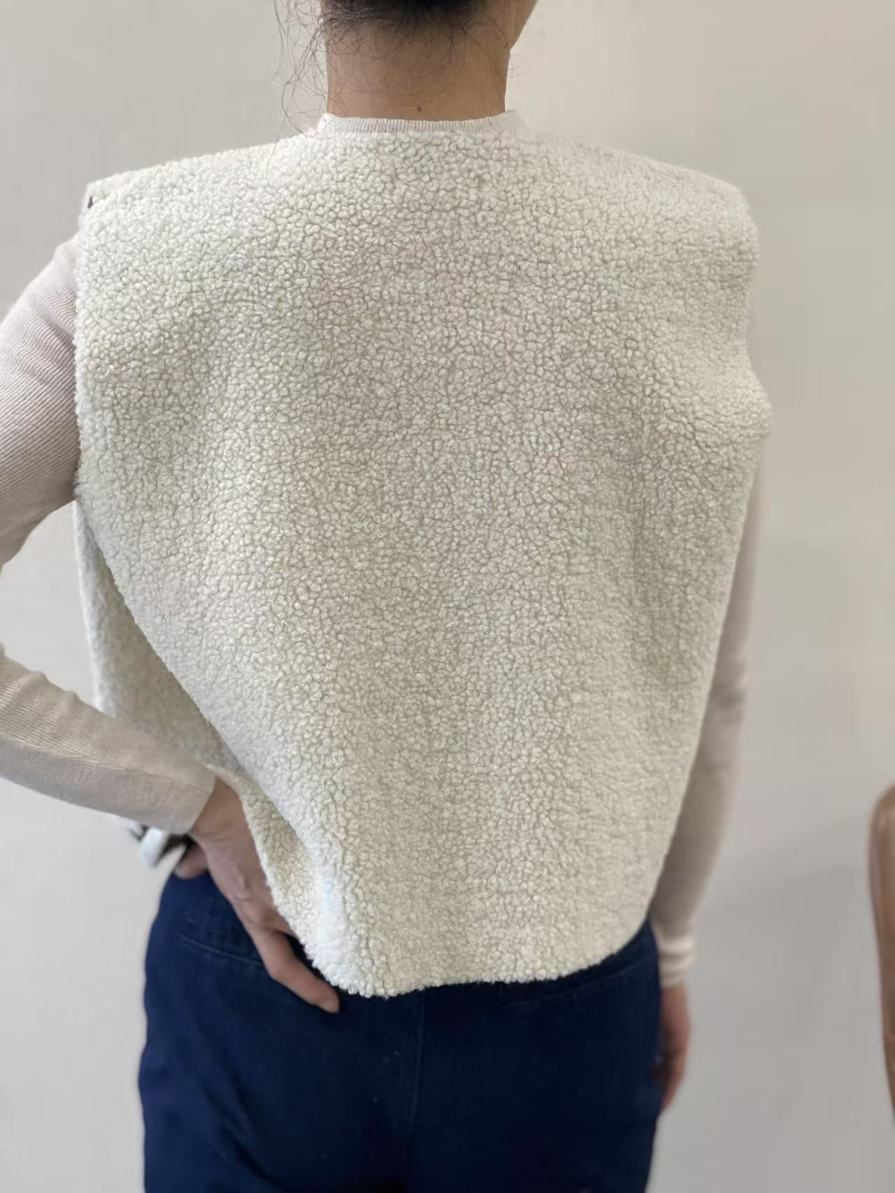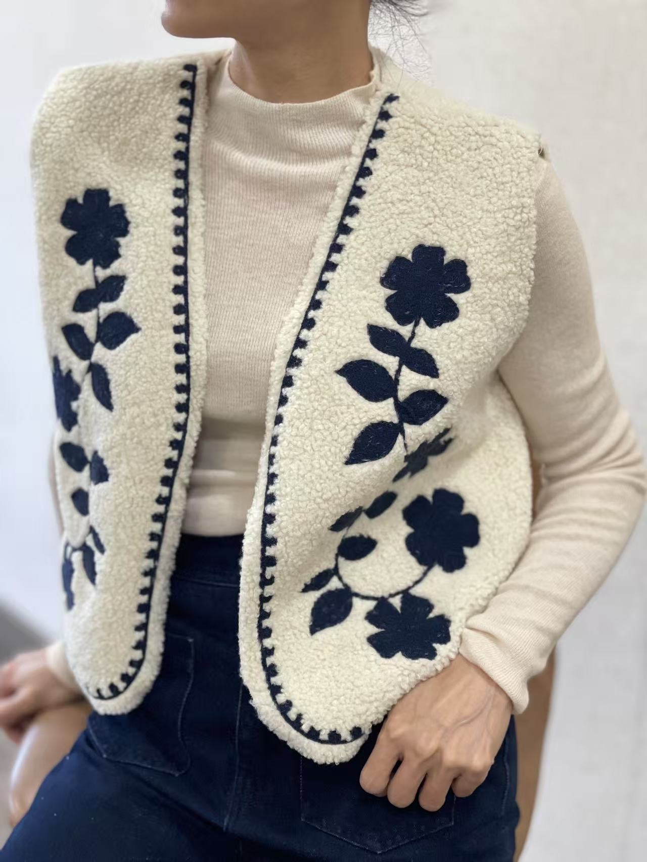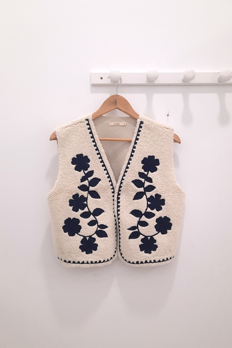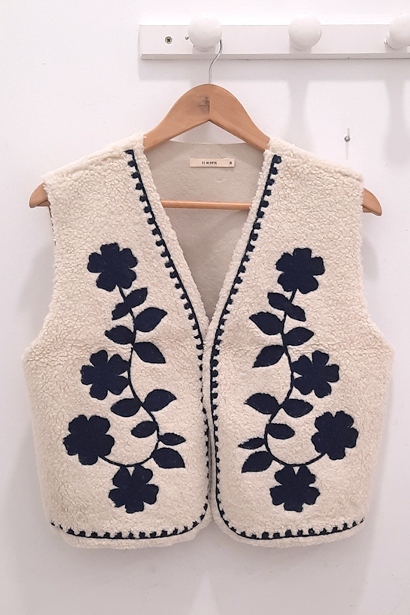 Chaleco crudo Marcel de punto que simula borreguillo, con bordado en tono azul marino de flores y de cenefa a lo largo del cuello en pico. Sin botones. Parte trasera totalmente en color crudo.