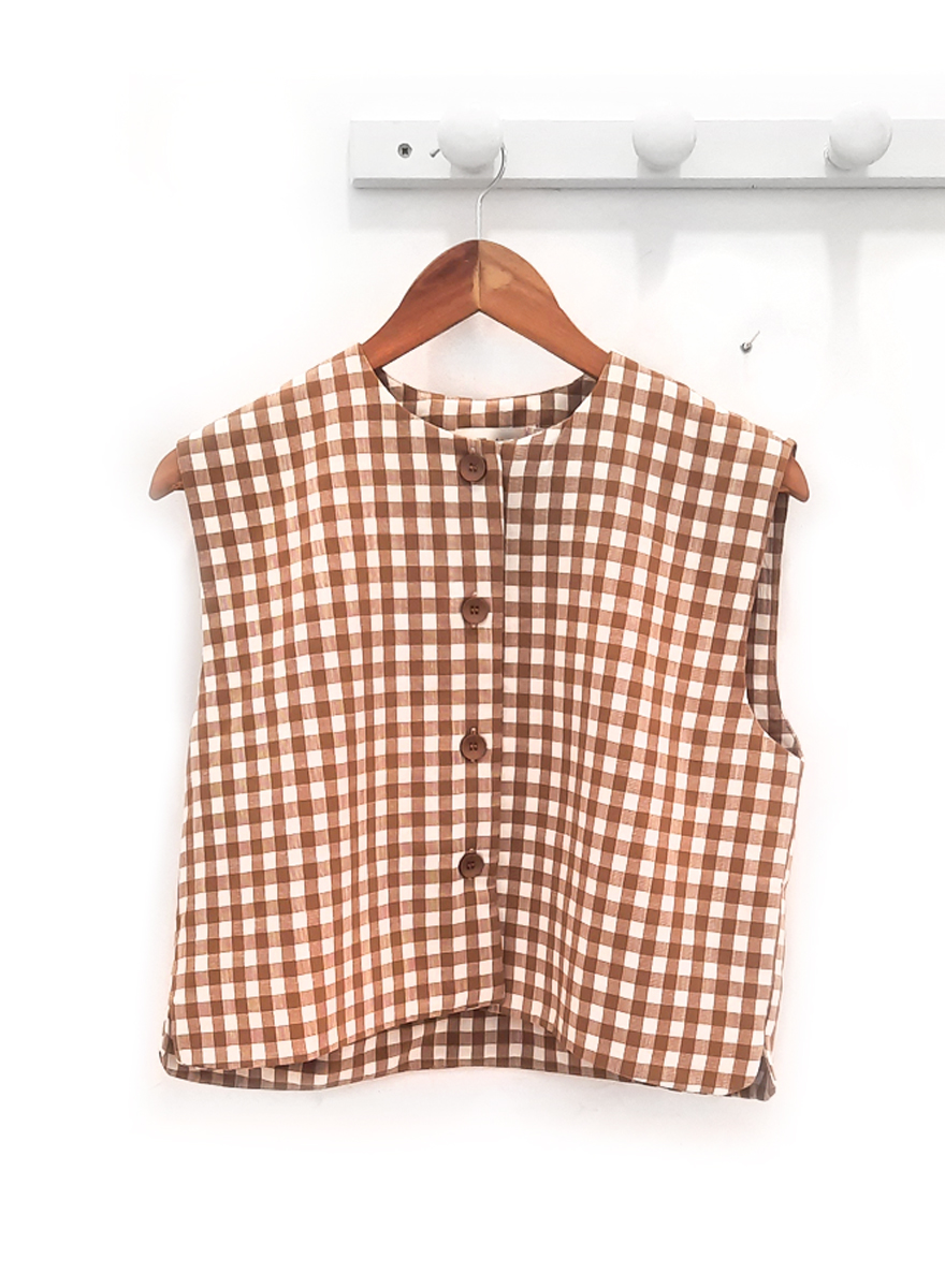 Chaleco de cuadros marrón Marc con botonera del mismo tono, cuello simple redondo y pequeñas aberturas laterales en la parte inferior. Composición: 60% algodón y 40% tencel.