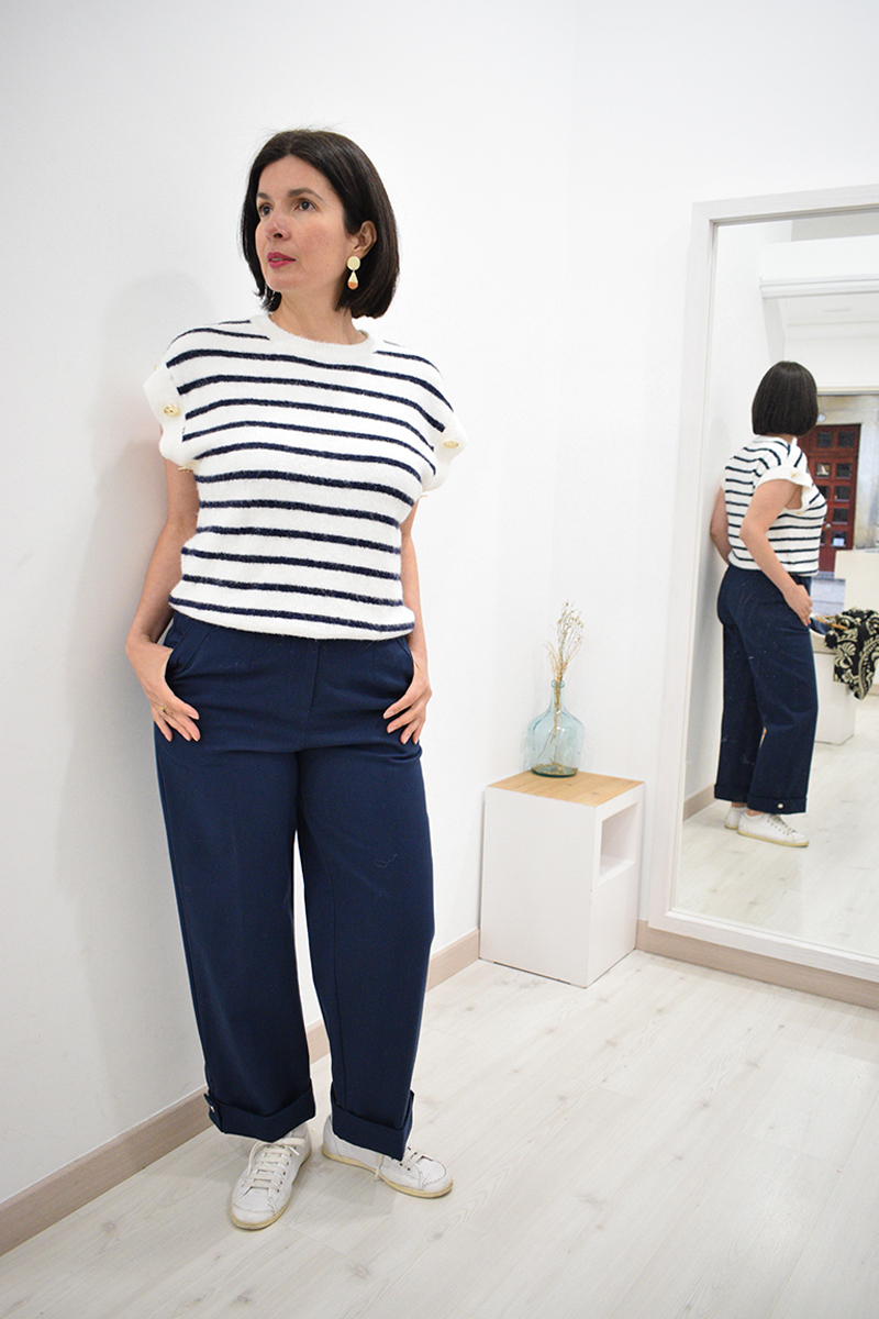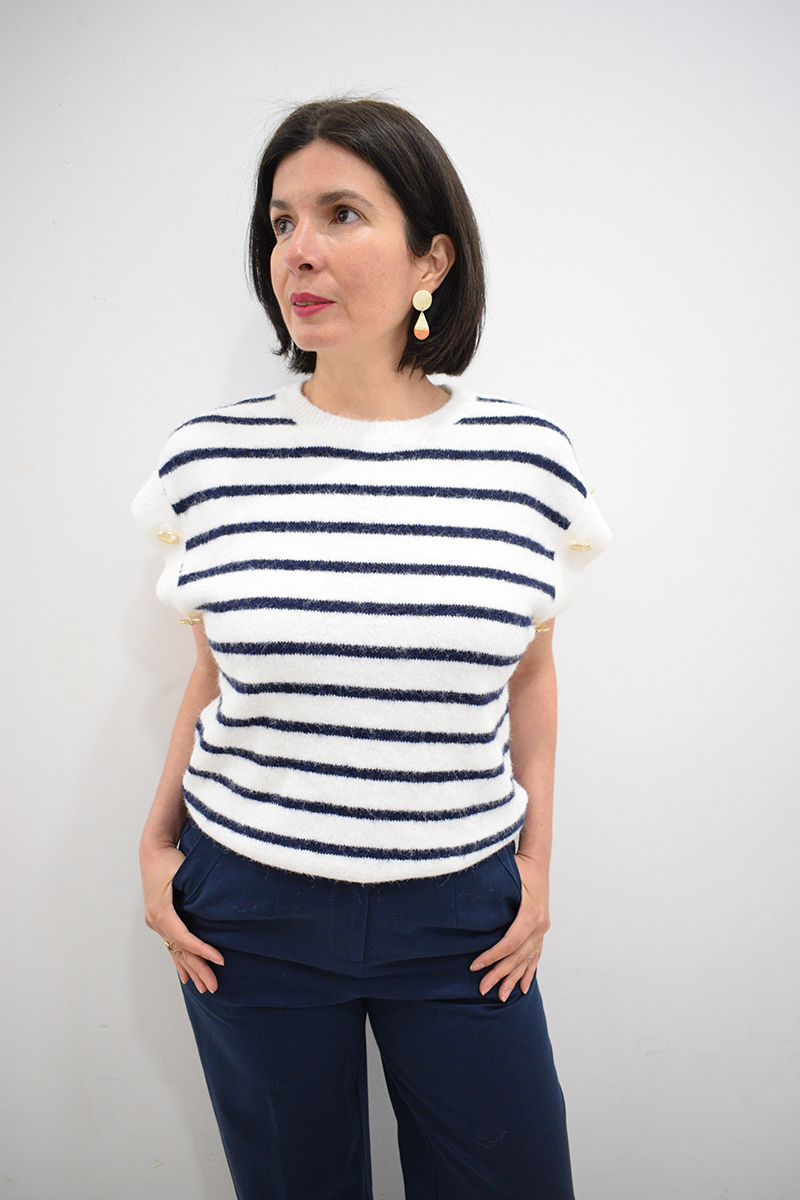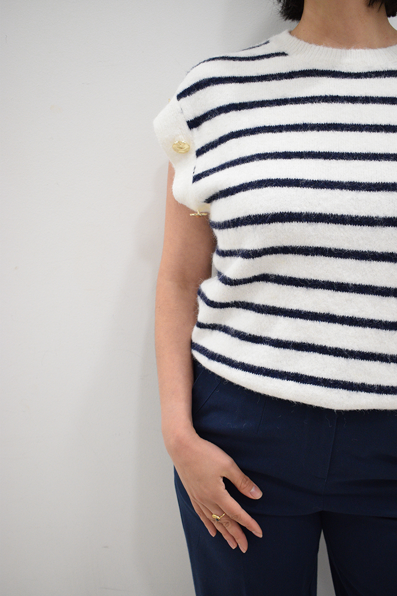 Chaleco de rayas azul marino y blanco Geraldine de punto, con botones dorados de hombros a sisas, cuello redondo y bajo elásticos. Rayas también por detrás de la prenda. Composición: 56% poliéster, 22% poliamida, 15% acrílico, 5% lana y 2% elastano.