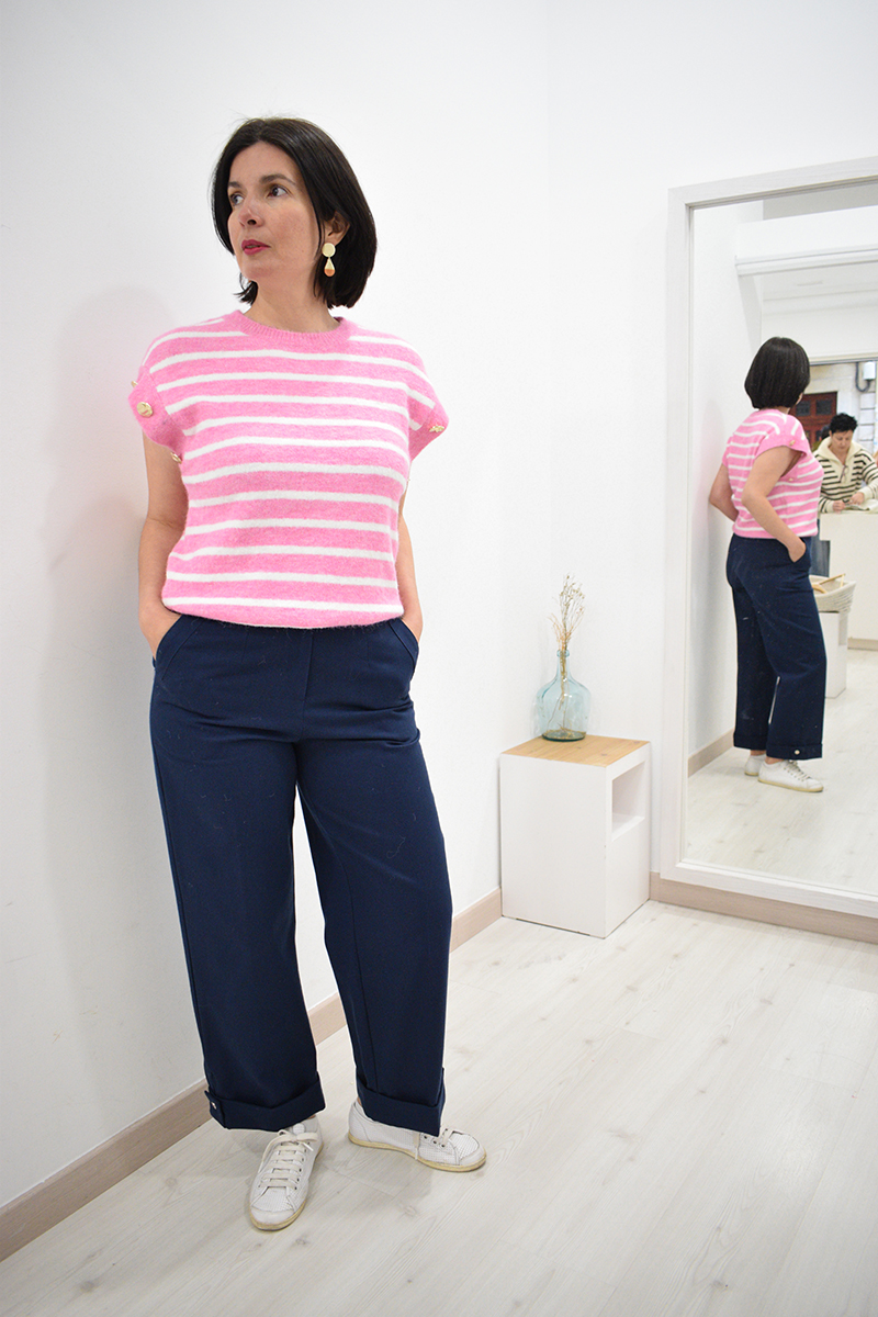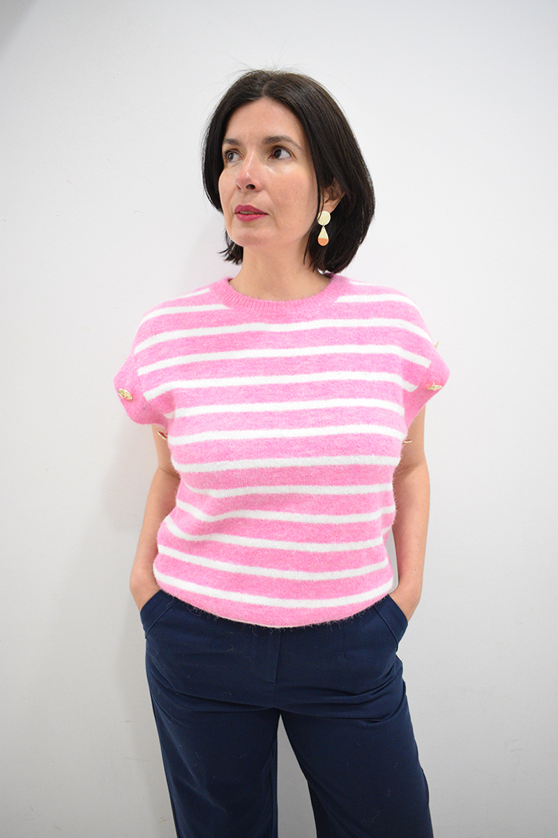 Chaleco de rayas rosa y blanco Geraldine de punto, con botones dorados de hombros a sisas, cuello redondo y bajo elásticos. Rayas también por detrás de la prenda. Composición: 56% poliéster, 22% poliamida, 15% acrílico, 5% lana y 2% elastano.