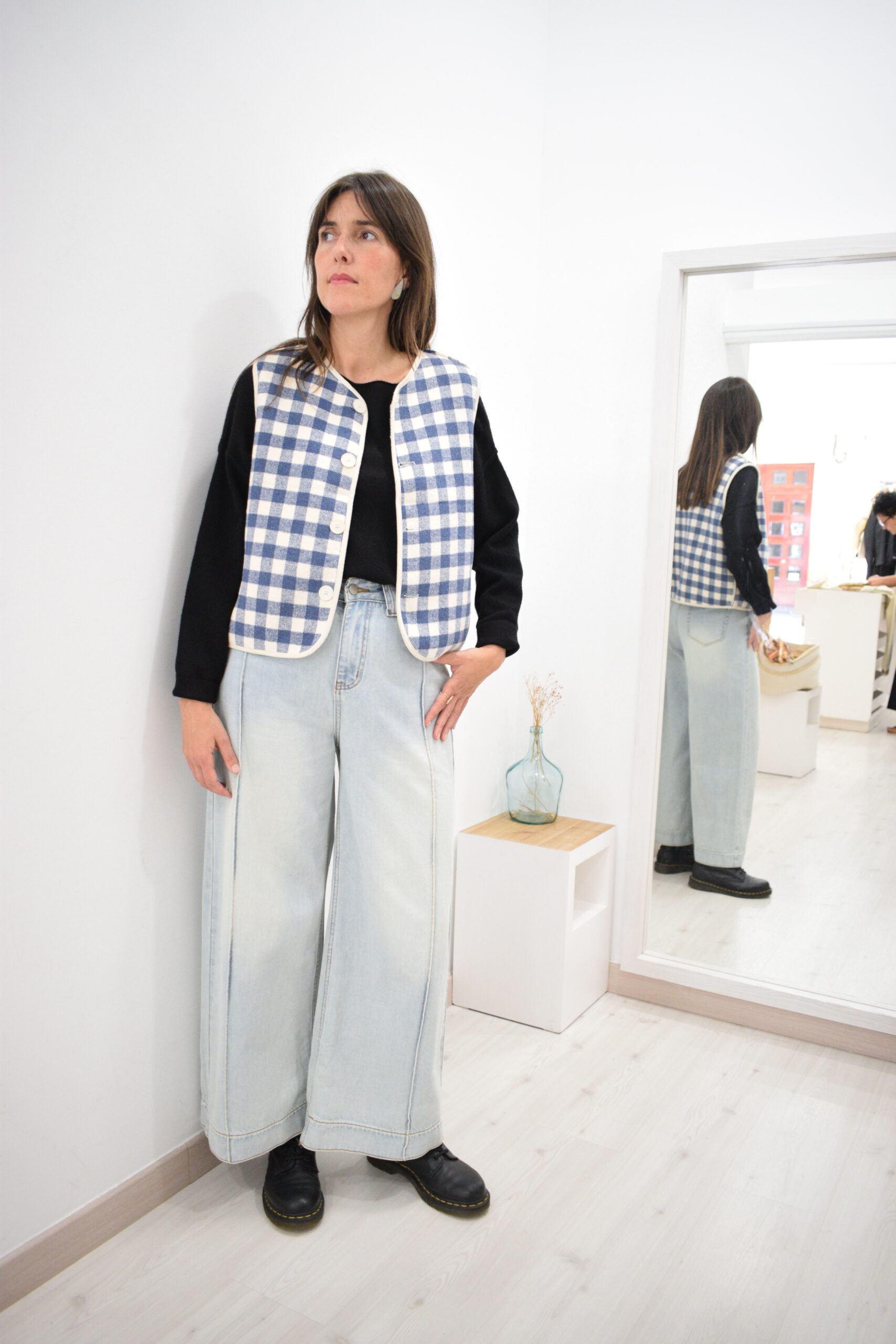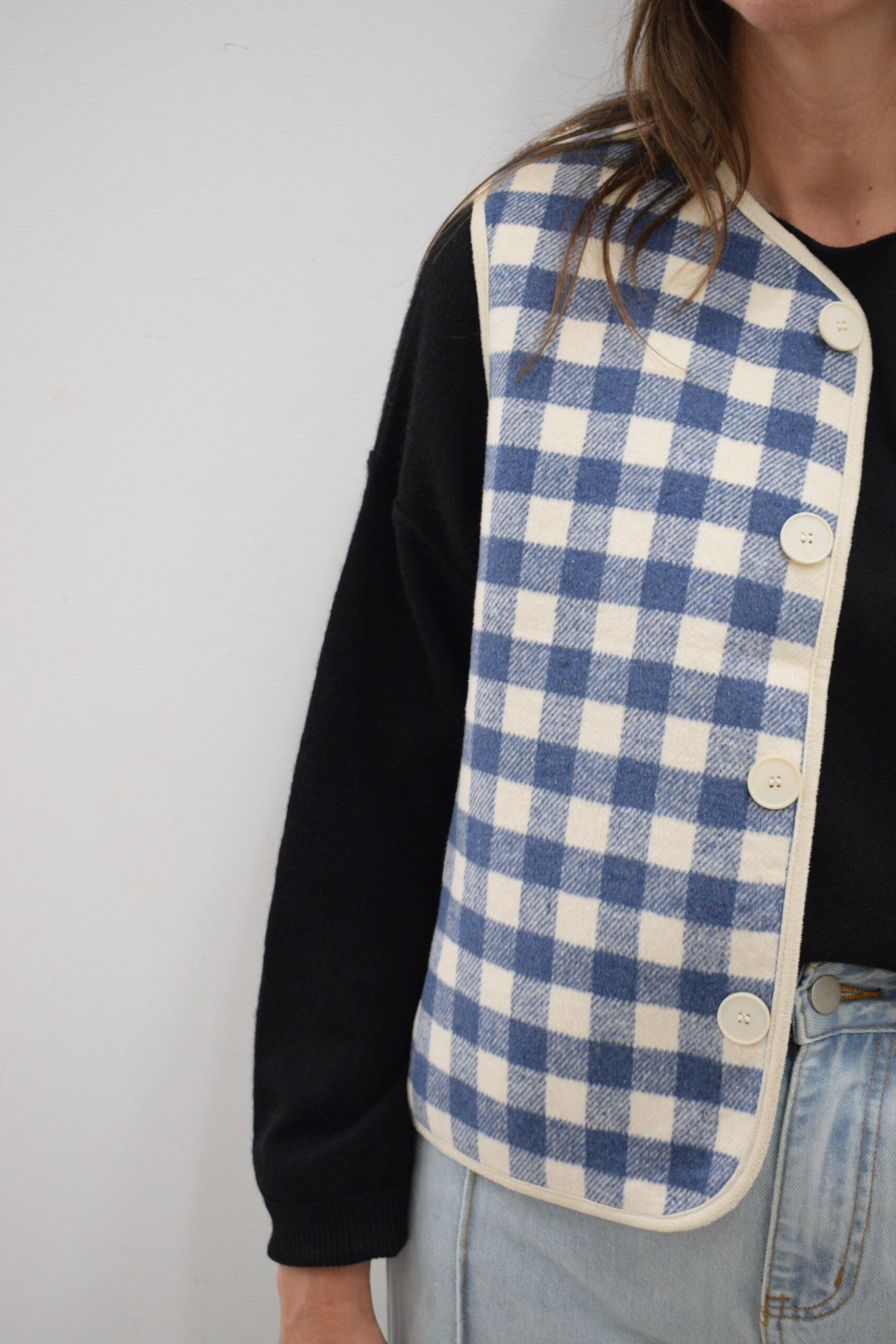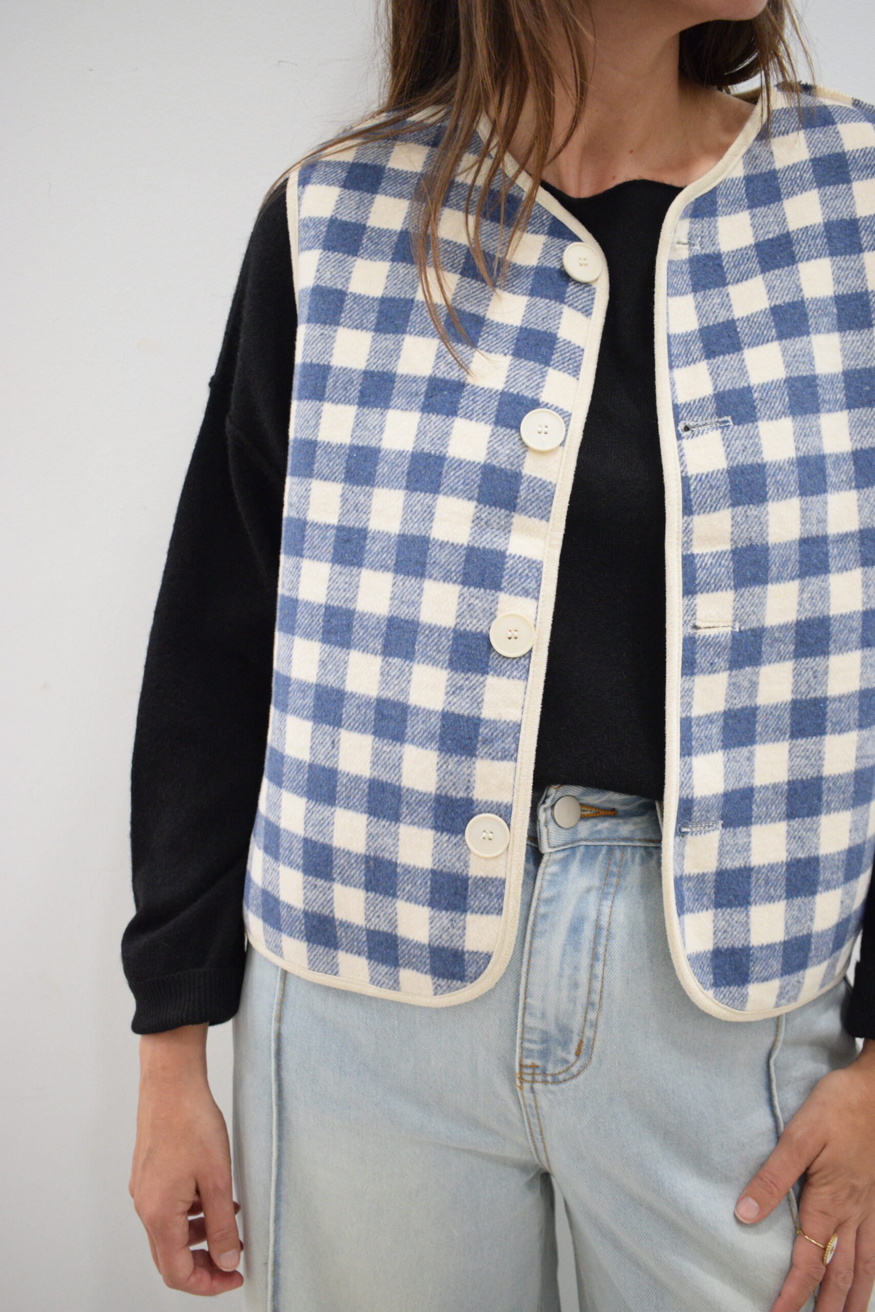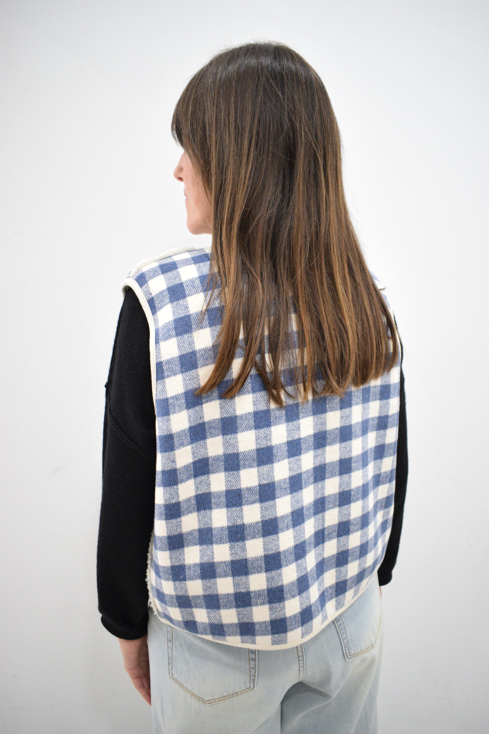 Chaleco de cuadros en azul, azul claro y crudo con botones forrados del mismo tejido. Interior en punto que simula borreguillo en color crudo, cuello redondo y ribeteado en crudo a lo largo de mangas, cuello y parte inferior.